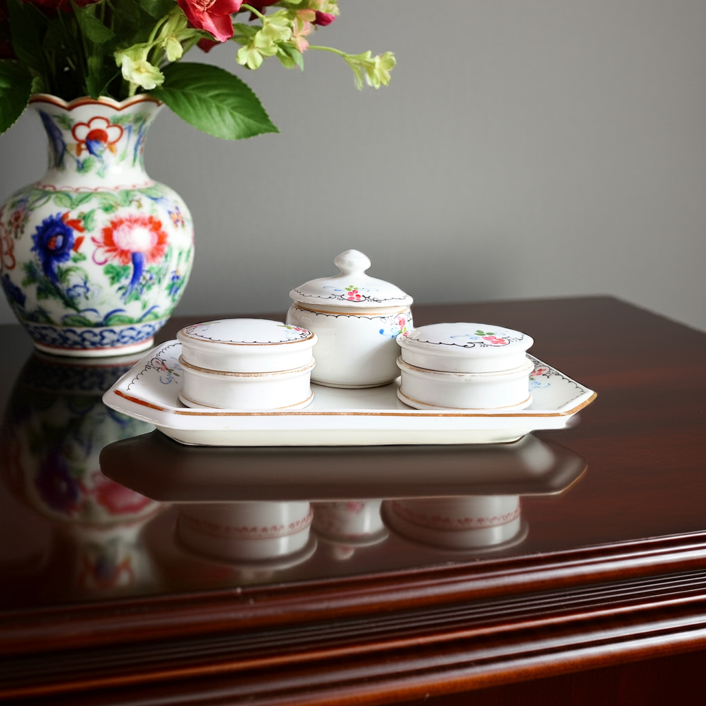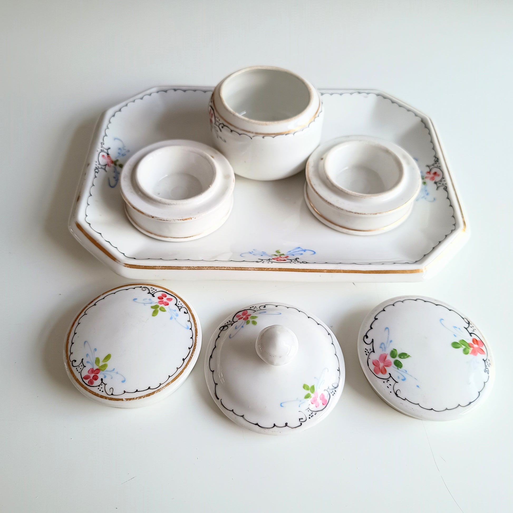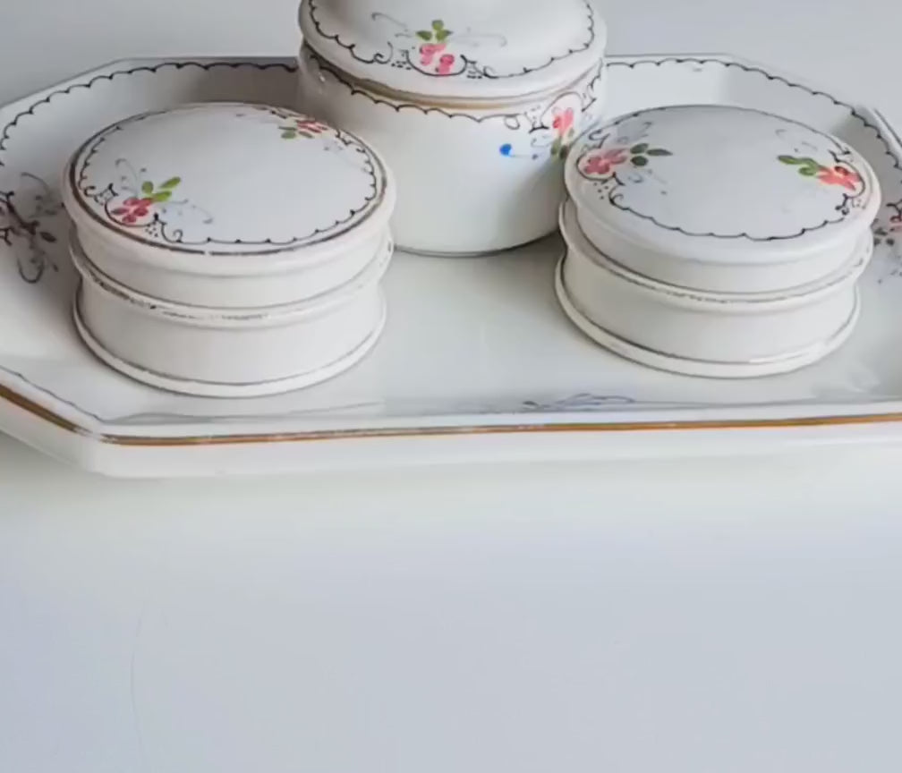 19 century French Porcelain Set of Hand-Painted Tray and 3 Lidded Pots in the Style of Limoges for Display or for Table Serving