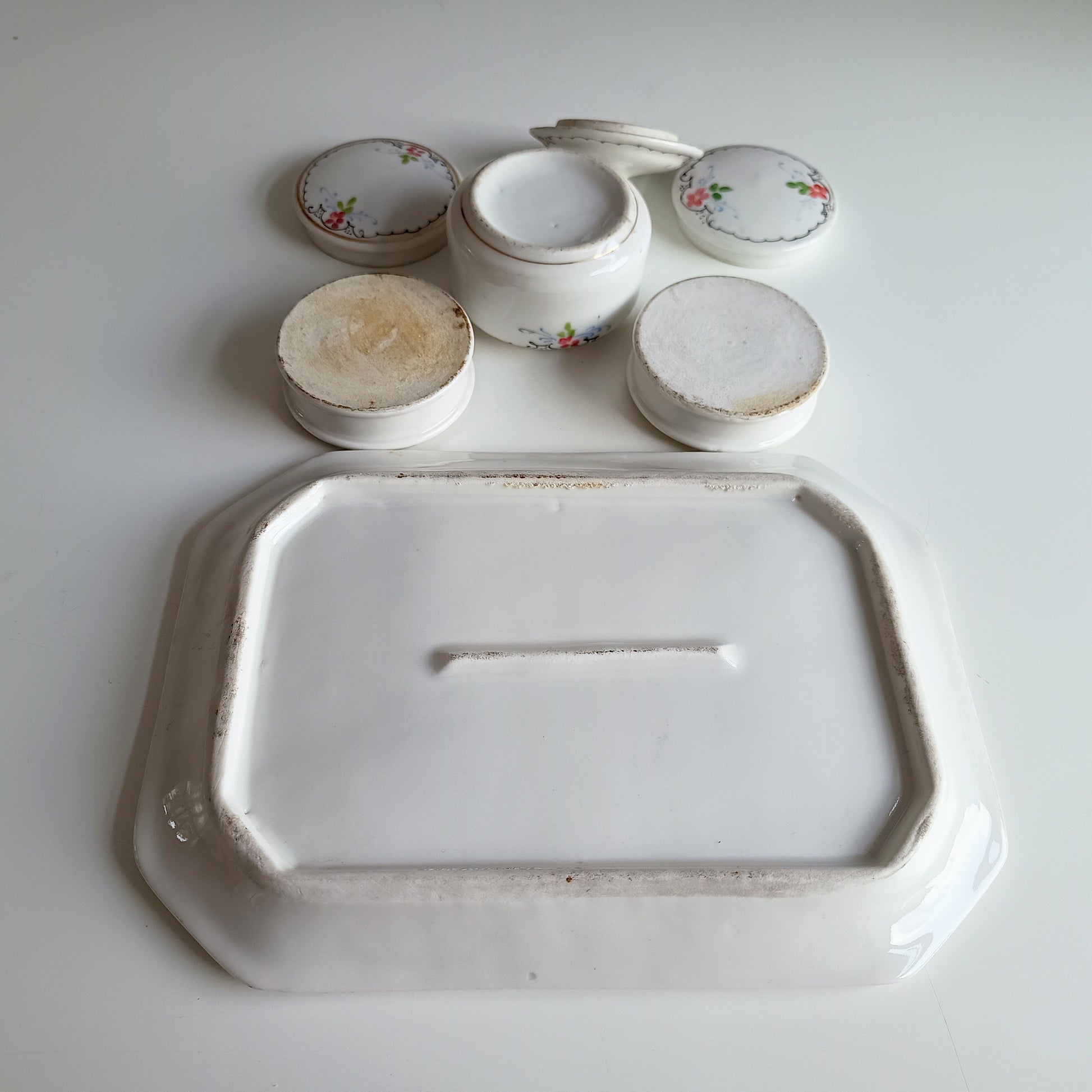19 century French Porcelain Set of Hand-Painted Tray and 3 Lidded Pots in the Style of Limoges for Display or Table Serving. White 2ith beautifully pain5ed delicate scrolls and flowers.
