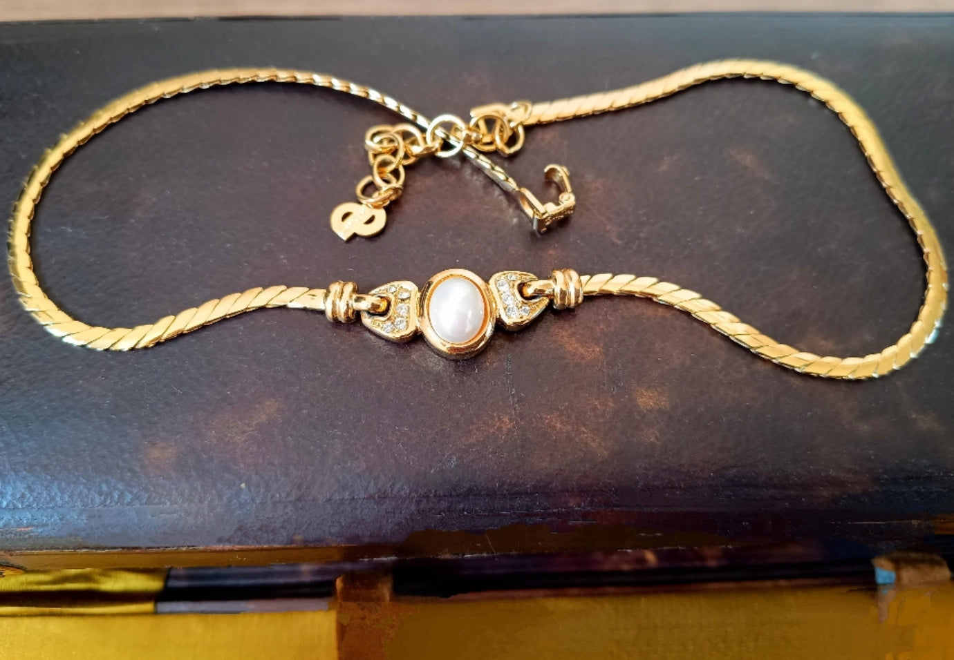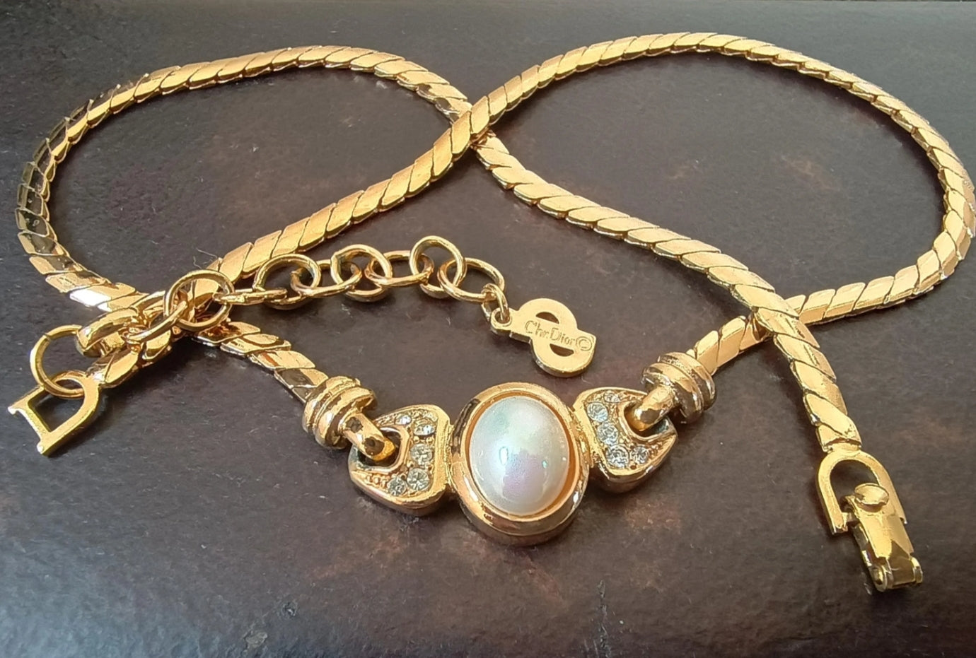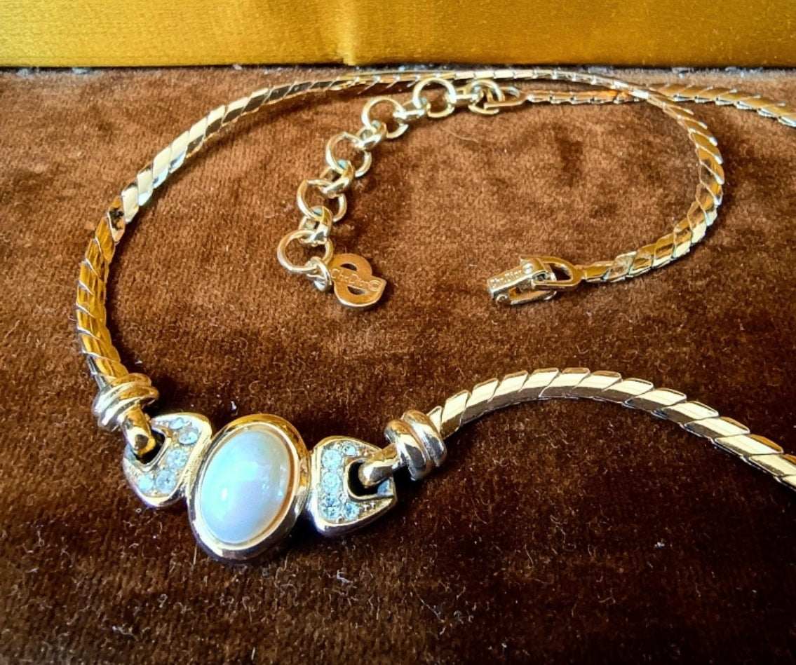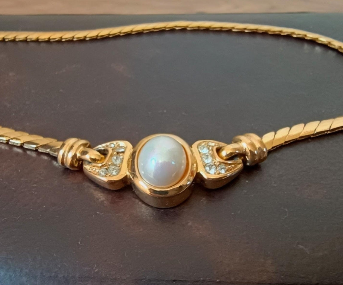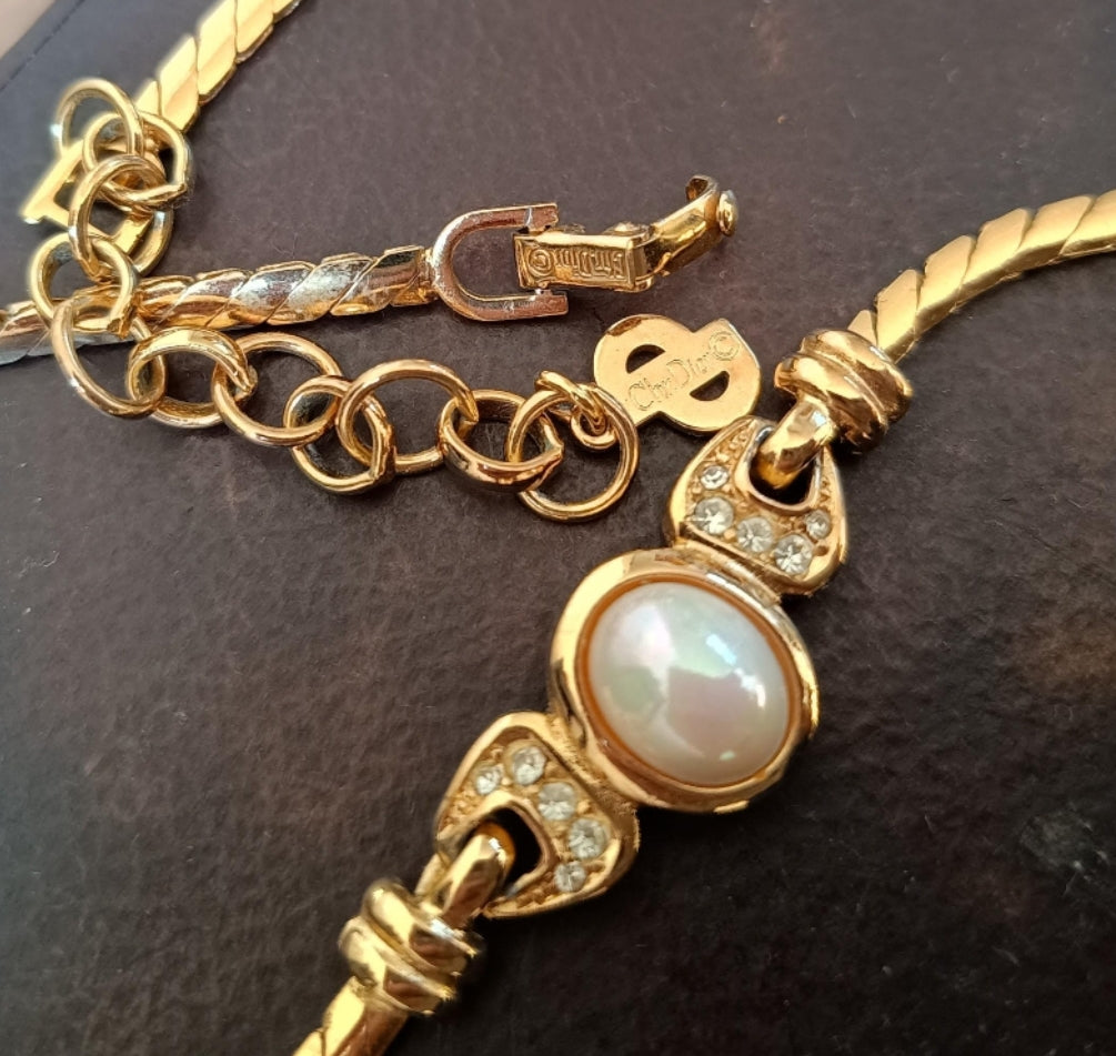 Sublime Christian Dior short gold plated necklace created in art deco style with built in faux pearl centre decorated with Swarovski crystals' lozenges on both sides. The tone of the gold plating on metal and on the snake chain is nice yellow.