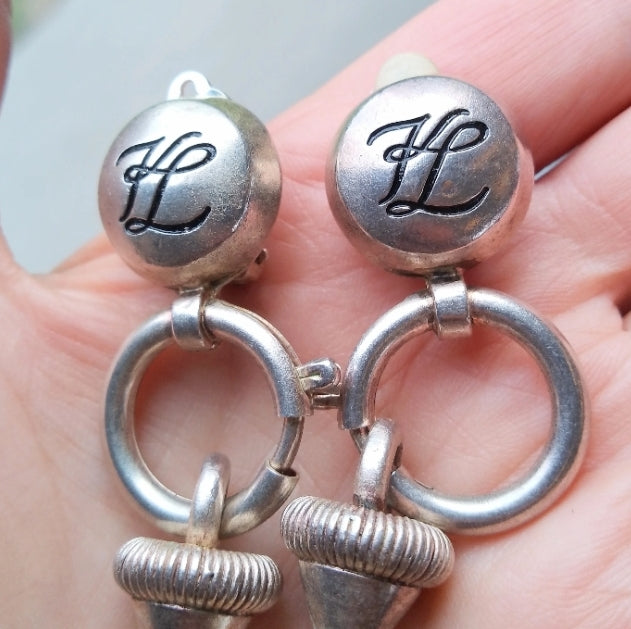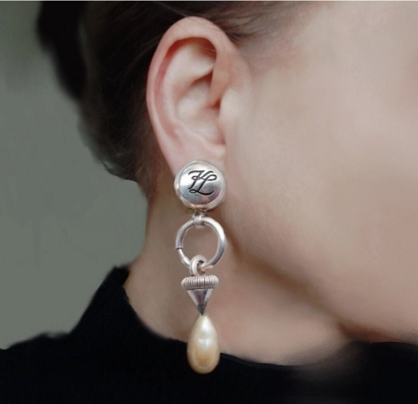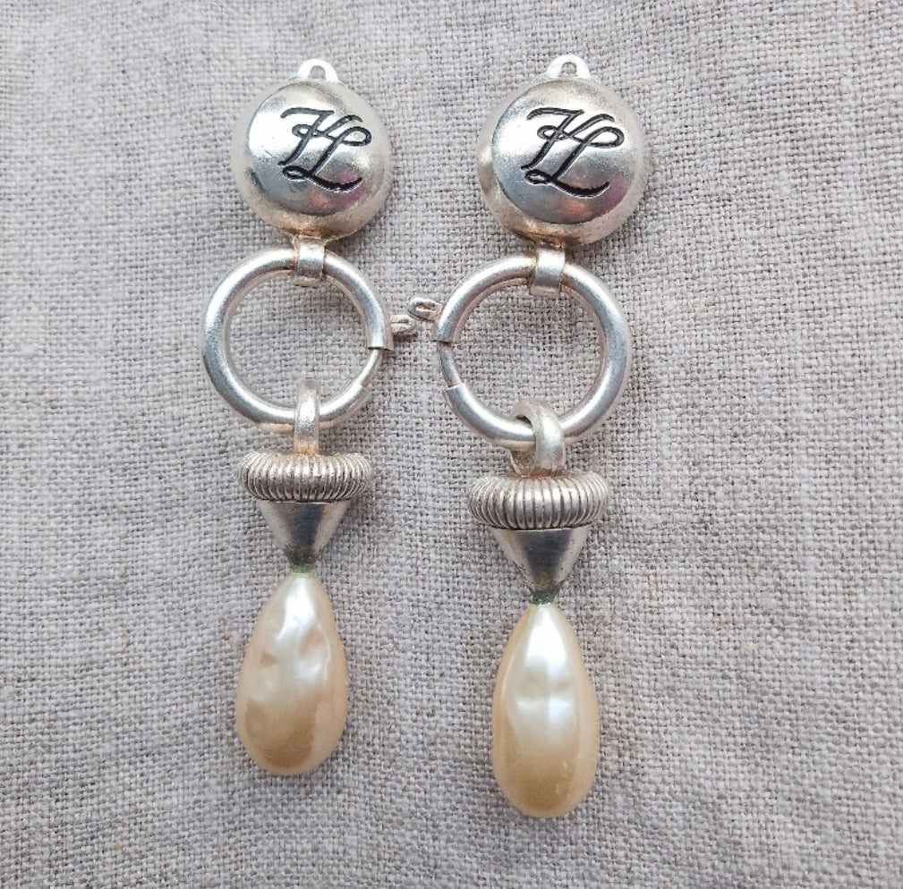 A spectacular and exceptionally rare pair of vintage Karl Lagerfeld couture earrings, designed in the late 1980s for one of Lagerfeld’s exclusive runway collections. These oversized clip-on dangle earrings are a bold fusion of baroque opulence and industrial modernism, true to Lagerfeld’s signature aesthetic during his Chanel era.