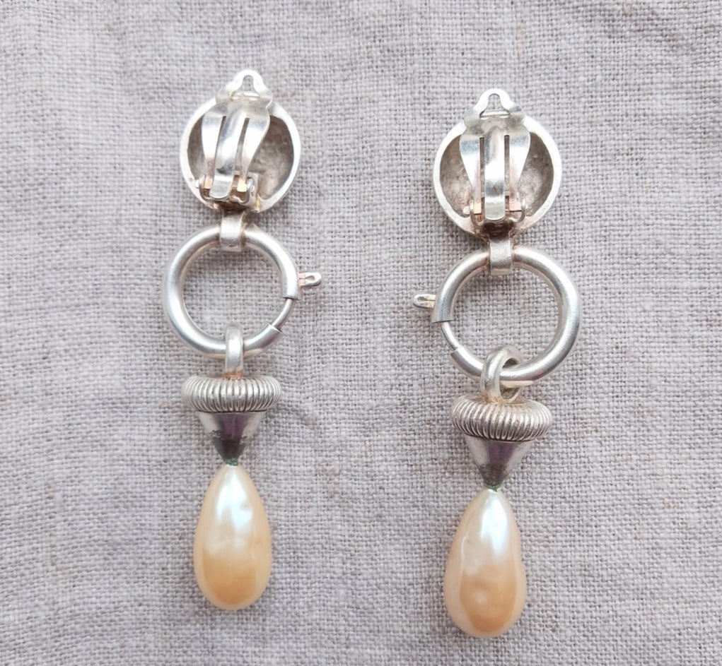 These earrings are in very good vintage condition, with light patina on the back of the button and some silver oxidation at the junction with the pearl — consistent with age and adding authentic character.