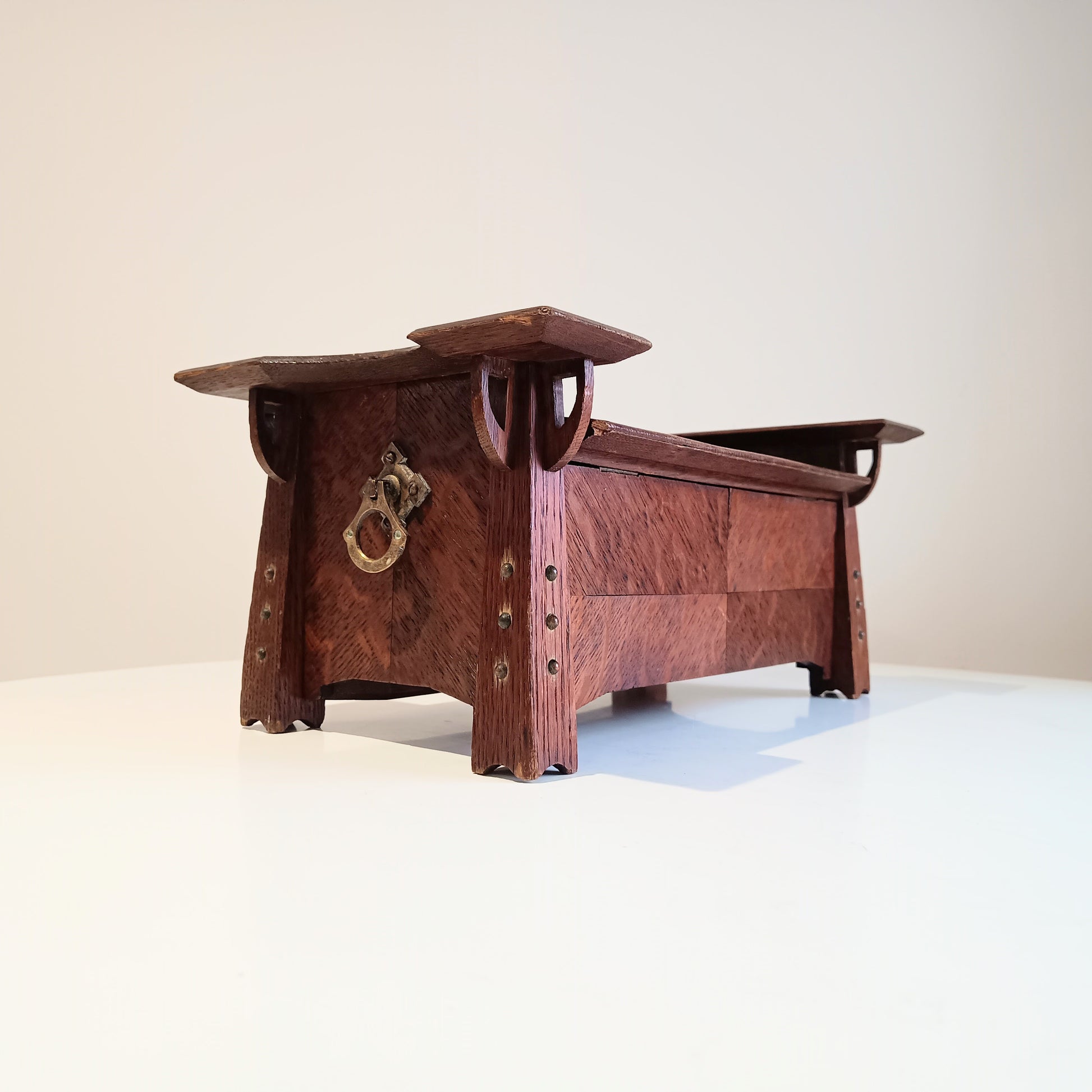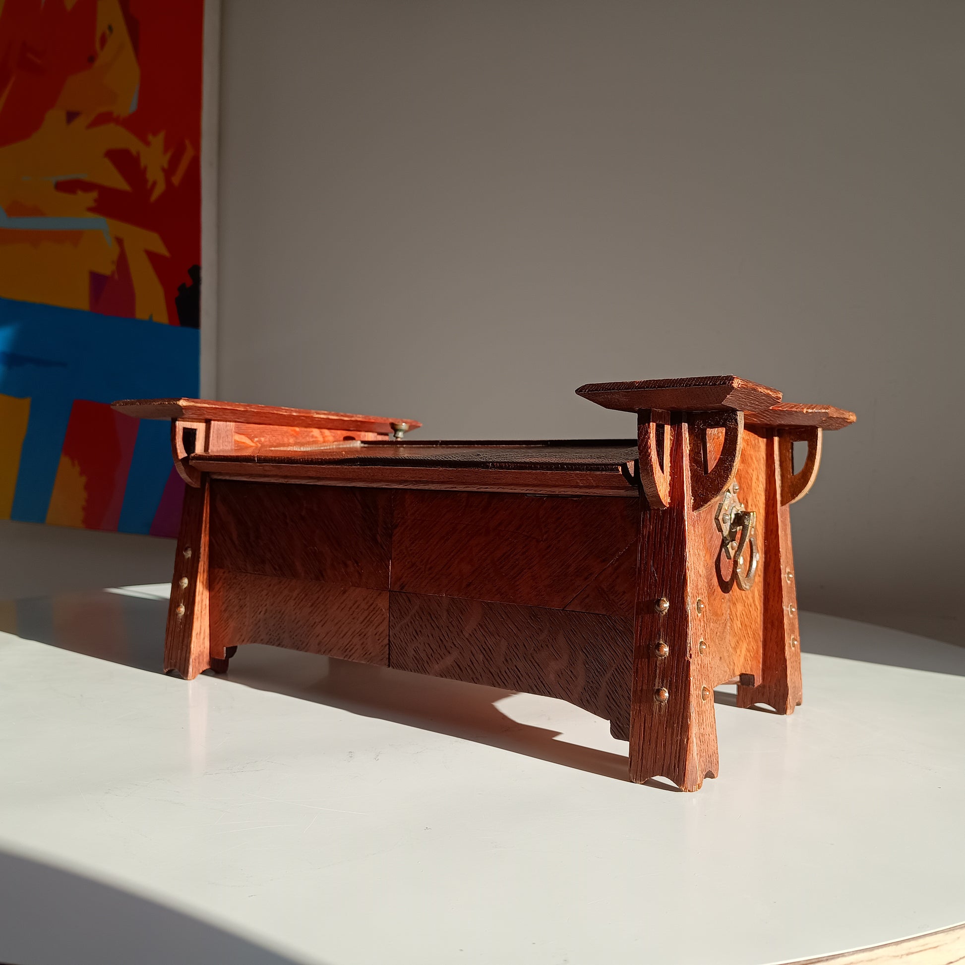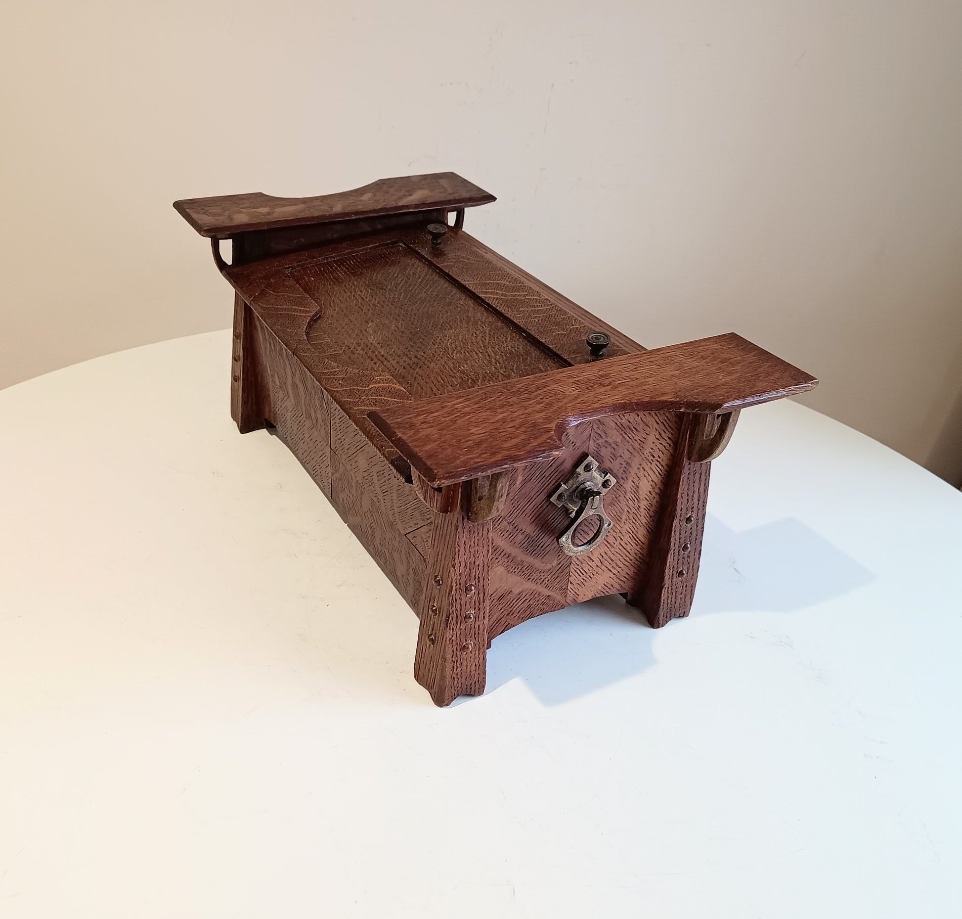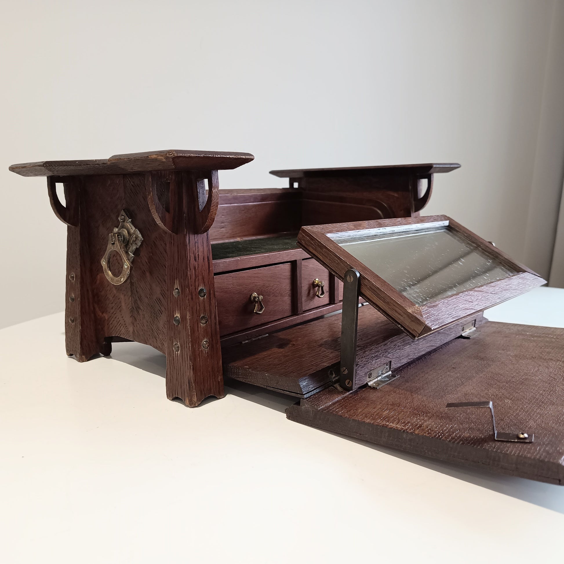 A small-scale, well-crafted Arts & Crafts writing box later adapted as a grooming cabinet, with notable features including pierced fretwork, riveted construction, and Mission-style handles. Suitable as a functional cabinet or compact drinks station.