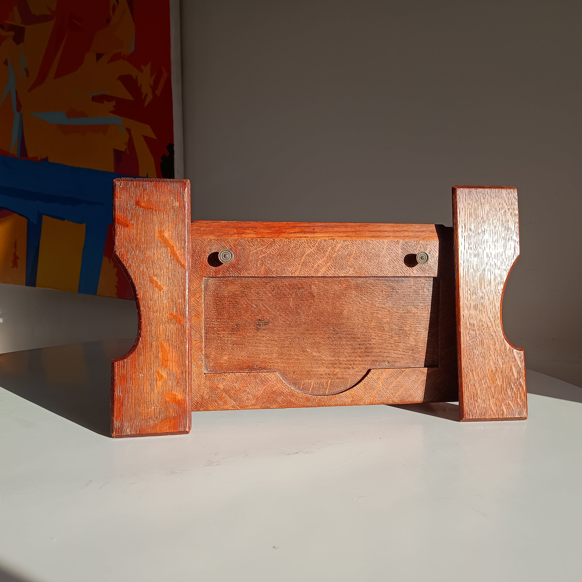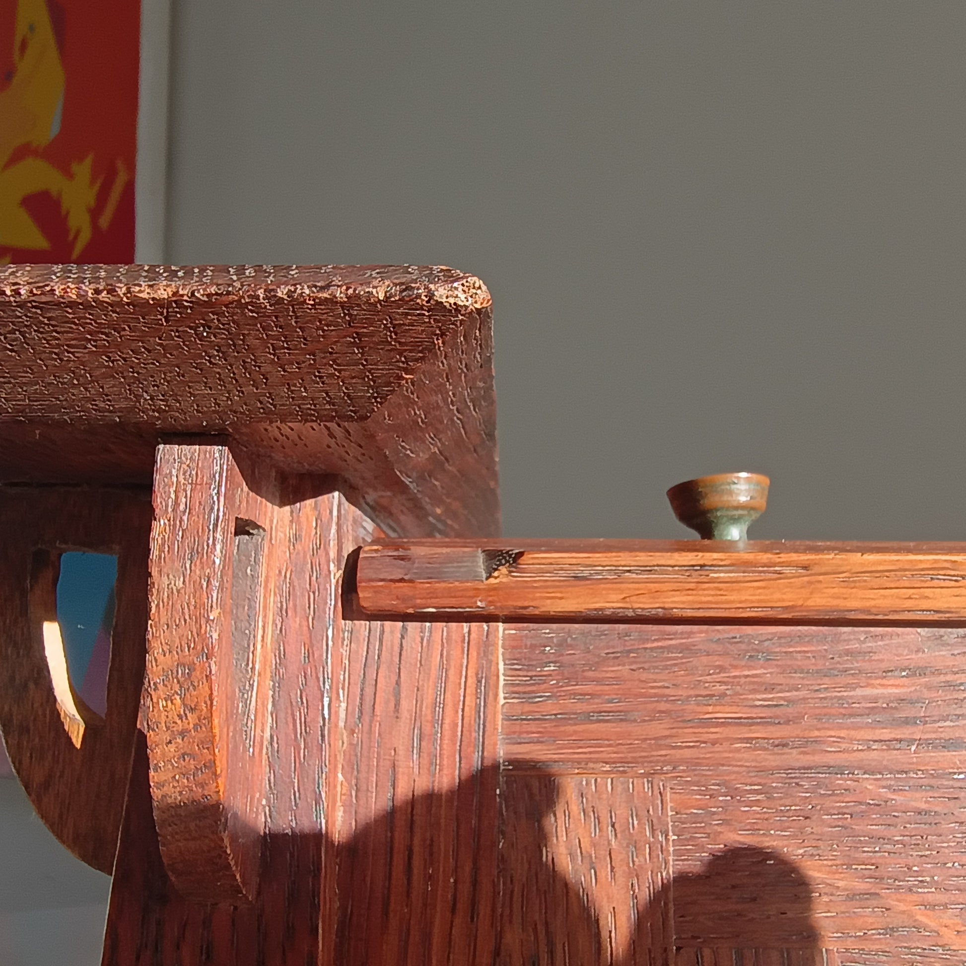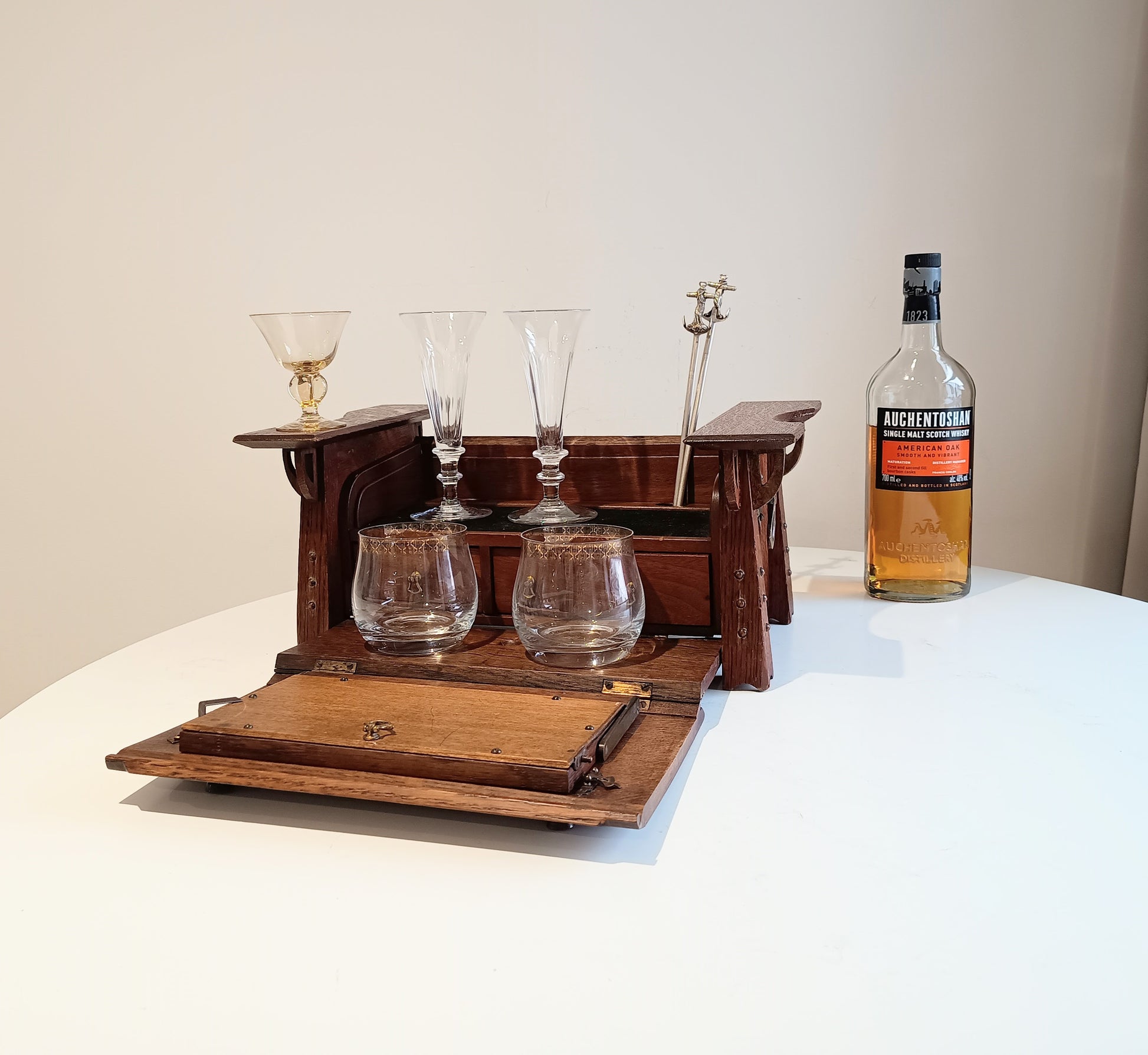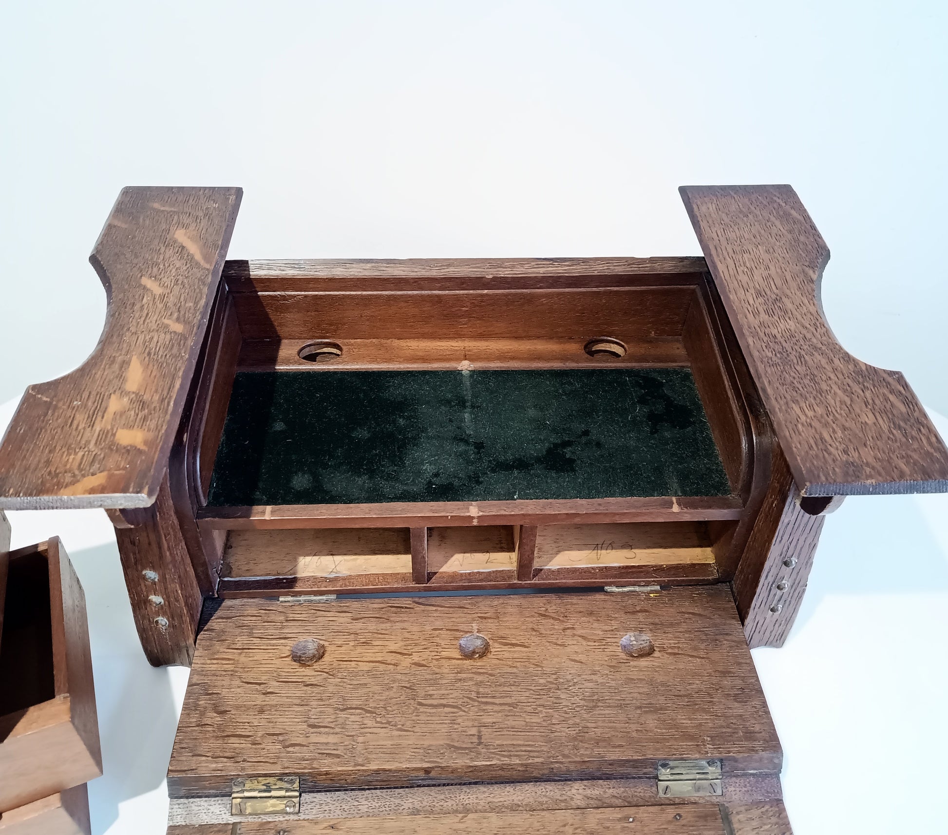 A small-scale, well-crafted Arts & Crafts writing box later adapted as a grooming cabinet, with notable features including pierced fretwork, riveted construction, and Mission-style handles. Suitable as a functional cabinet or compact drinks station.