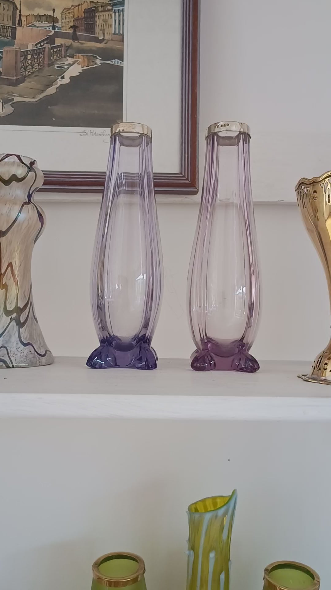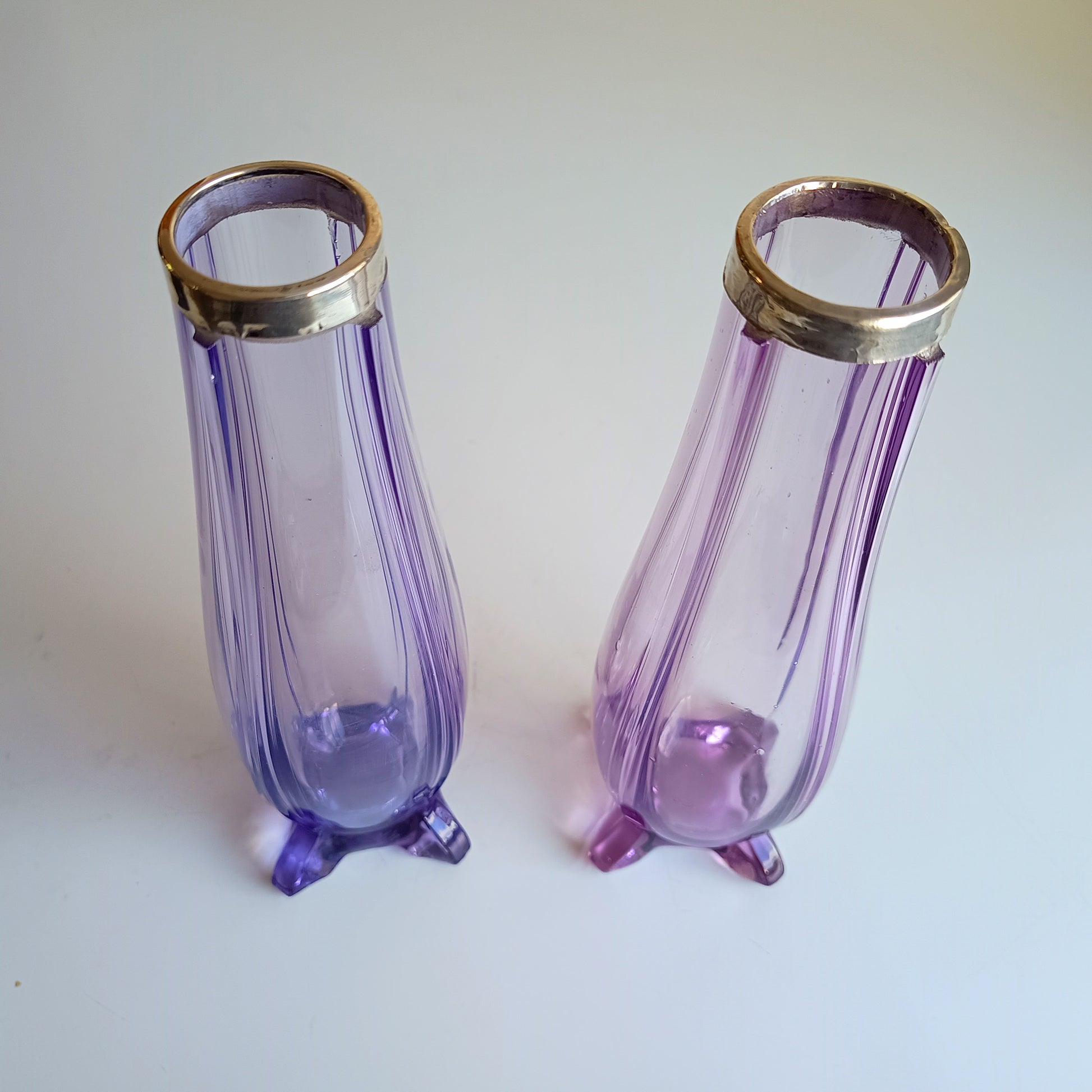 Antique Pair of Bohemia Export Amethyst Purple Glass Vases, London Hallmarked to David Loebl, Schindler, Sterling Silver Collars 1920s