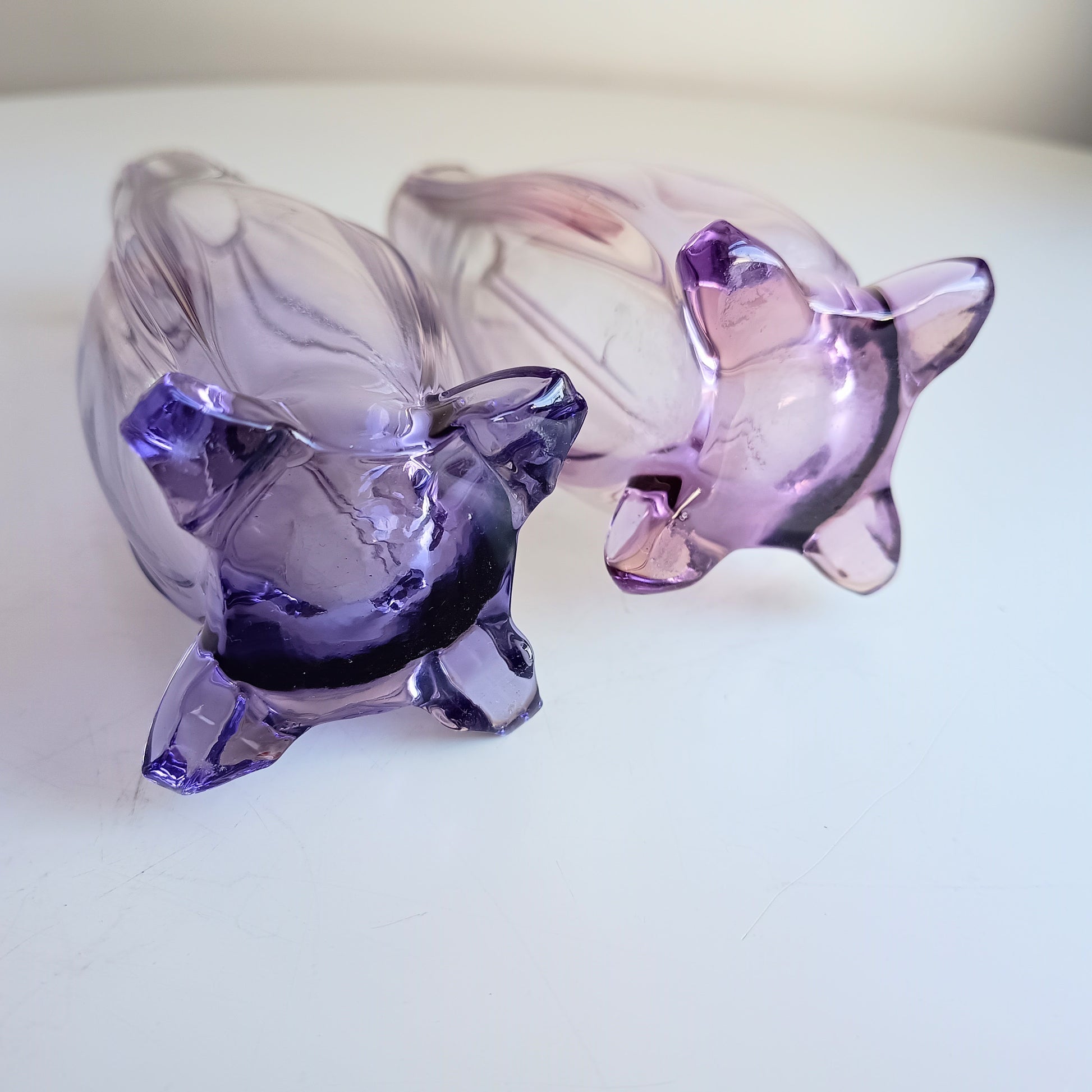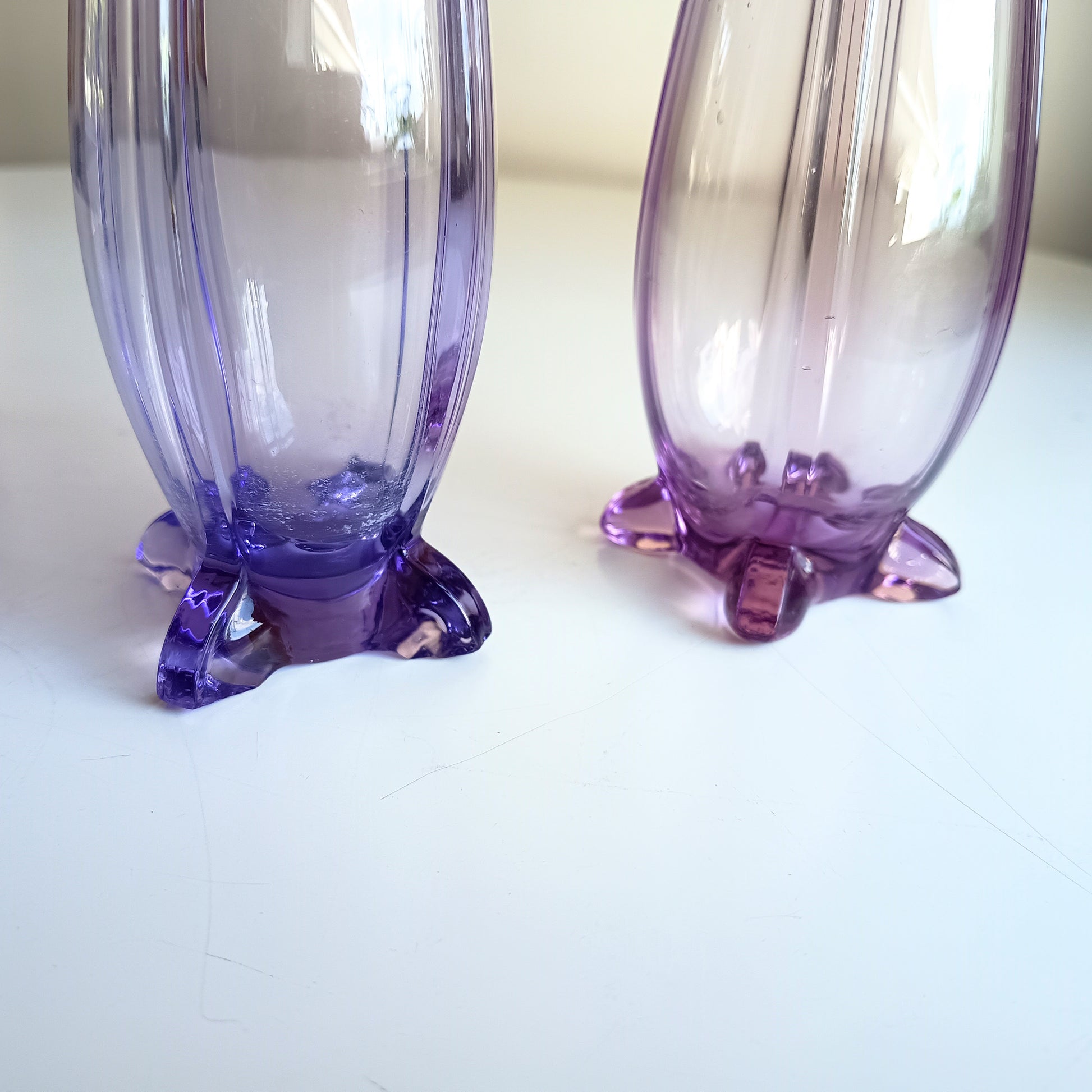 This exquisite pair of 8″ vintage vases feature a luxurious amethyst-purple glass body, hand‑blown in the renowned Bohemia Art Glass tradition. Mold-blown with ridge patterns on all four corners, the vase graduates from crystal clear to deep purple at the base—showcasing expert craftsmanship and elegant design. The purple tone in the vases is slightly different, most likely from aging in the sun, as it is common with amethyst glass.
