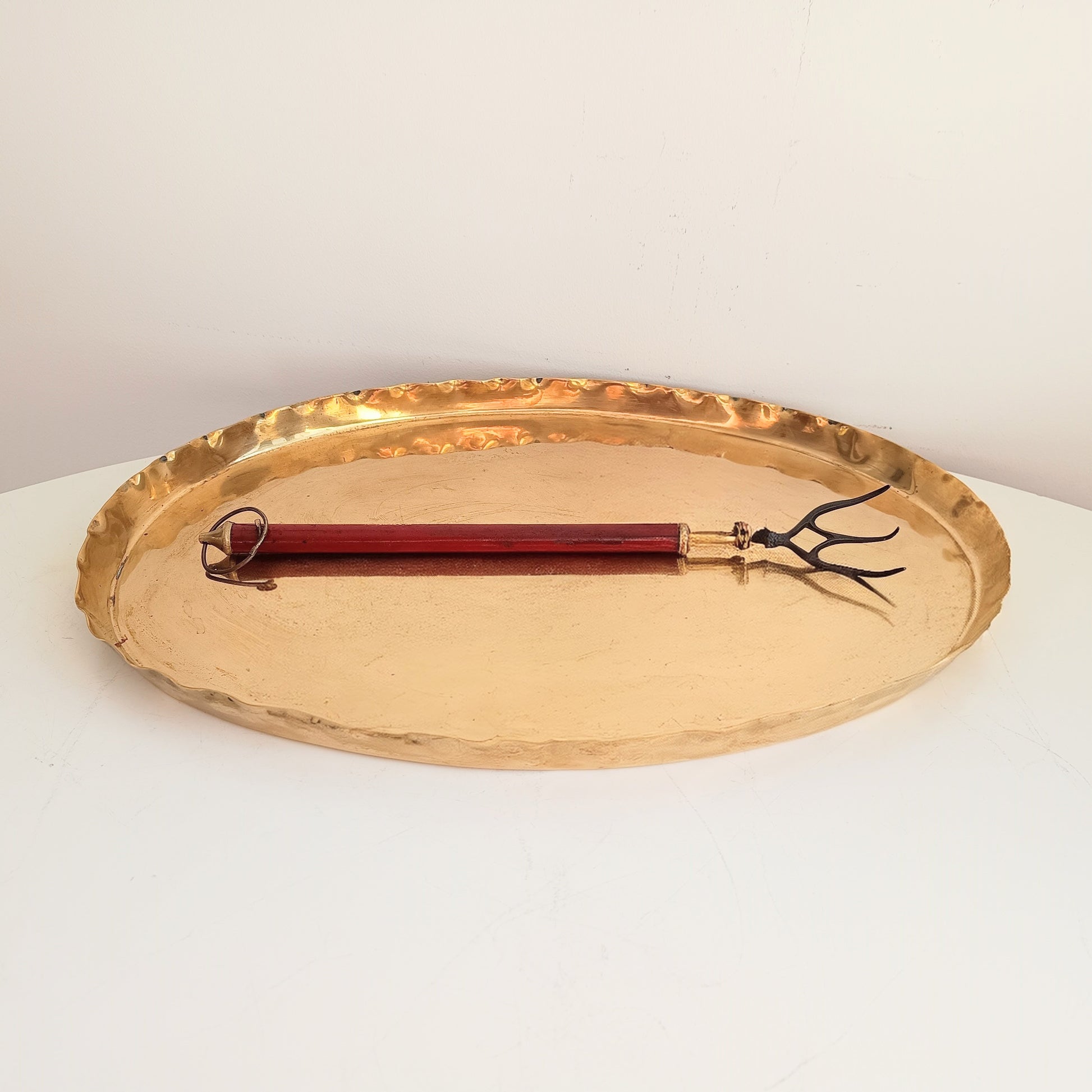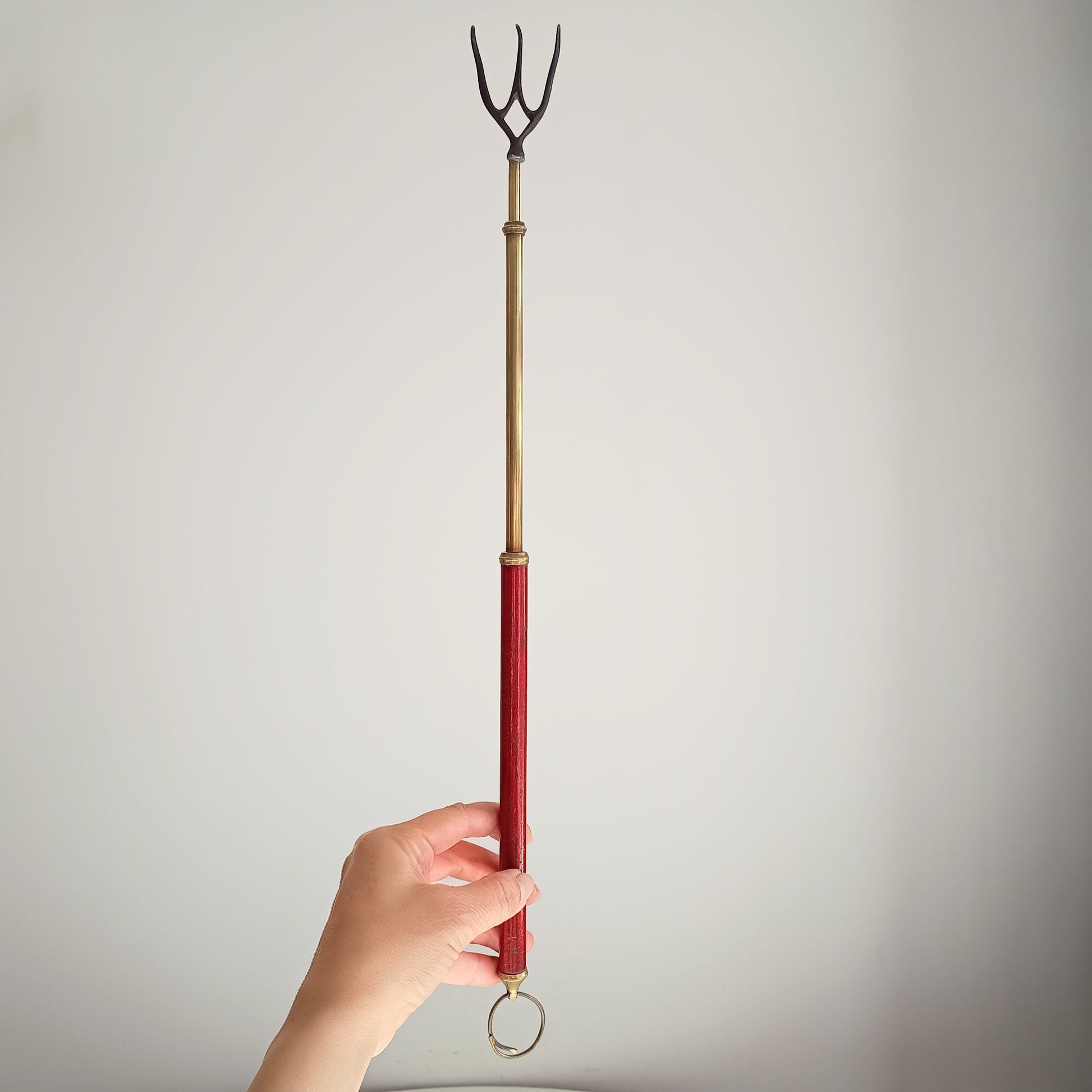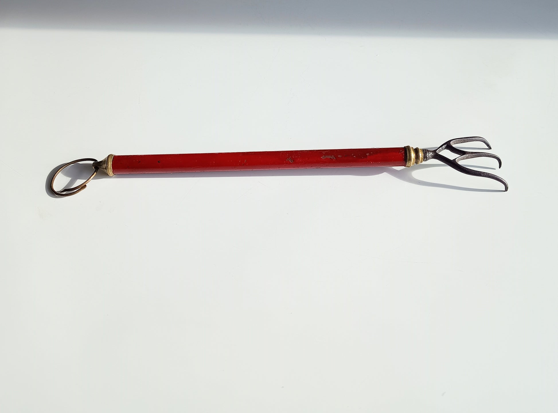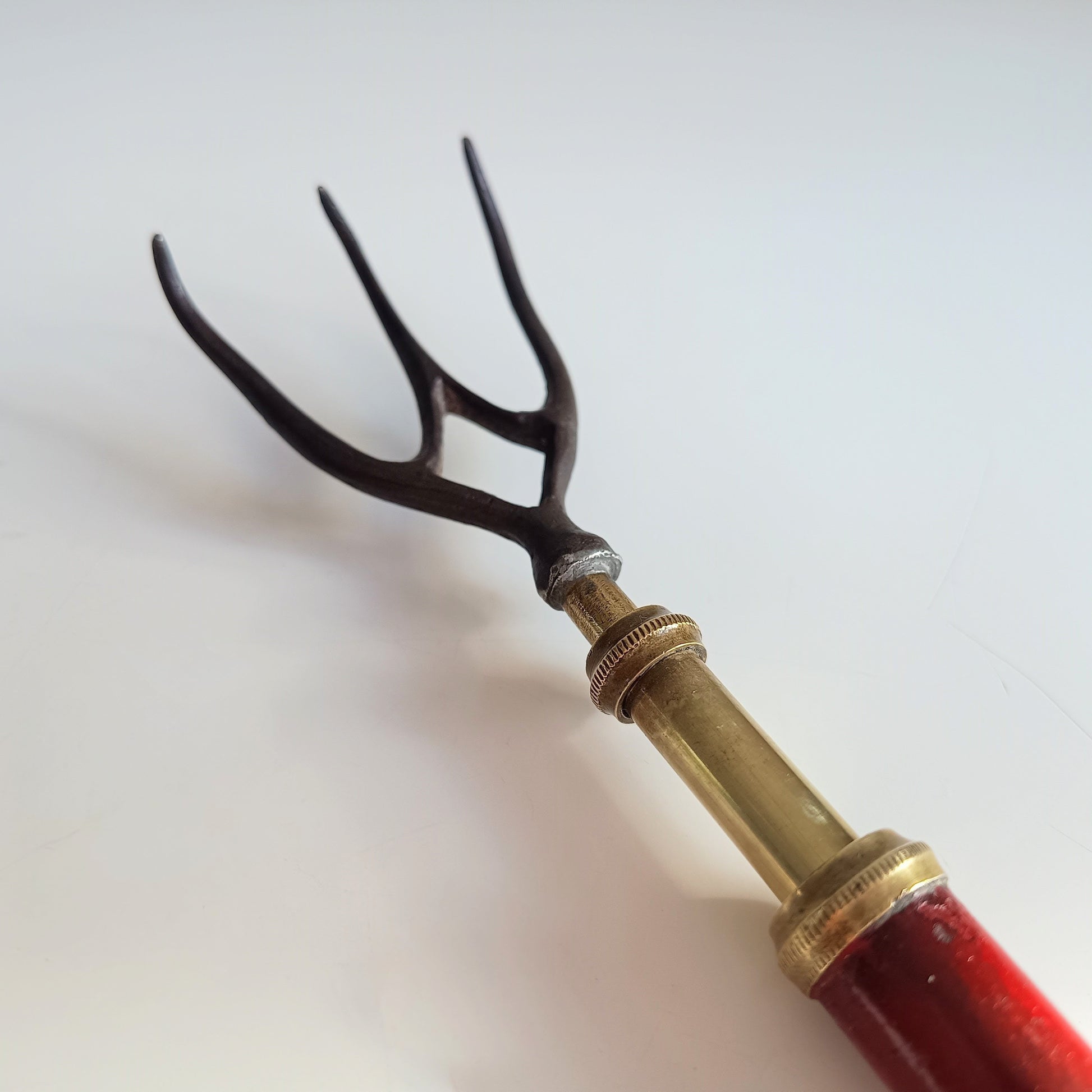 Antique Georgian retractable toasting fork, with three steel prongs and a brass internal rod with red enamel cover and a ring to hook up the fork. Fully usable to fry bread, marshmallow, cheese over the fire.