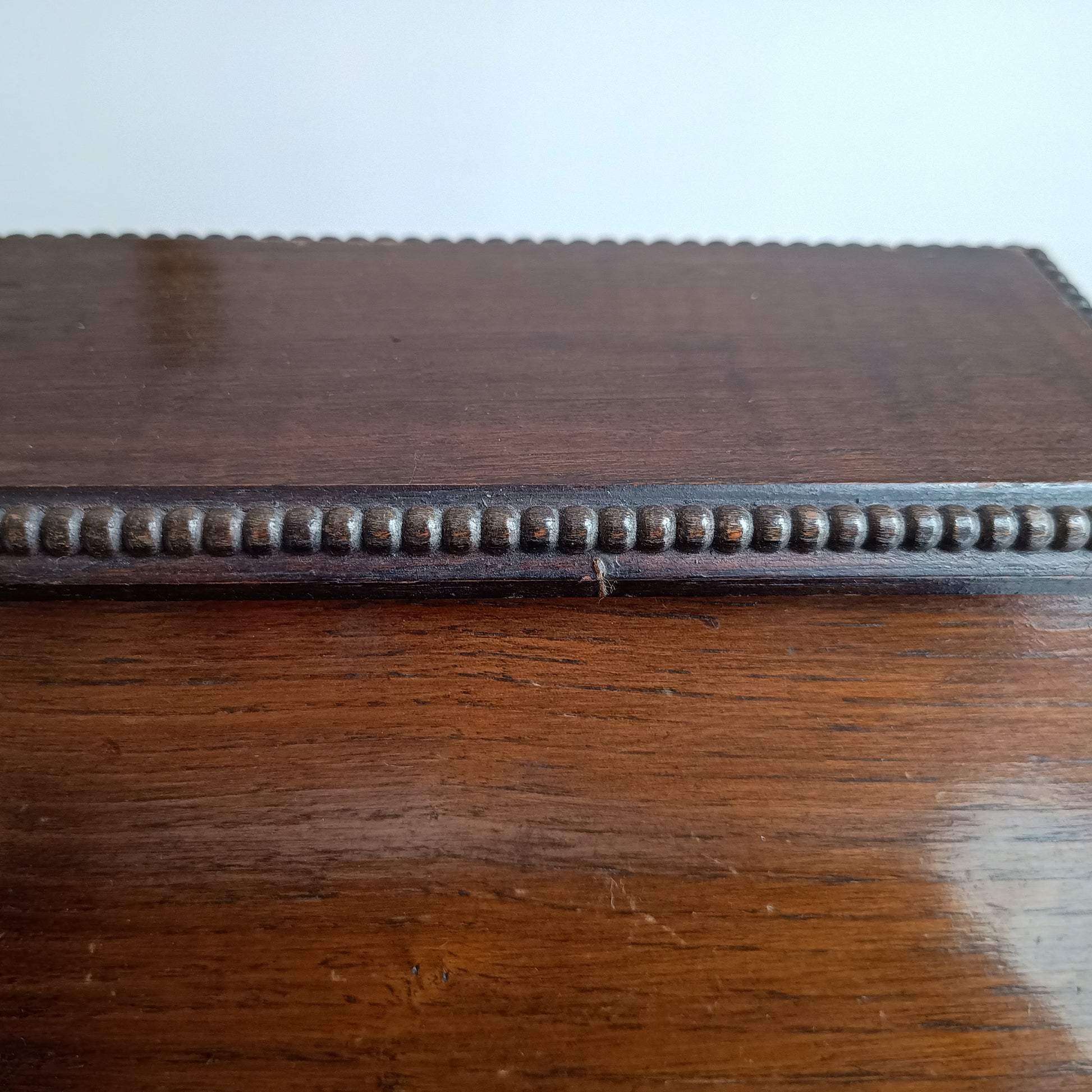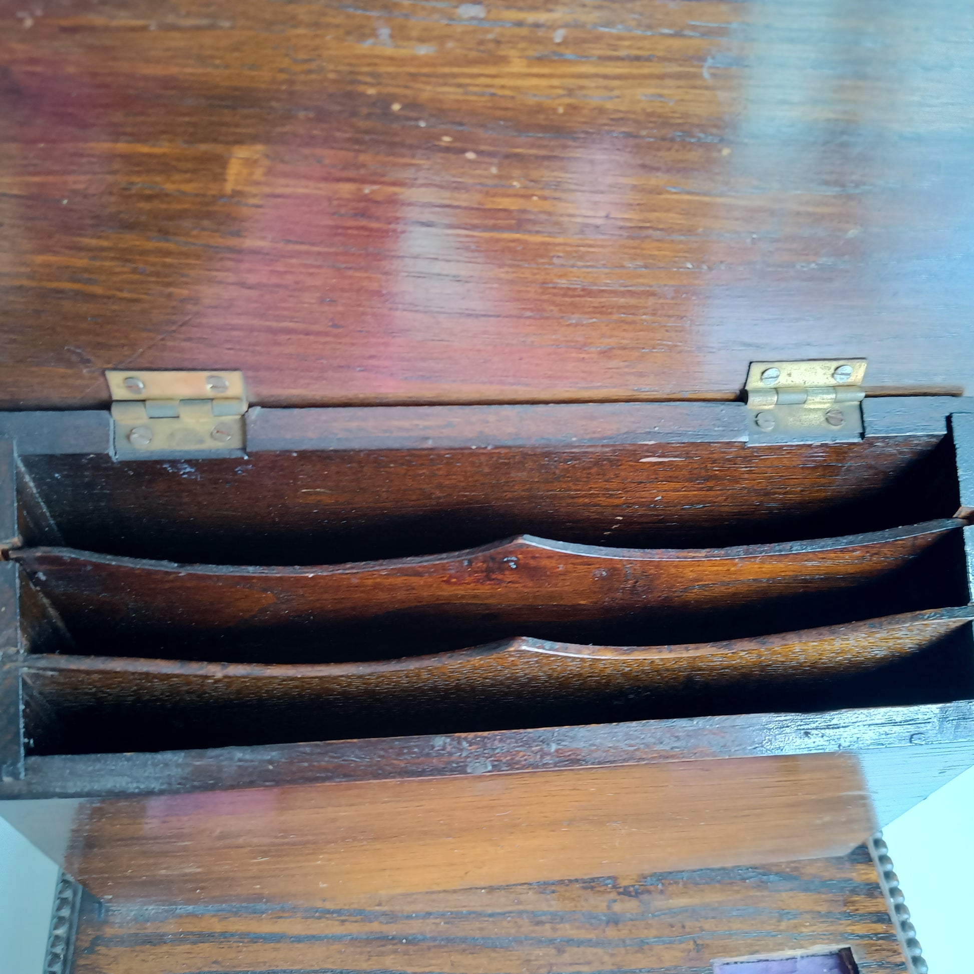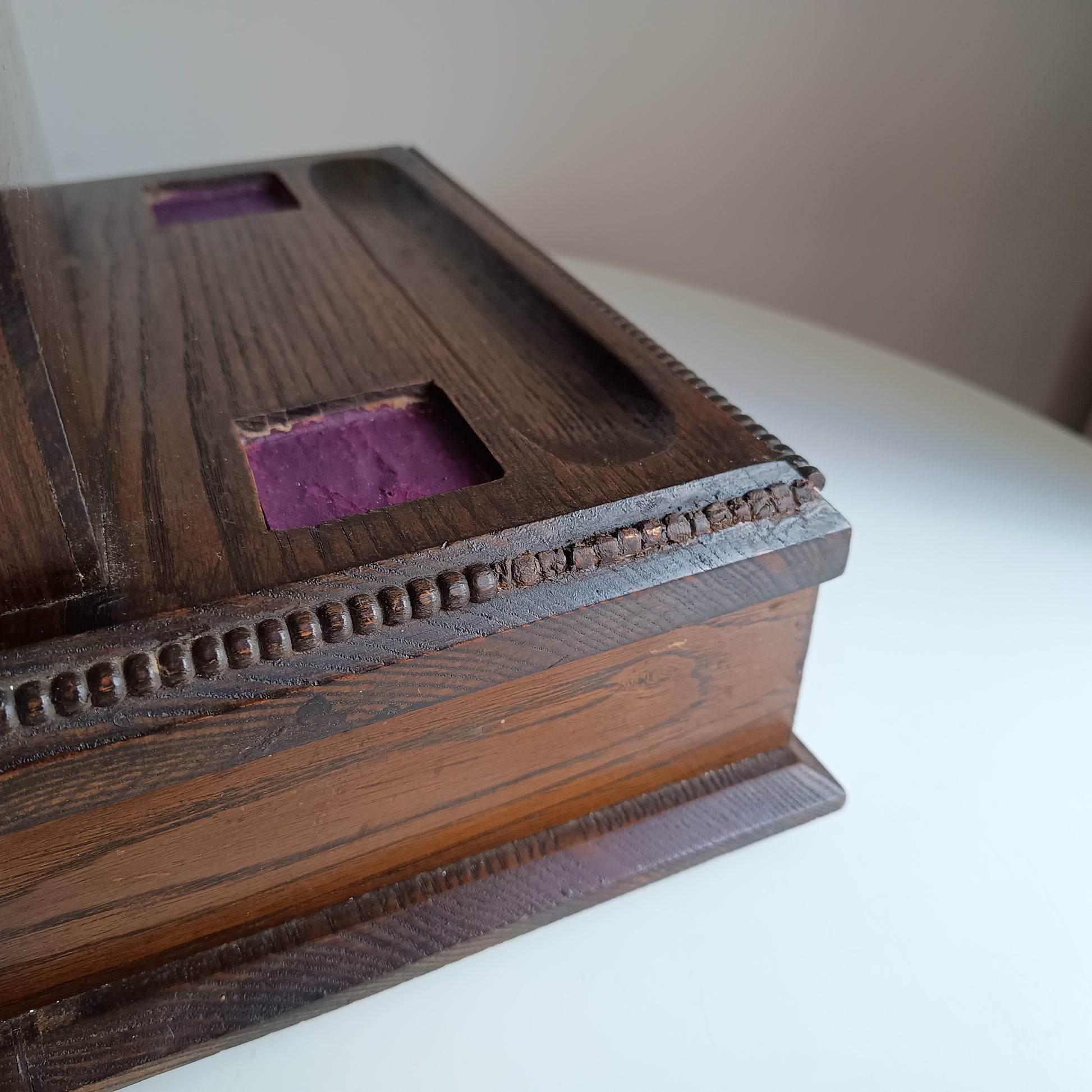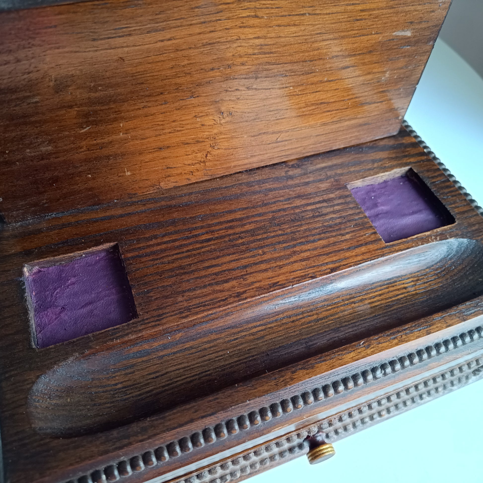 Small late Victorian oak stationery box, the rising lift up lid revealing a fitted interior with two dividers for letters or papers, the base fitted with two painted purple spaces for two ink wells or for two small boxes for paperclips. Thereis also a pen tray and a pull-out drawer, with beaded detail.