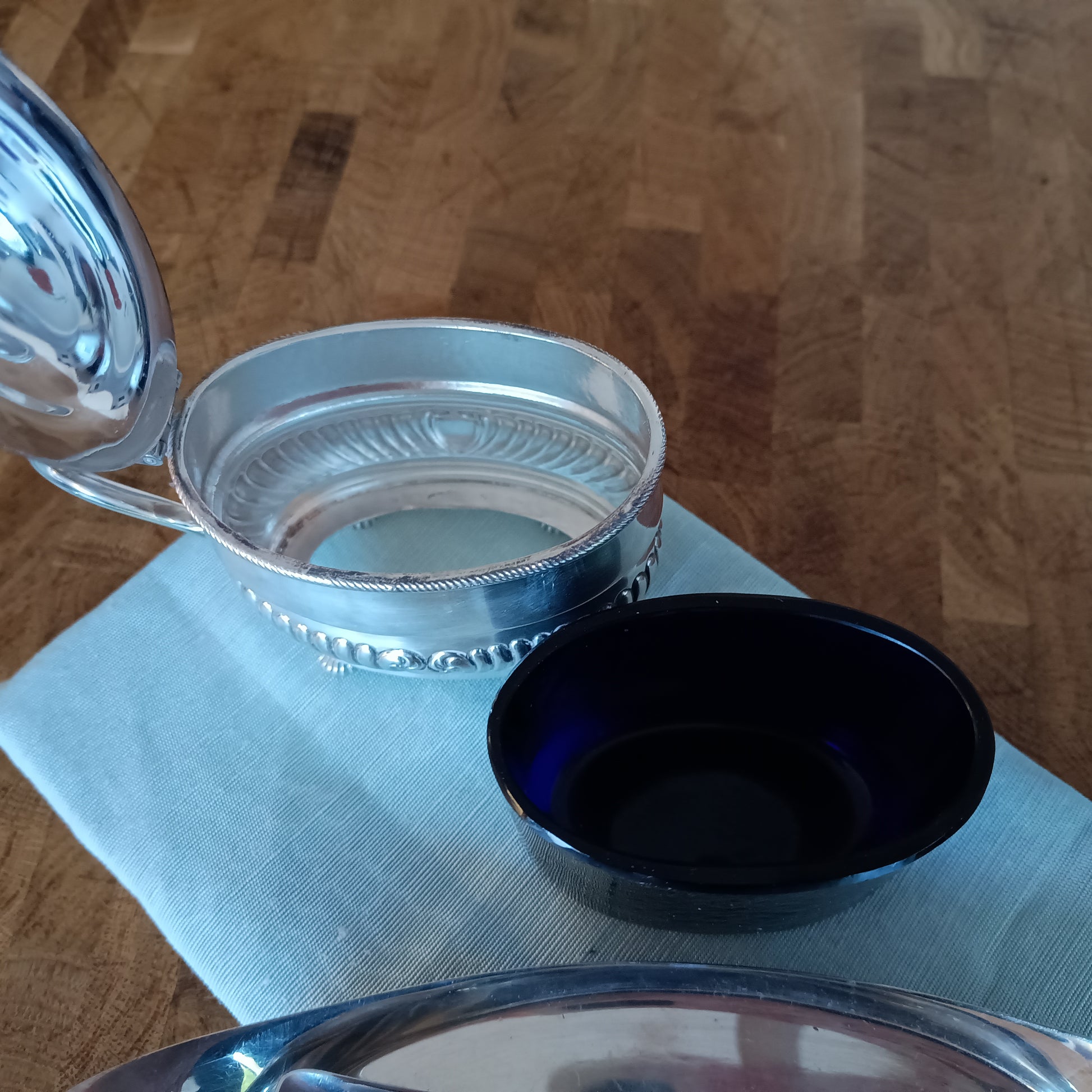 This antique serving piece rests on four ridded ball feet, it has a lift off hinged lid, beautifully decorated handle and a blue glass insert. Great for serving jam and jelly, marmalade or mustard.