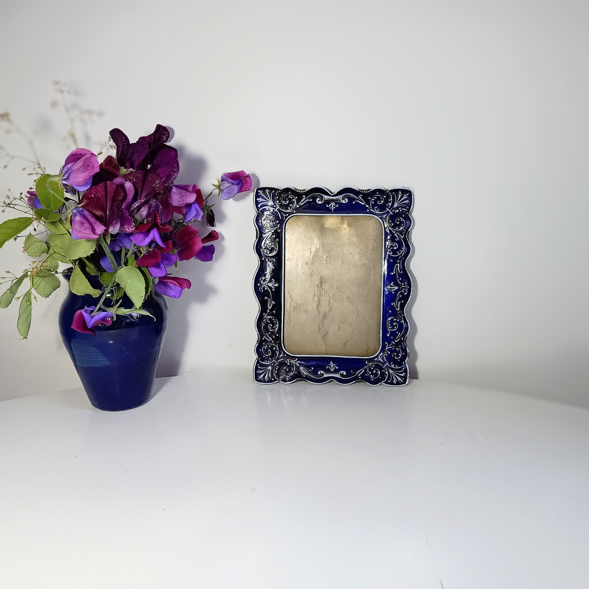 An exceptional antique French Victorian enamel frame, crafted in a rich ultramarine blue enamel on copper and attributed to the esteemed Maison Alphonse Giroux, known for their refined 19th-century objects d’art and distinctive prong-mounted construction.