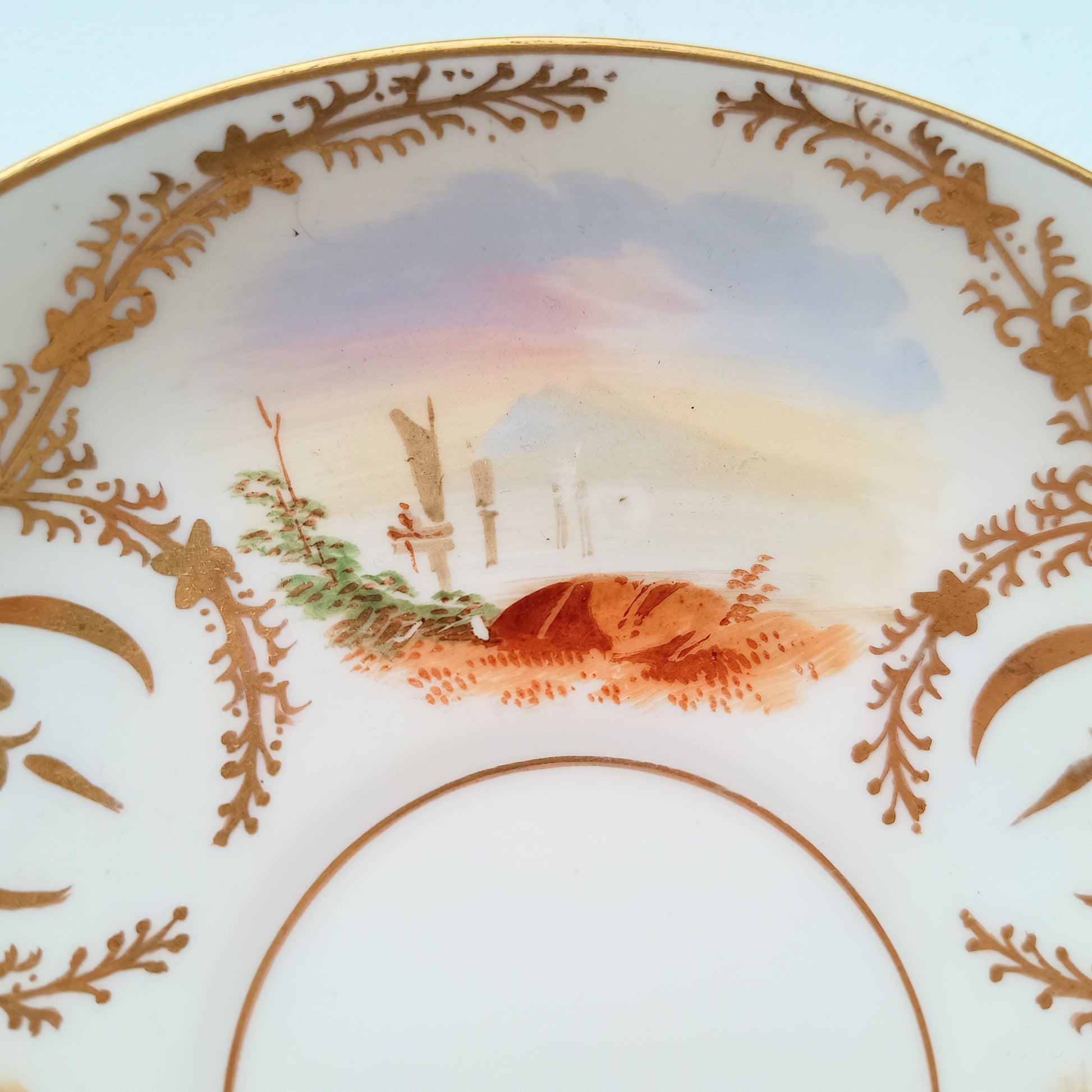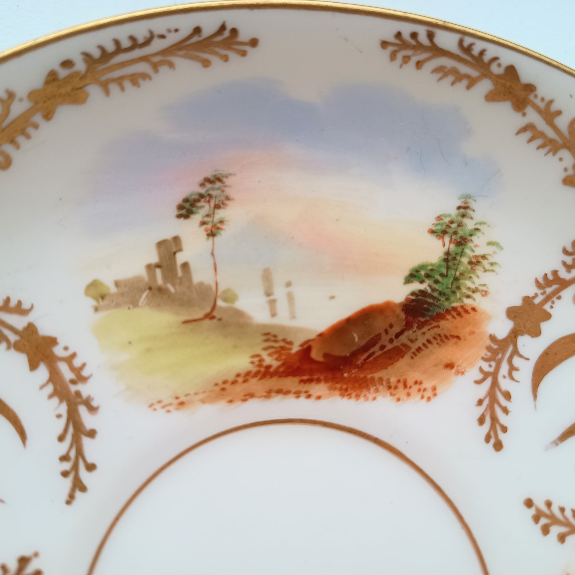 Austrian 19th-century porcelain cup and saucer with a hand-painted landscape scene and gilt decoration. Vienna-style Central European work, c. 1840. Marked with handwritten number on the base, typical for Vienna decorator workshops of the period. All landscape scenes around the cup and the saucer are different.