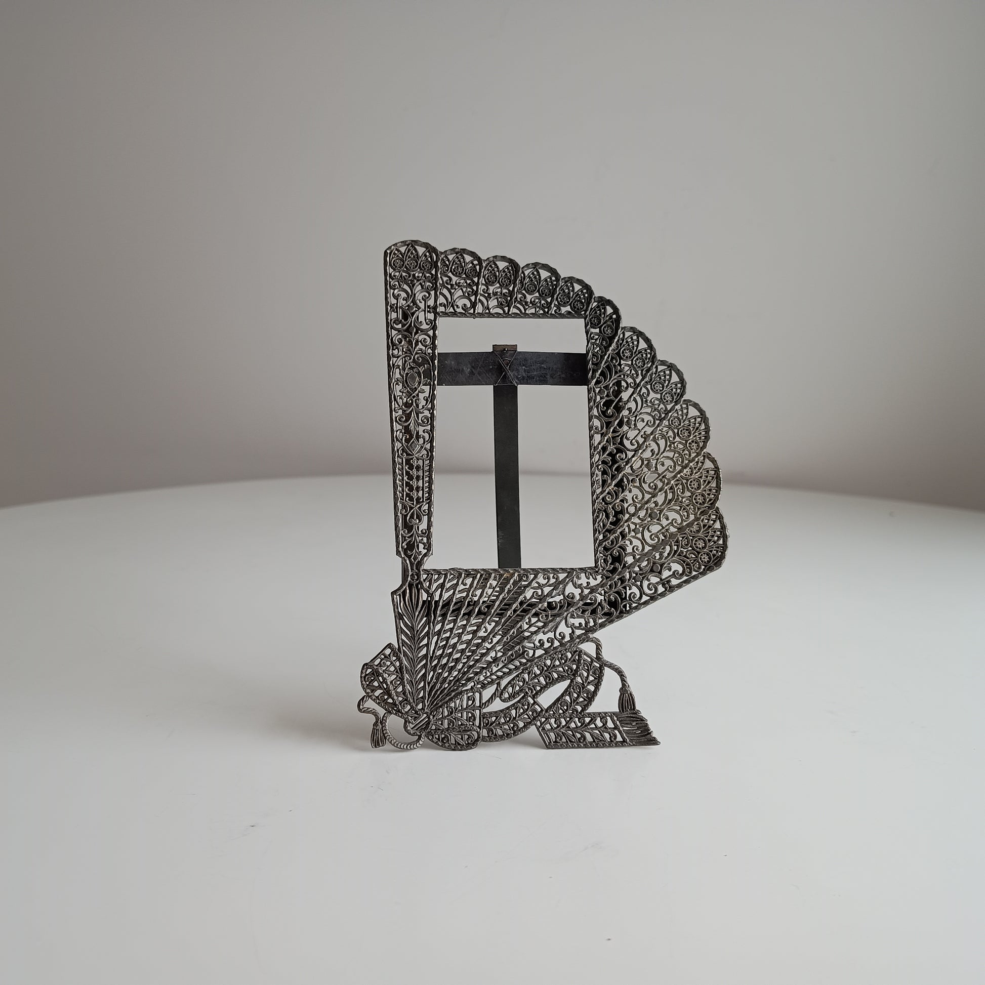 Antique Jugendstil Faux Filigree curtain shaped tabletop picture frame made of tin based alloy around 1900, likely in Austria-Hungary or France. Tin alloy was the material of choice in the Art Nouveau period due to the fact that tin and tin based alloys are particularly suitable for the curved Jugendstil shapes.