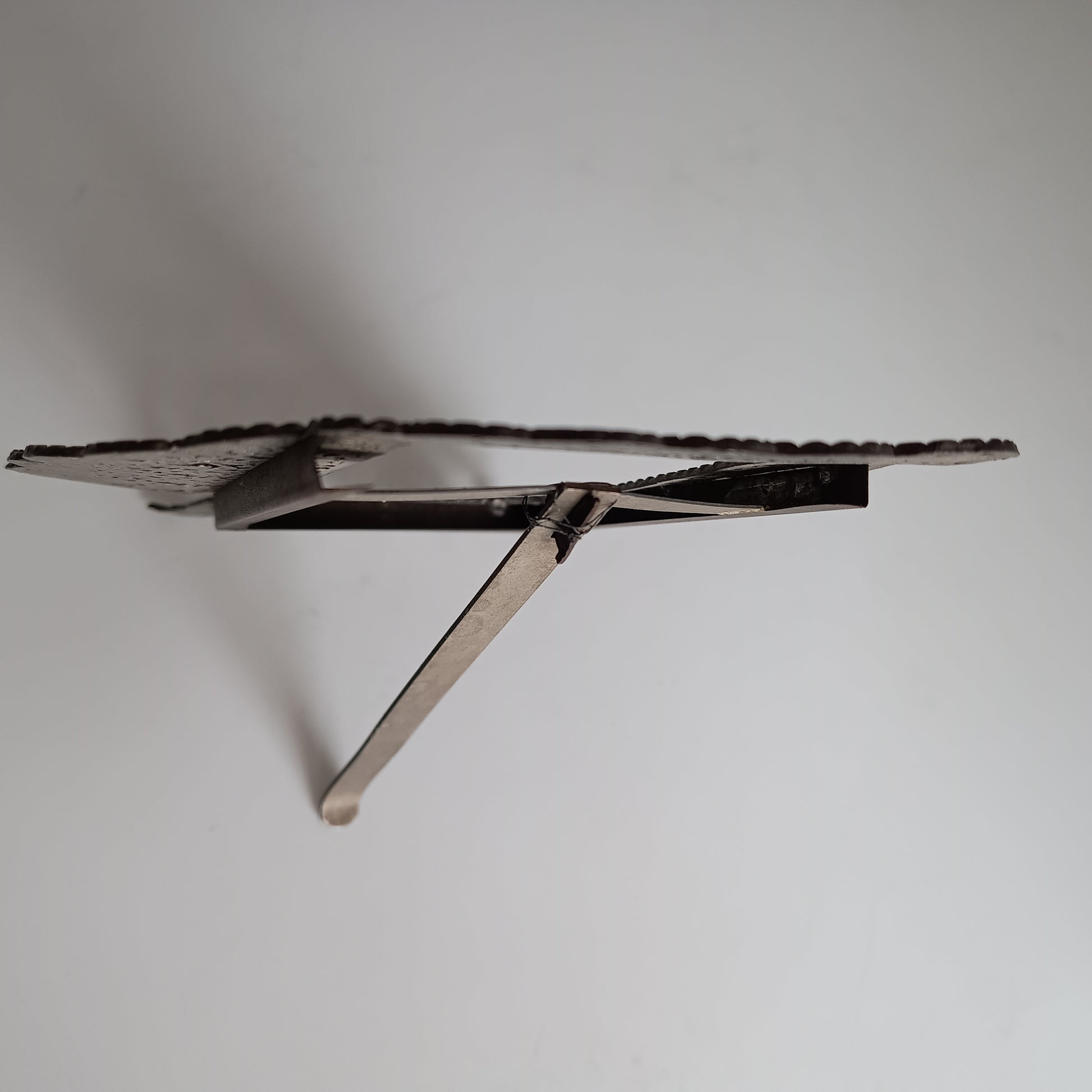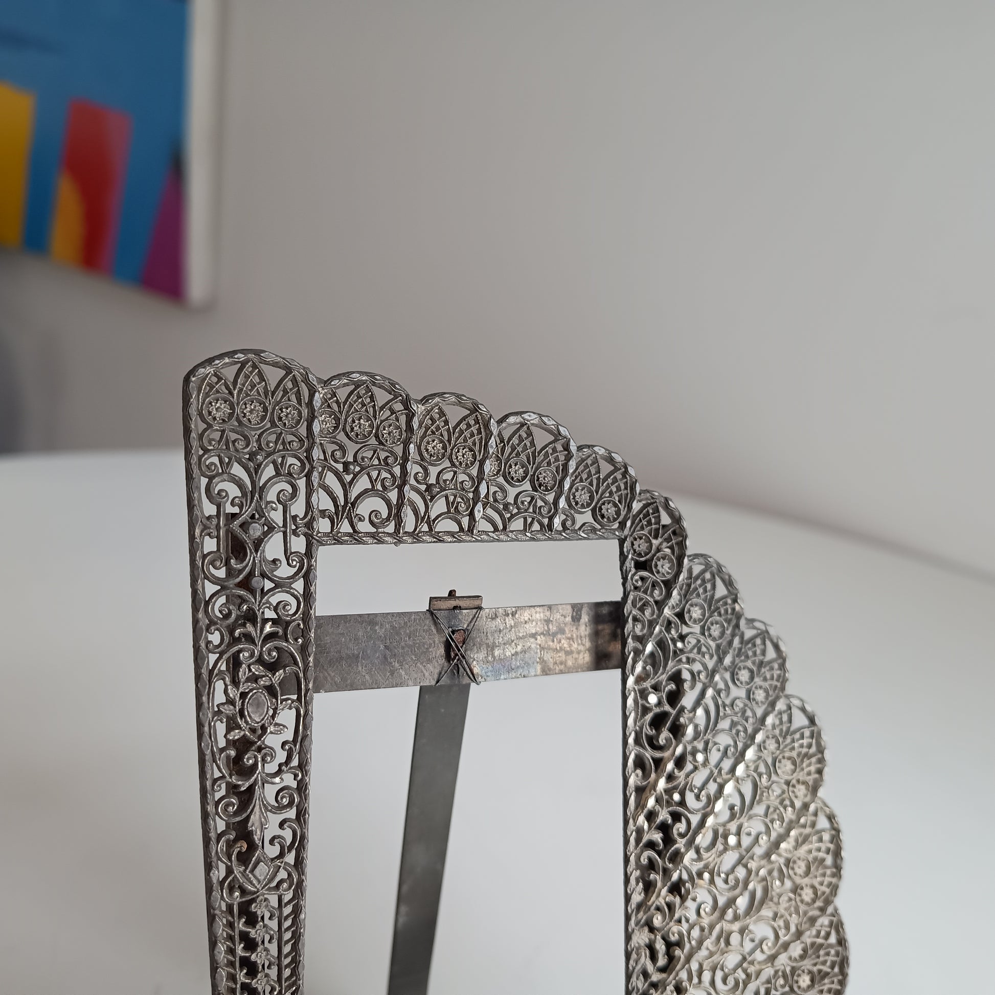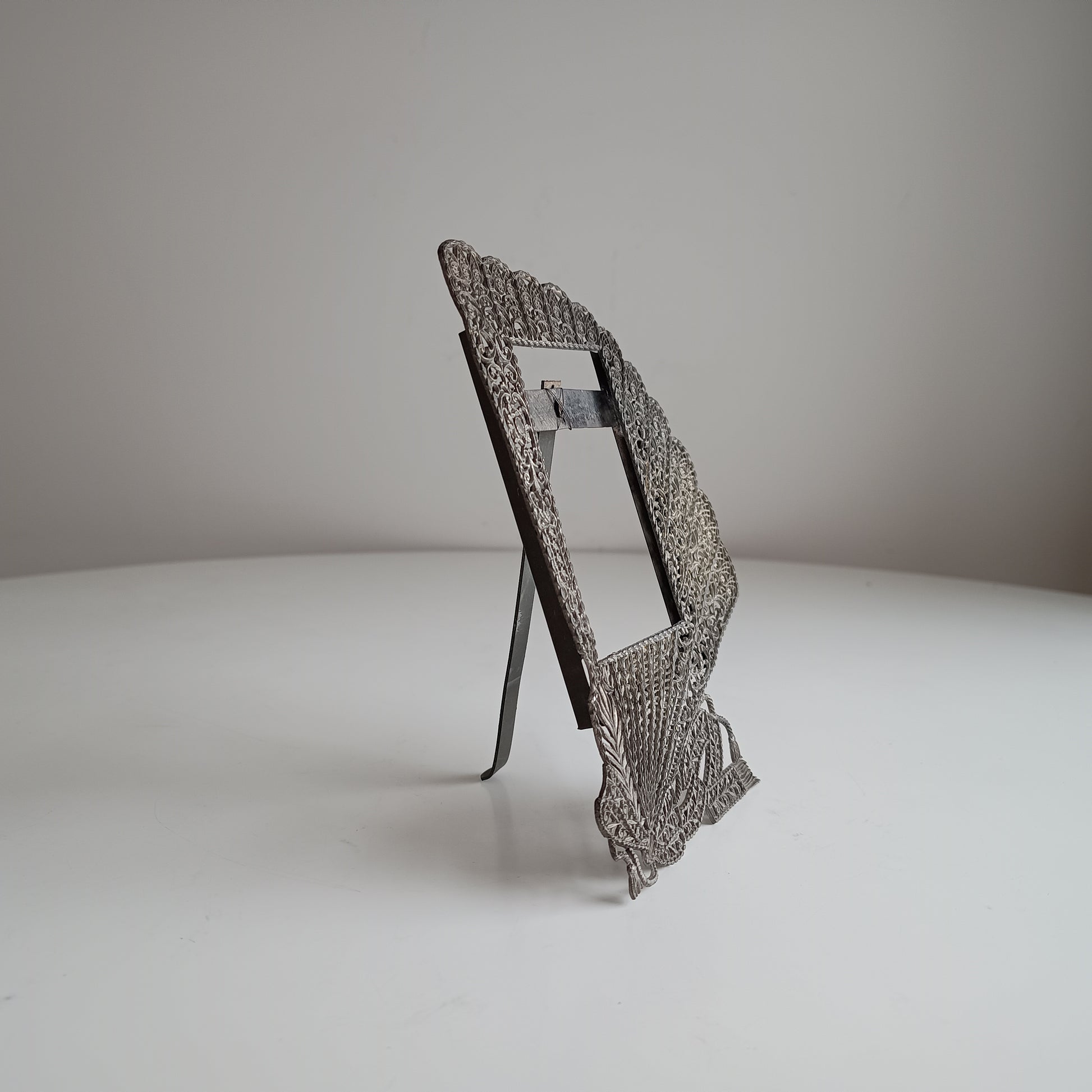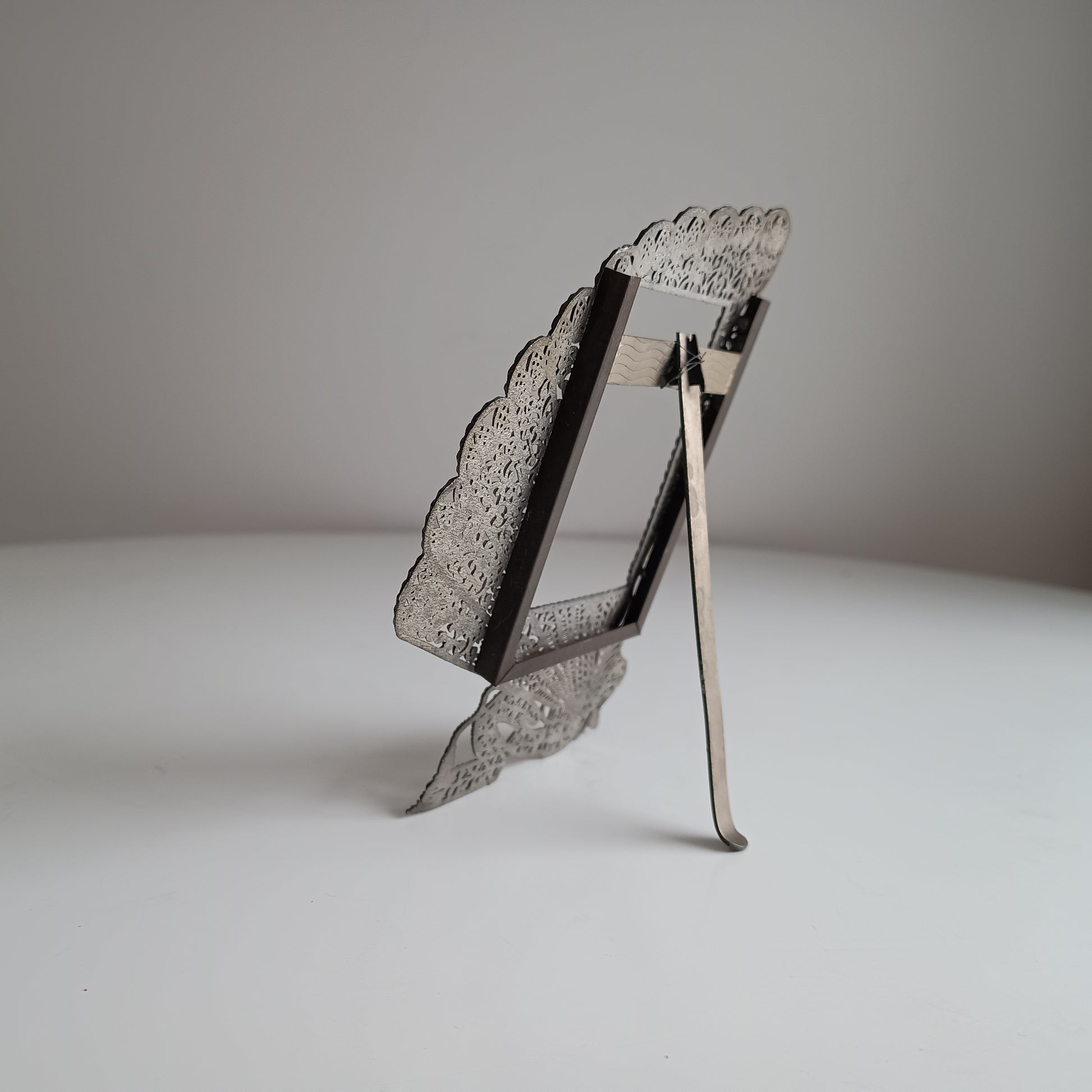 Antique Jugendstil Faux Filigree Curtain Shaped Tabletop Easel Stand Photo Frame Impressed Toleware c 1900 for Cabinet Portrait Photos