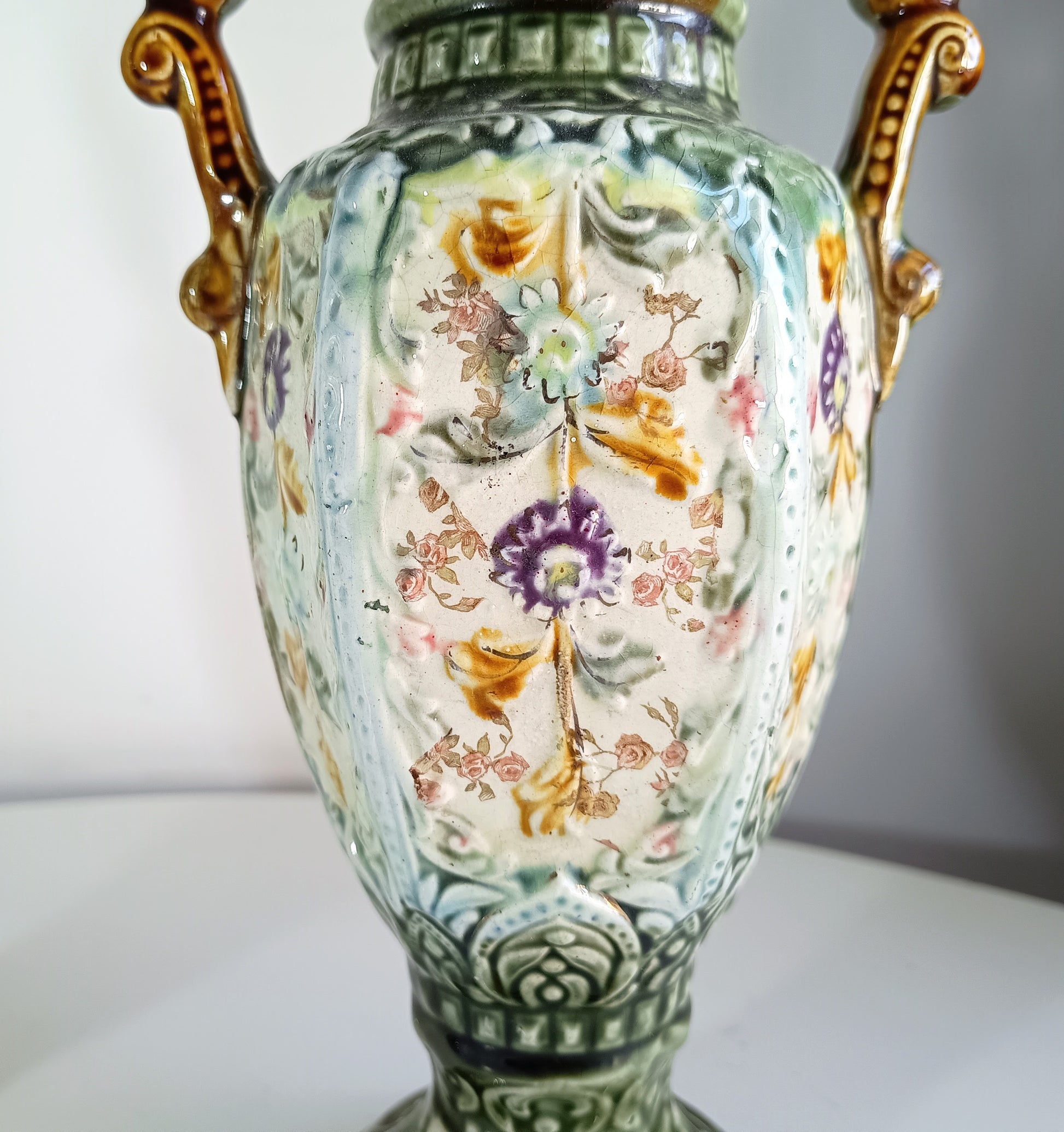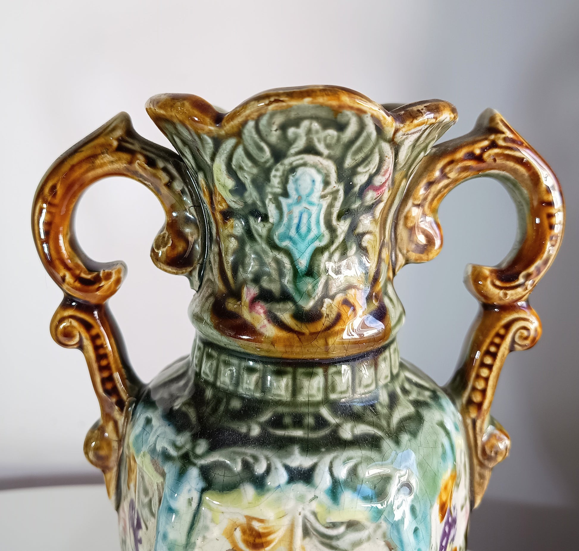 Art Nouveau Majolica Twin Handled Vases – Edwardian Staffordshire, Pair