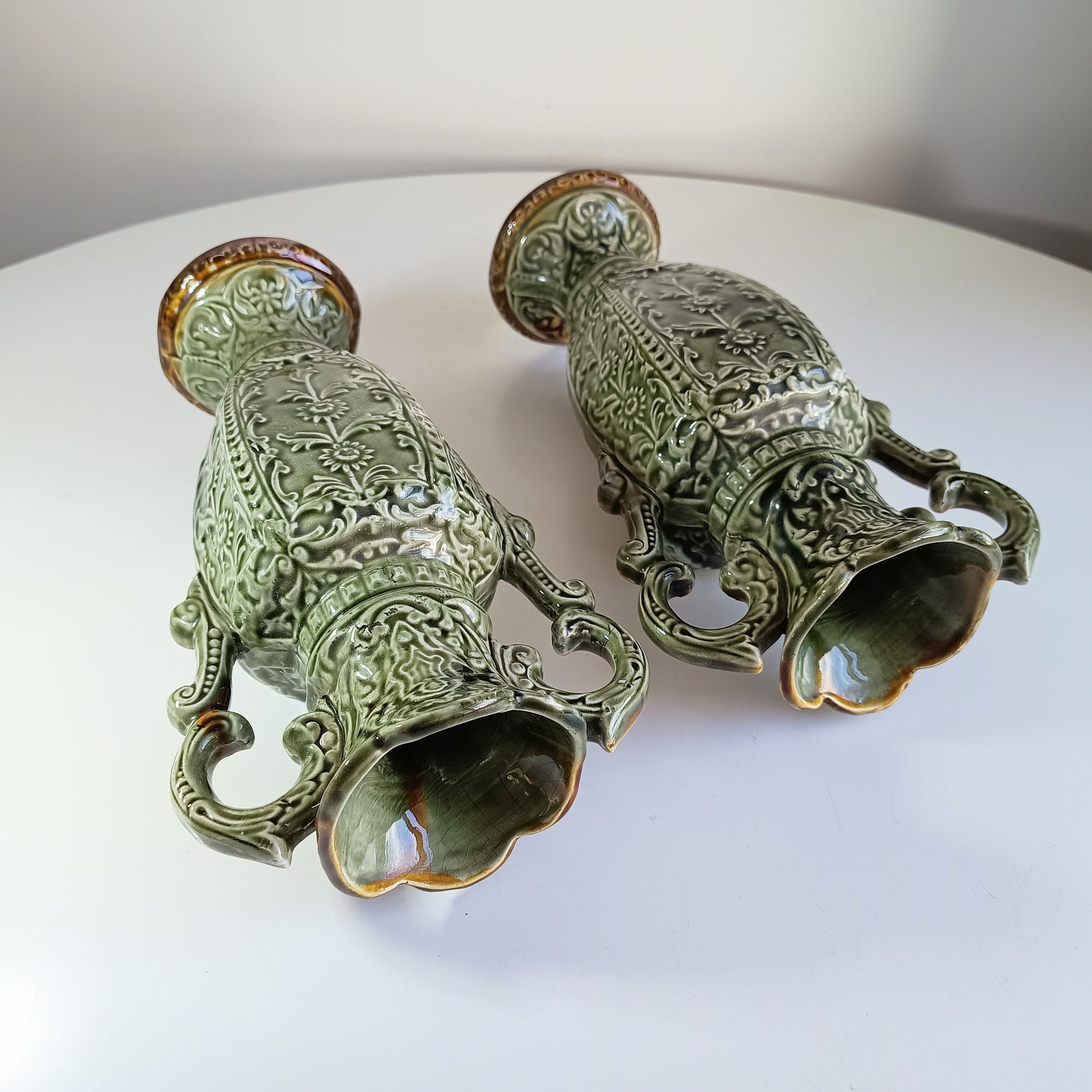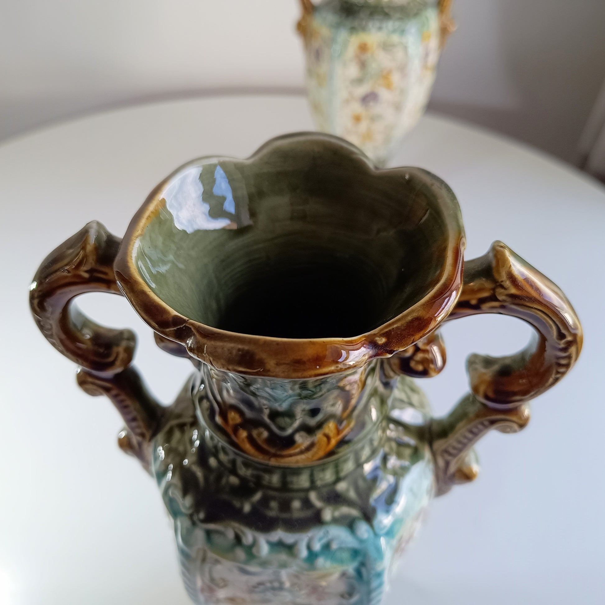 Elevate your interior with this stunning pair of antique Art Nouveau majolica vases, crafted in Staffordshire, England between 1900 and 1910. These rare ornamental vases are a striking example of Edwardian elegance and artistic ceramic mastery.