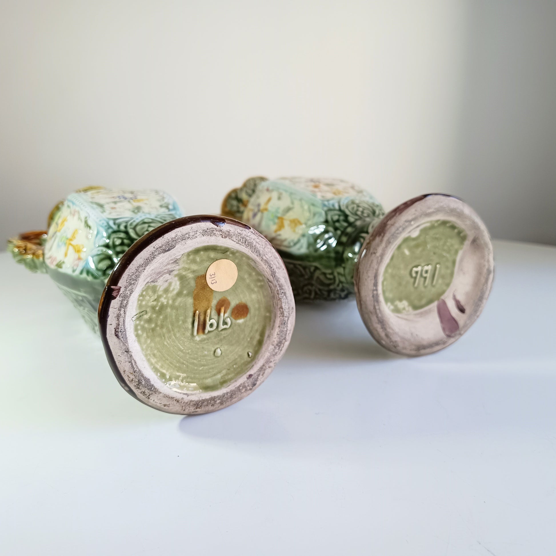 These vases are a testament to antique craftsmanship—note the characterful glaze crazing and minor firing crack on one base, typical of majolica pieces of this era. Marked with model number 791 on the underside. These vases are sold as a matched pair.