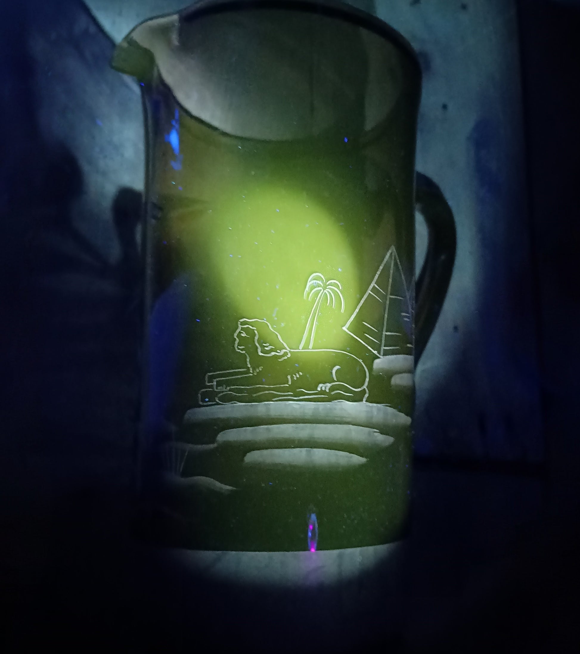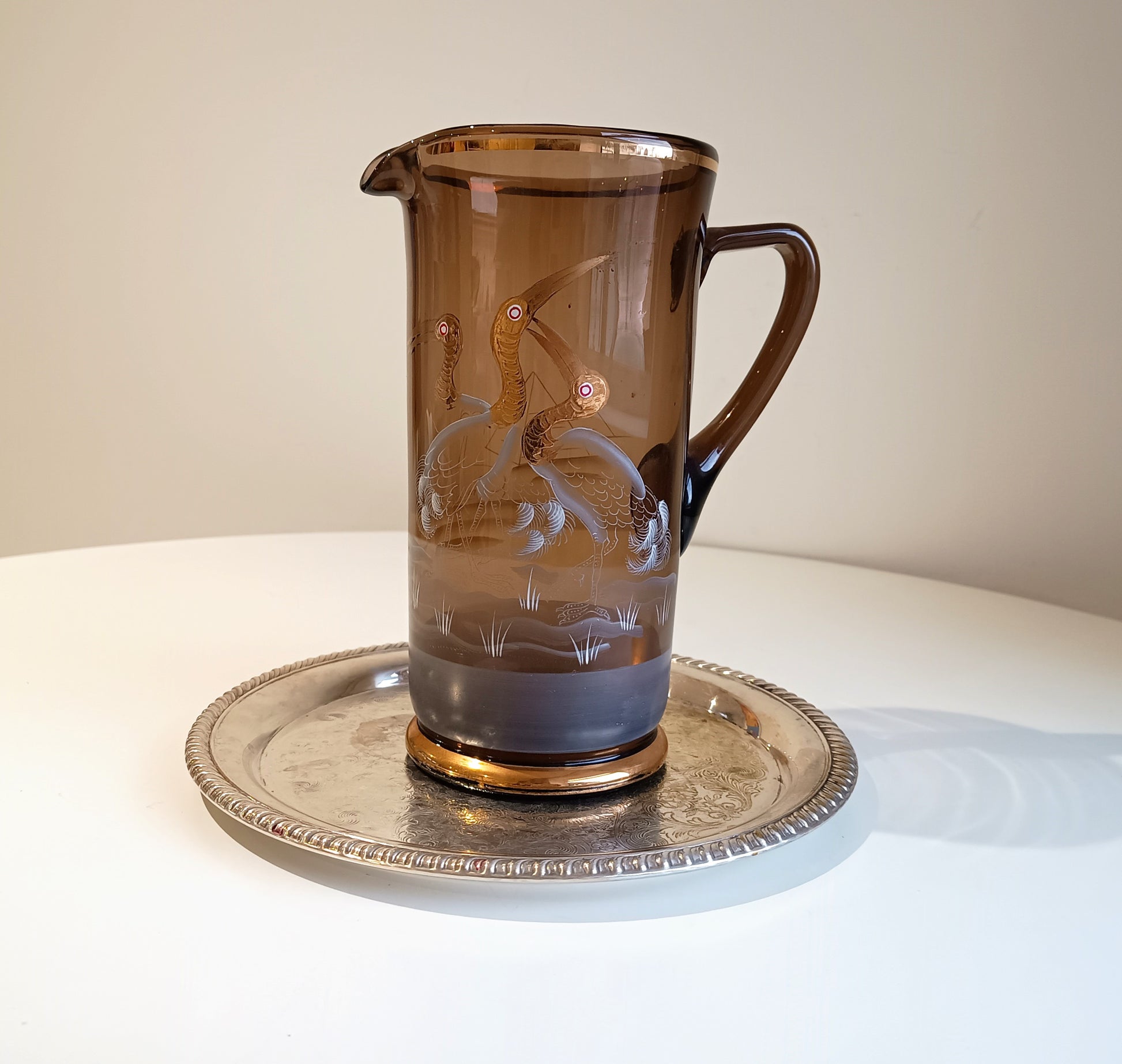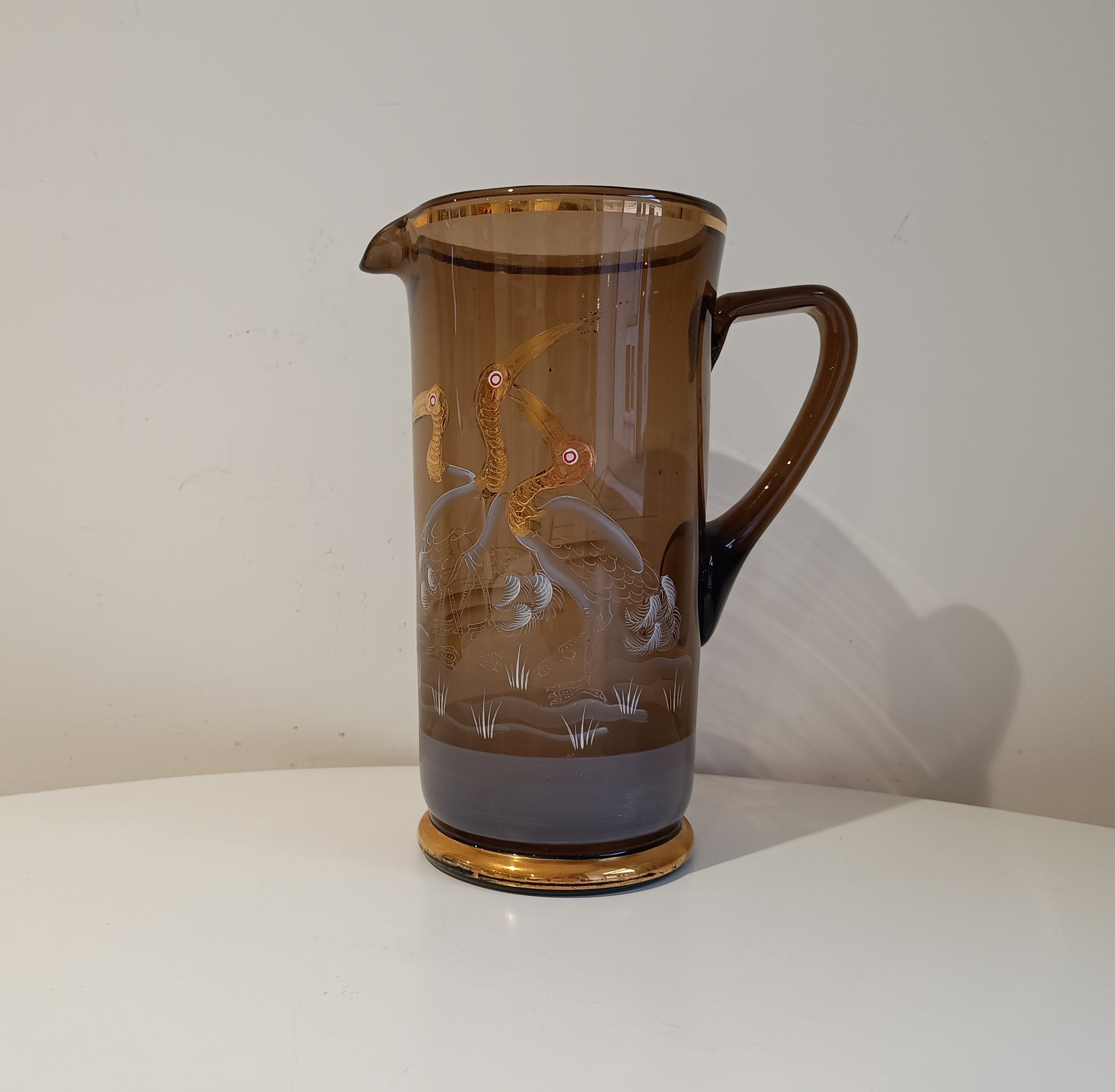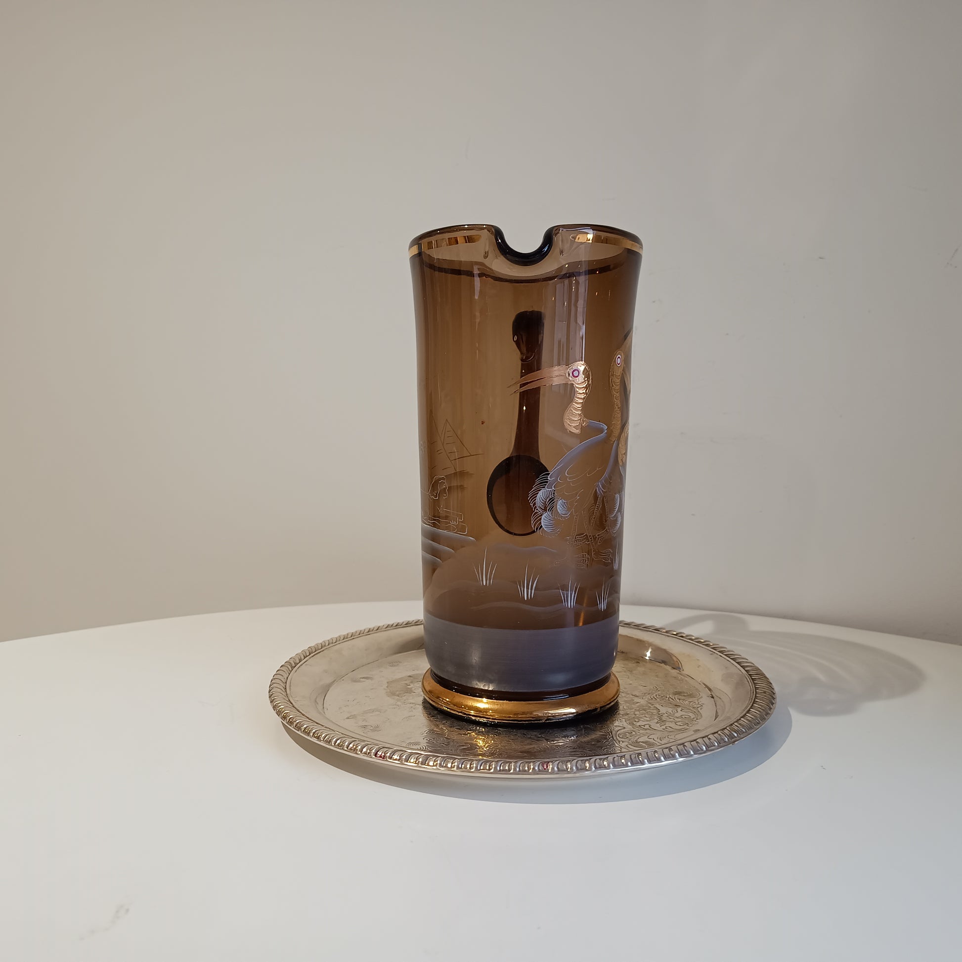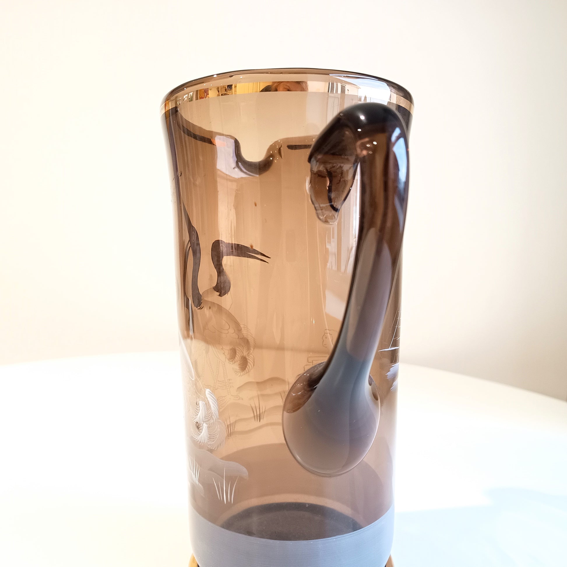 The jug stands tall at about 23 cm. It is formed in rich amber / smoked olive glass which reacts under UV light, characteristic of manganese-decolourised glass widely used in Central Europe before the First World War. One side features an Egyptian-inspired scene with pyramids and stylised landscape engraving, echoing the widespread fascination with antiquity following late 19th-century archaeological discoveries. The opposite side is adorned with finely enamelled and gilt herons, standing among engraved reeds and flowing water.