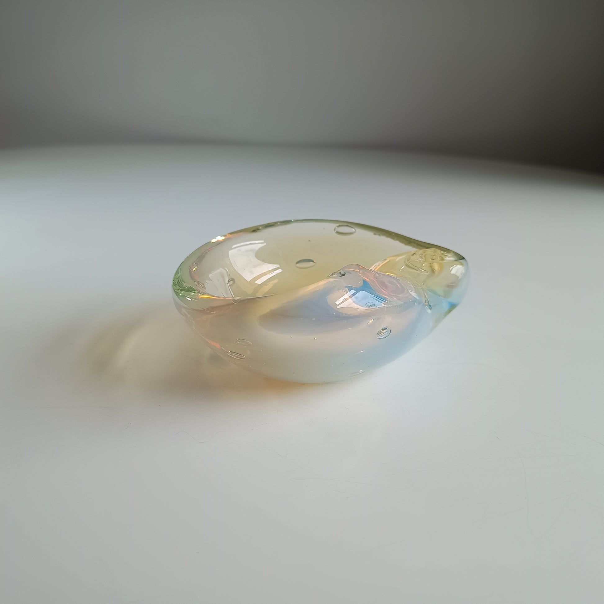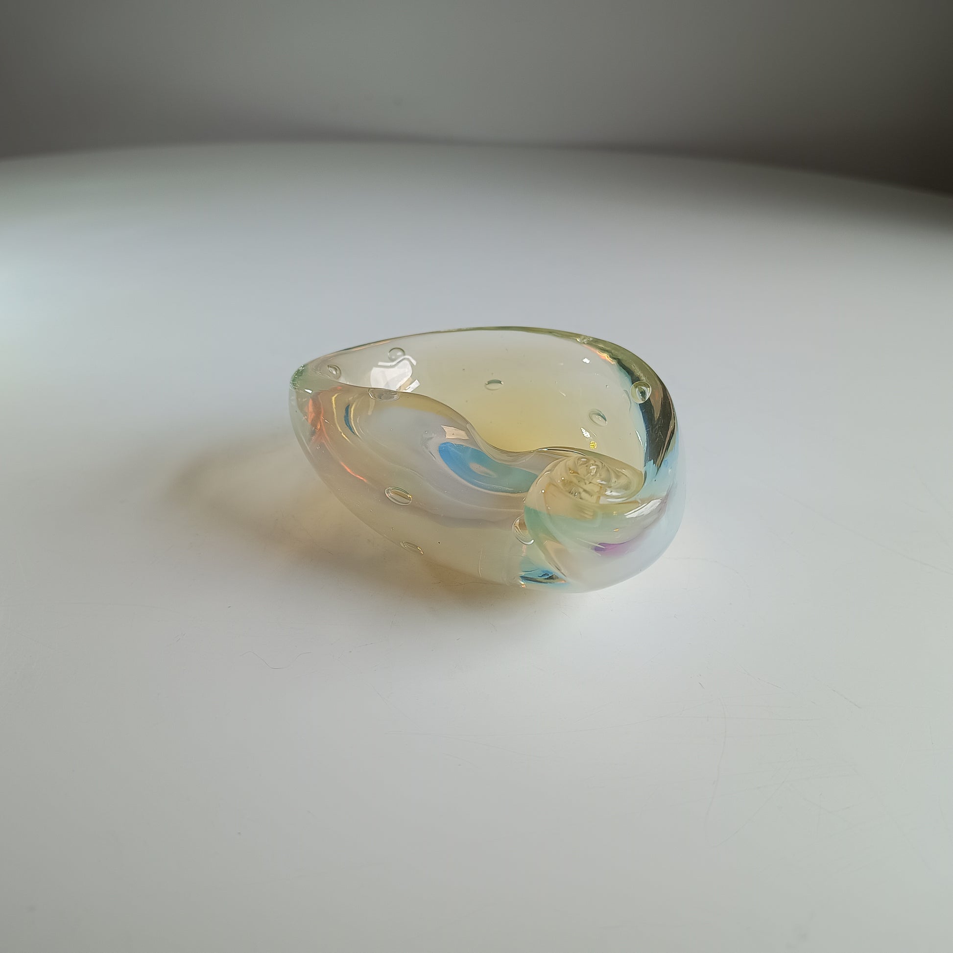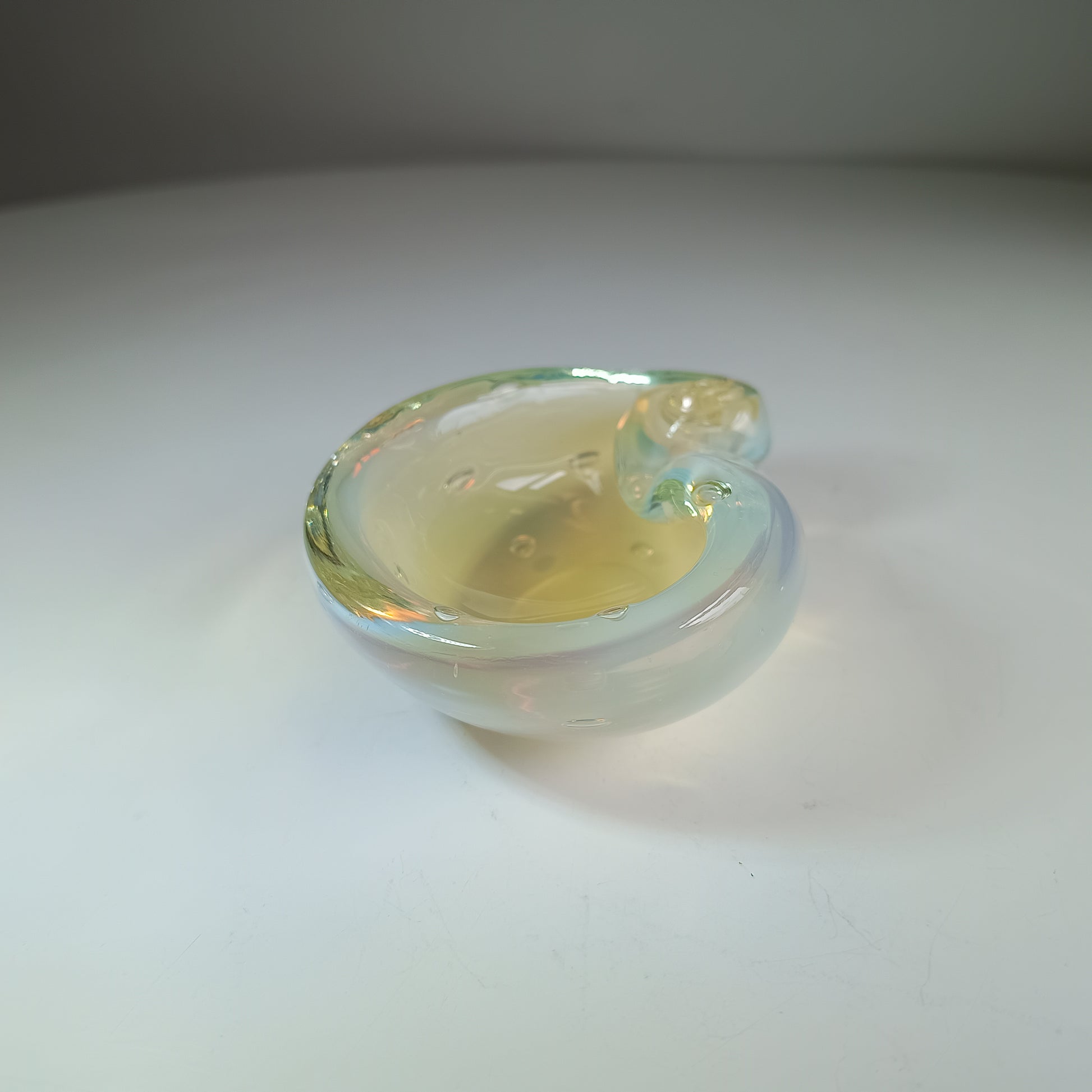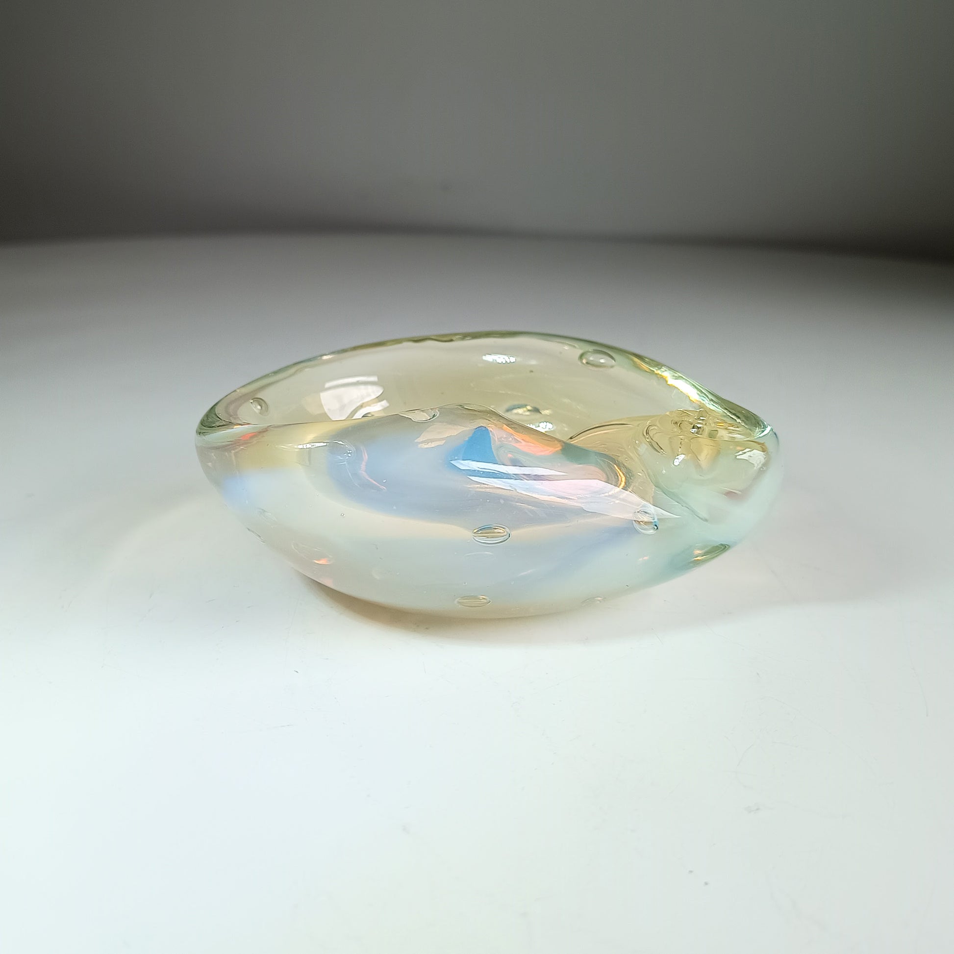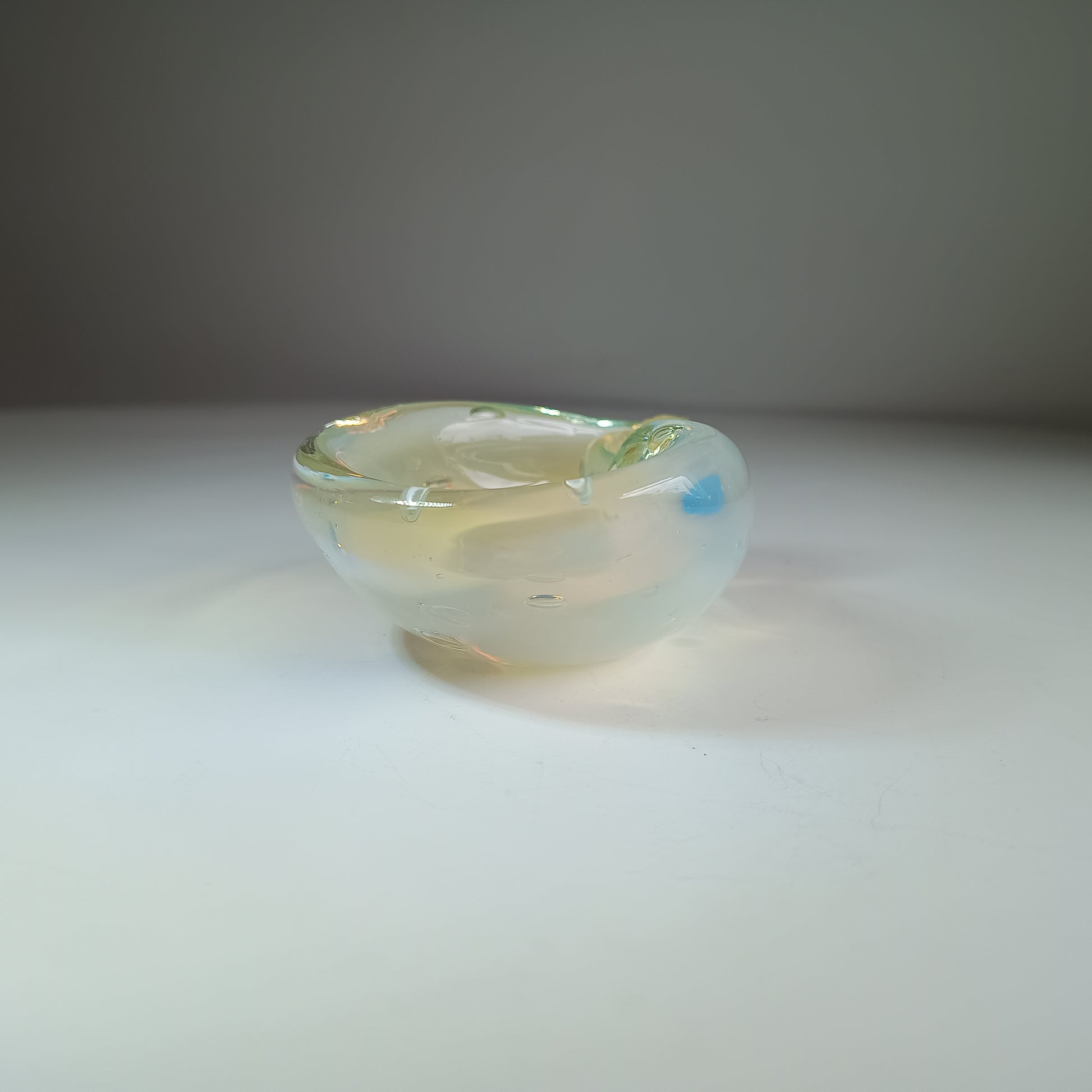 Amazing 1950-1960 Murano Opalescent Art Glass small bowl, originally created as an ashtray but great for use as a nut dish or display. It shows most beautiful subtle shades of added colours - pink, orange, yellow, blue or even lilac depending on how you position it and how the light highlights it.
