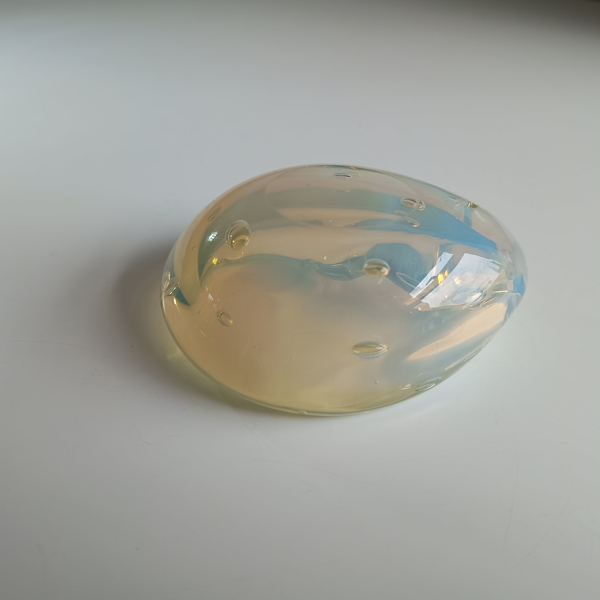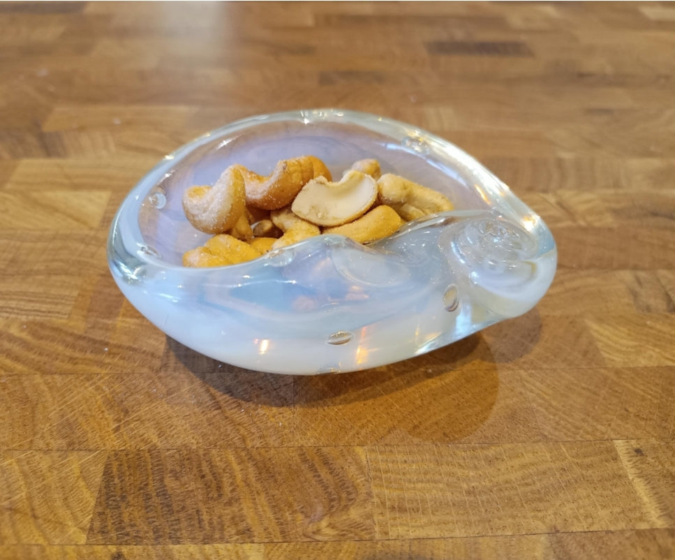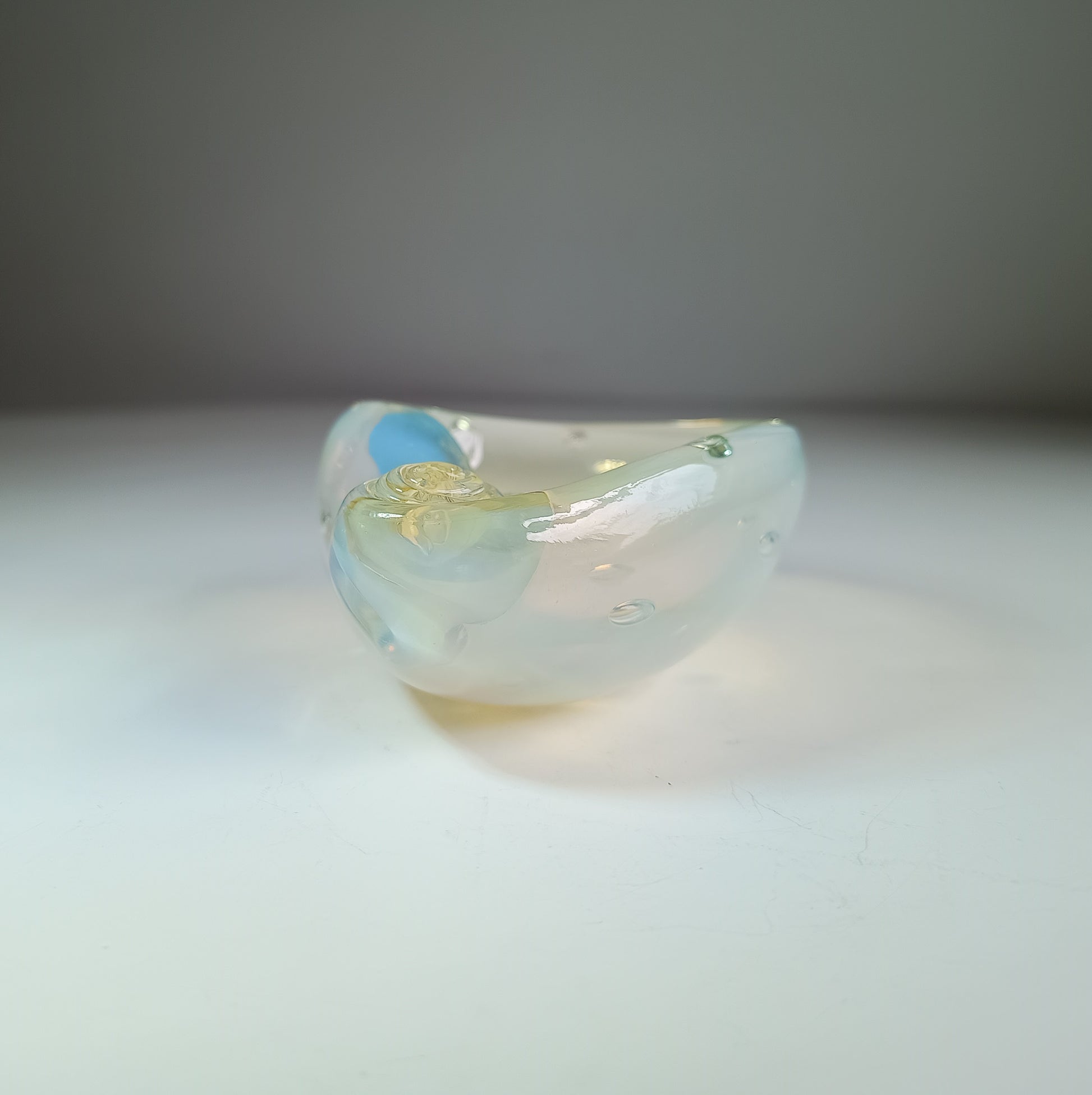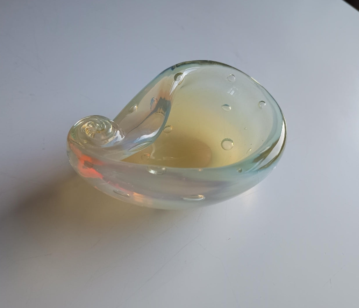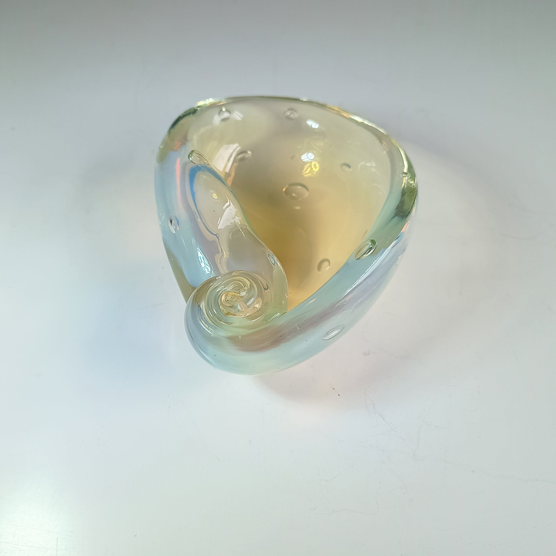 Amazing 1950-1960 Murano Opalescent Art Glass small bowl, originally created as an ashtray but great for use as a nut dish or display. It shows most beautiful subtle shades of added colours - pink, orange, yellow, blue or even lilac depending on how you position it and how the light highlights it.