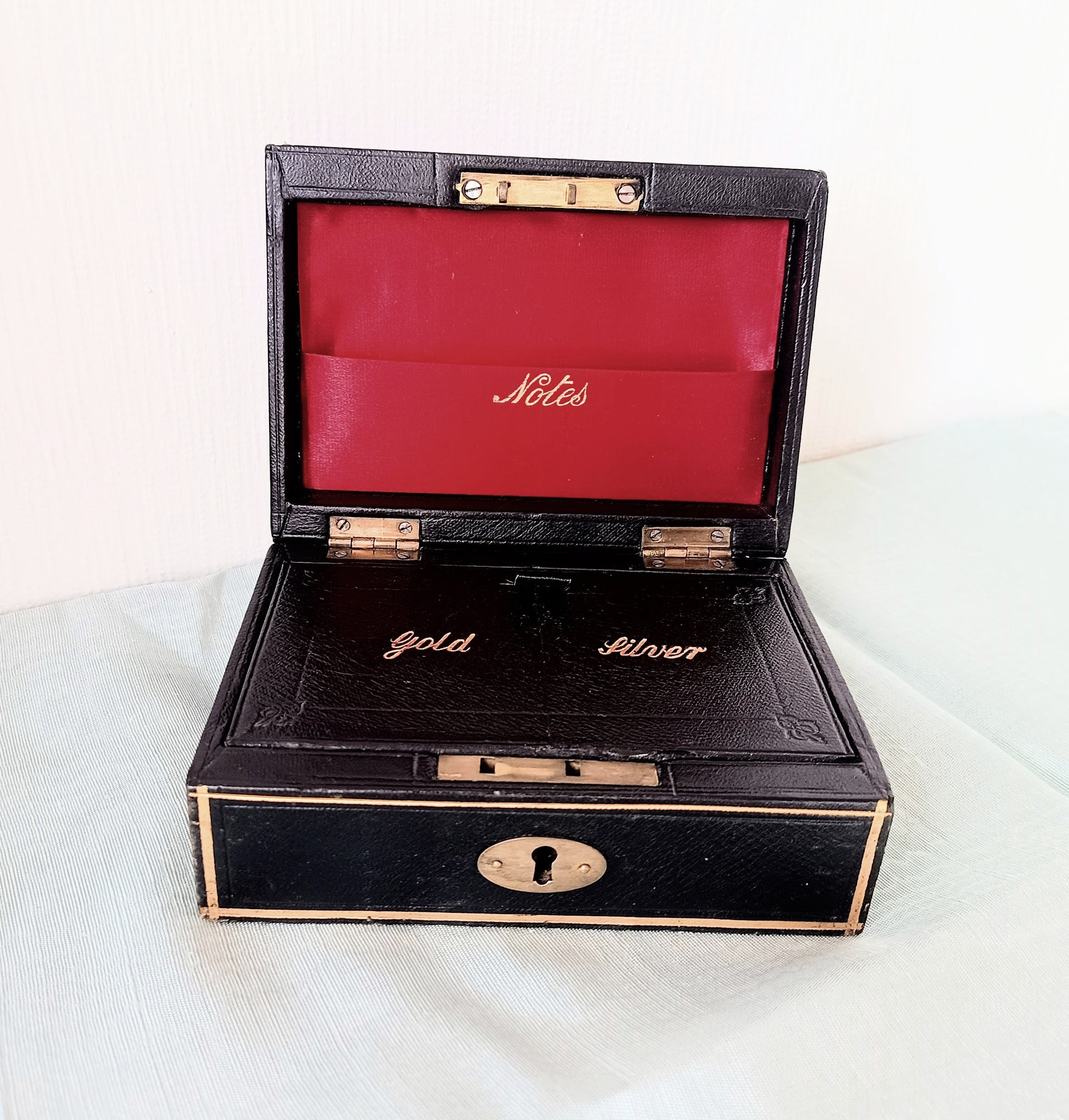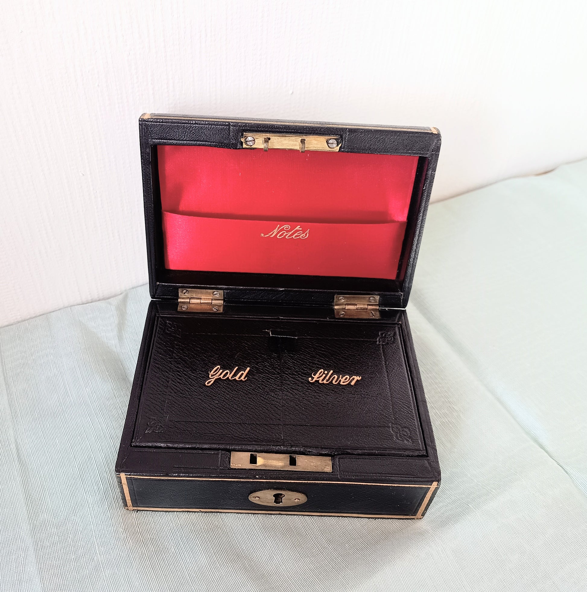 The box has two lined compartments with lifting lids. Each with gold embossed Gold and Silver words with the original leather finger lifts to the lids.The lid has a further compartment for Notes, again embossed in gold.