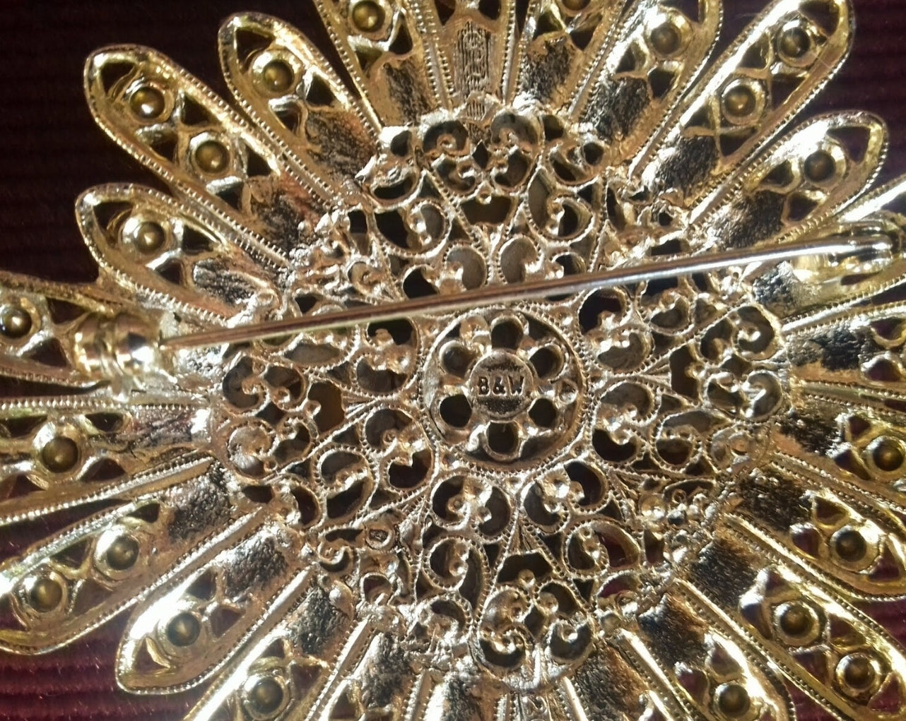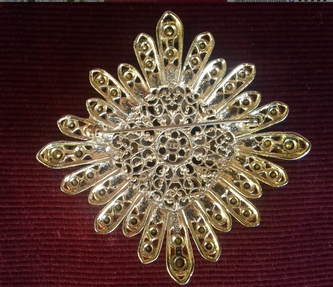 This fabulous collection piece features a giant star design with massive glass cabochons and a myriad of Swarowski crystals, all bezel set in gold-tone opulent filigree metal base. This extraordinary Avant-garde Baroque piece dates from circa 1980s. It is signed on the intricate reverse side "B&W". The brooch is also numbered on one of the rays, 20489.
