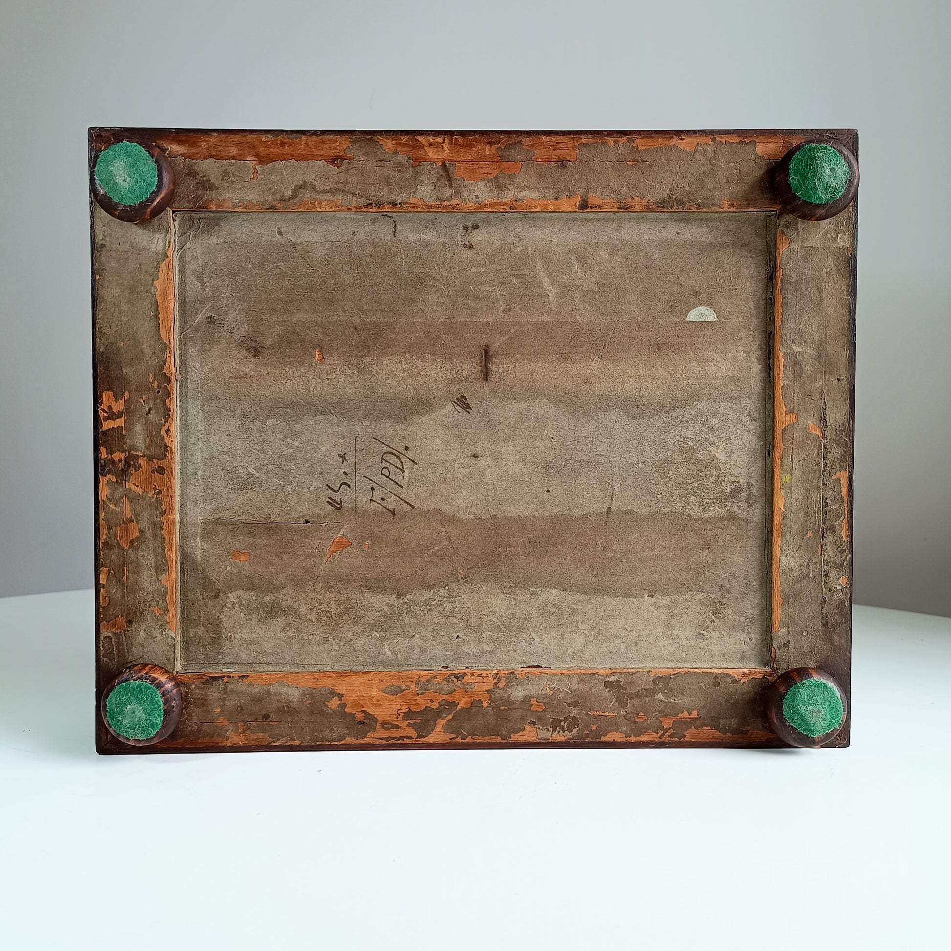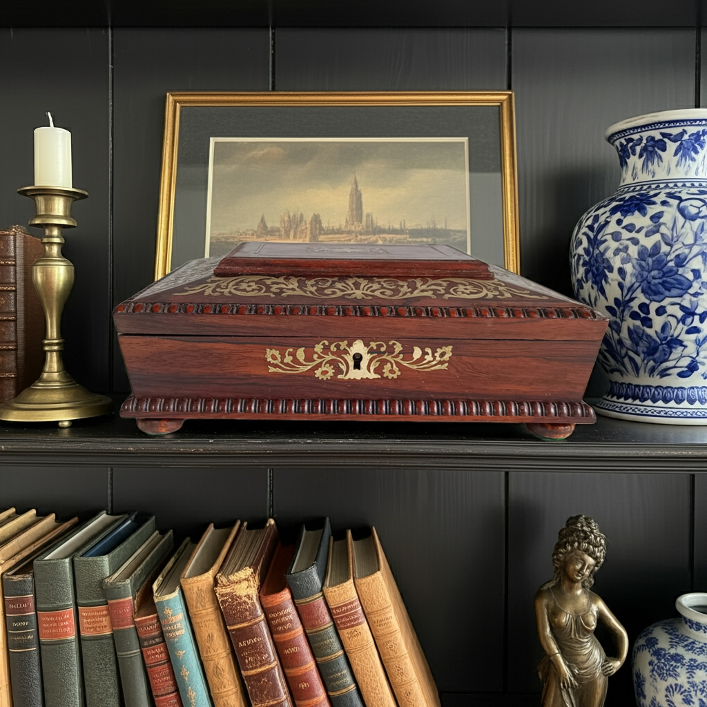 An exquisite early 19th-century Regency-era sarcophagus casket box crafted from rich mahogany or rosewood veneer, featuring rare Boulle-style brass inlay. Of likely Irish or English origin, this elegant piece captures the refined craftsmanship and opulence of the period. The domed lid opens smoothly on original hinges, revealing charming original paper-lined partitions — faded with time but intact — hinting at its past use for sewing implements, writing instruments, or precious keepsakes. A fine example of Regency decorative arts, this casket box is ideal for collectors of antique writing boxes, Boulle work, or anyone seeking a luxurious statement piece with Georgian-era charm.