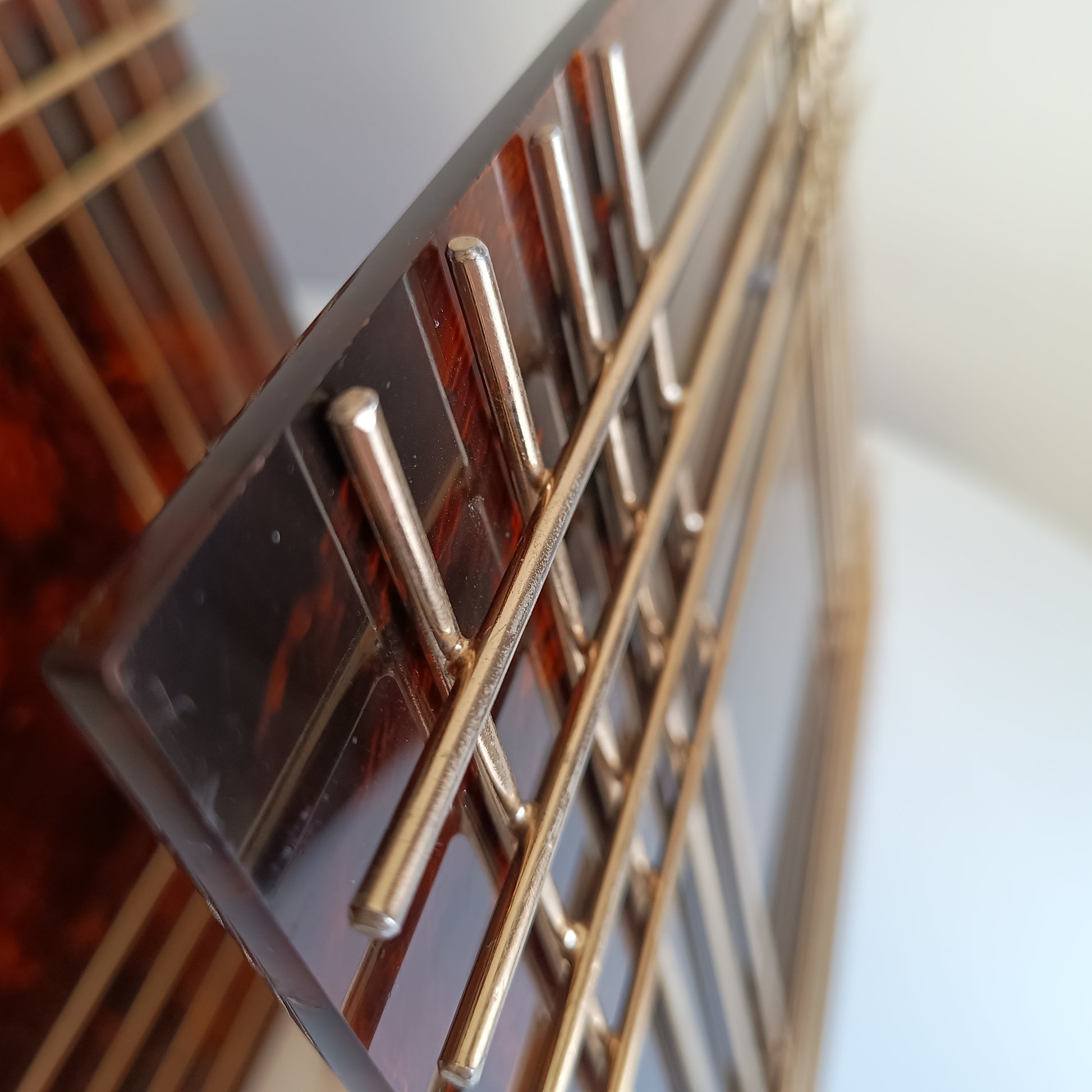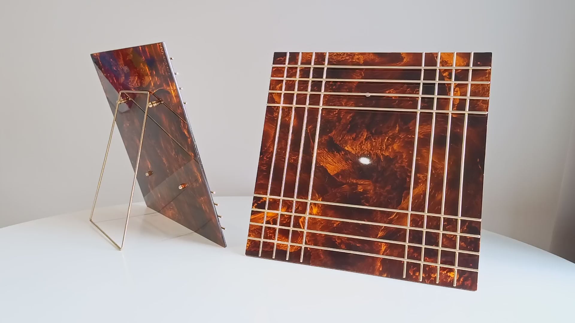 The panels are 4 mm glossy tortoiseshell lucite sheets with overlaid geometric grid of metal rods. The picture can be inserted from under the rods from the side, or from the bottom, into the central space, and is held in place by the rods. The panels are sculptural and they do not need to be used as frames - in fact, they look amazing as decorative panels in their own right.