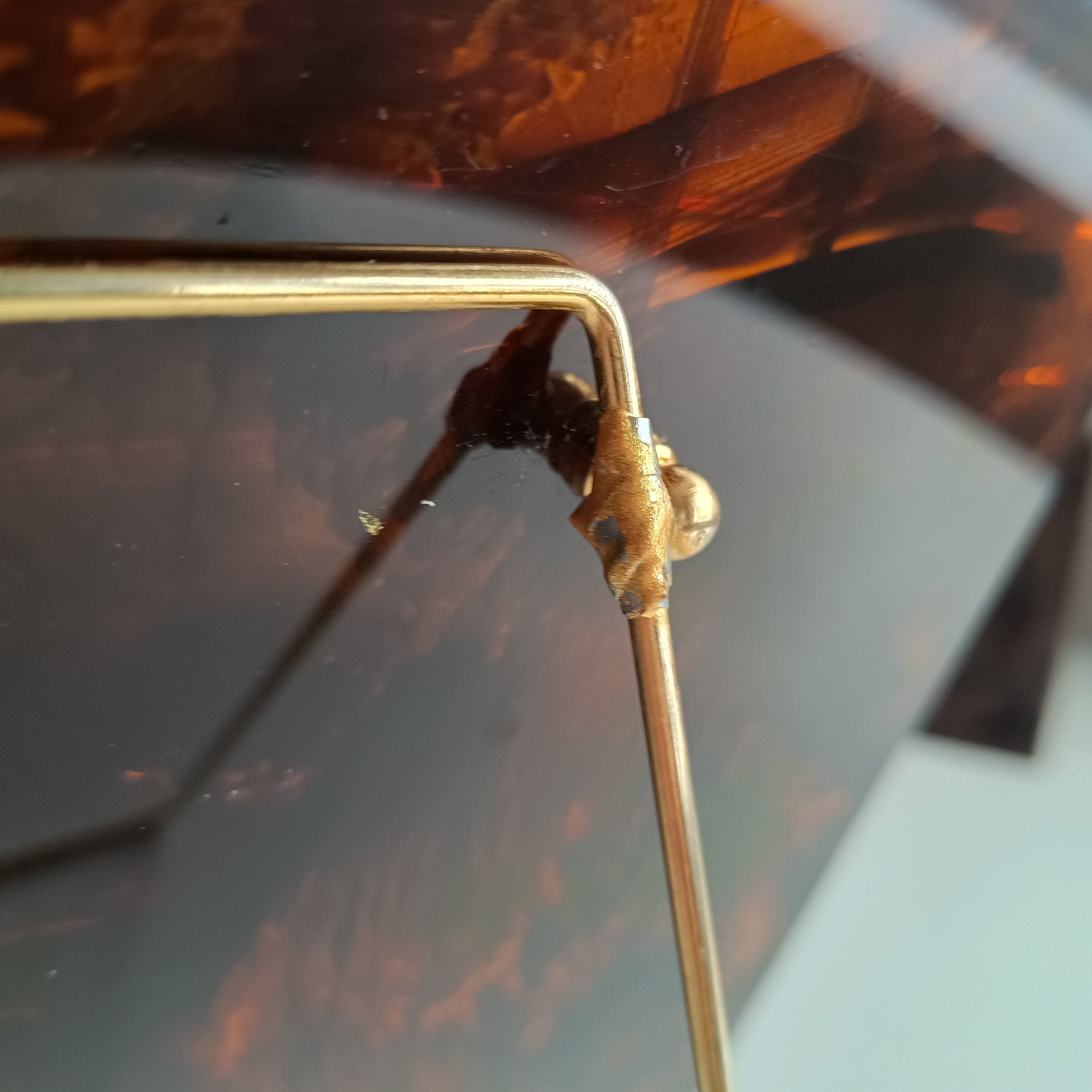 No makers mark foil stickers survived, but there is a ghost image of a sticker on the back. The Faux Tortoiseshell Lucite panel is light, bright, firm, and is in great condition, it has an almost glass-like feel.