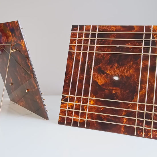 This is a stylish Pair of Midcentury Modern Tortoiseshell lucite tabletop panel frames, created using signature 1968-1978 minimal metal rod structure, and light modernist geometry, in the style of Christian Dior Home. The Frames are attributed to the Italian designer Gabriella Crespi. The pair is sold together as a set.