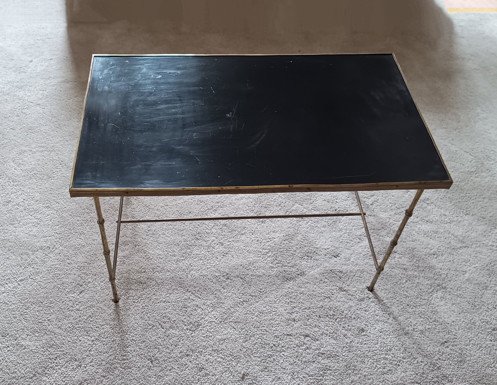 A chic mid-century French coffee table in the style of Maison Jansen and Baguès, featuring elegant patinated brass faux-bamboo legs and stretchers. The rectangular top is finished in black Formica laminate, edged with ribbed riveted brass banding for a textured, decorative touch.