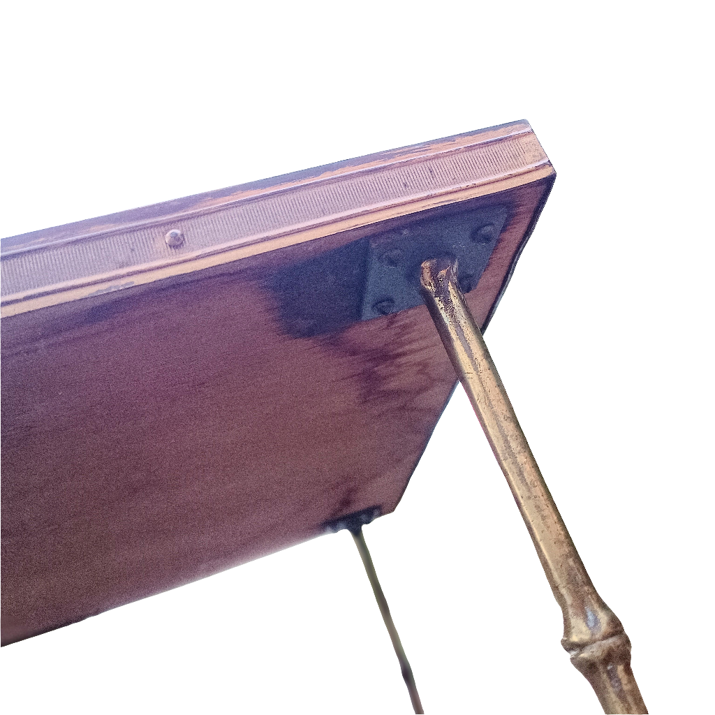 The frame is structurally reinforced with low side stretchers and a central cross bar. Underside in simple wood panel with brass leg mounts. Brass surfaces display an attractive, naturally aged patina.