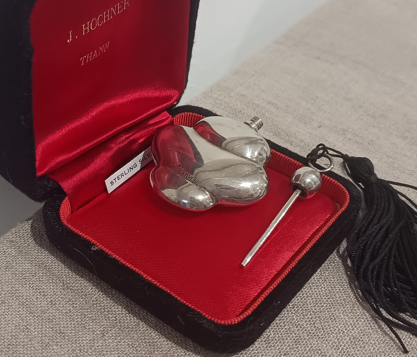 Little solid silver bottle with solid silver screw in cap and dipper. The cap has a ring to clip on to a chatelaine or to wear as a pendant.