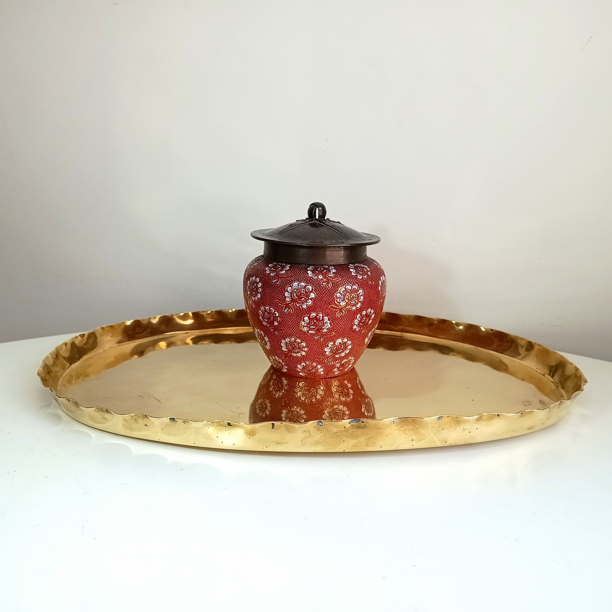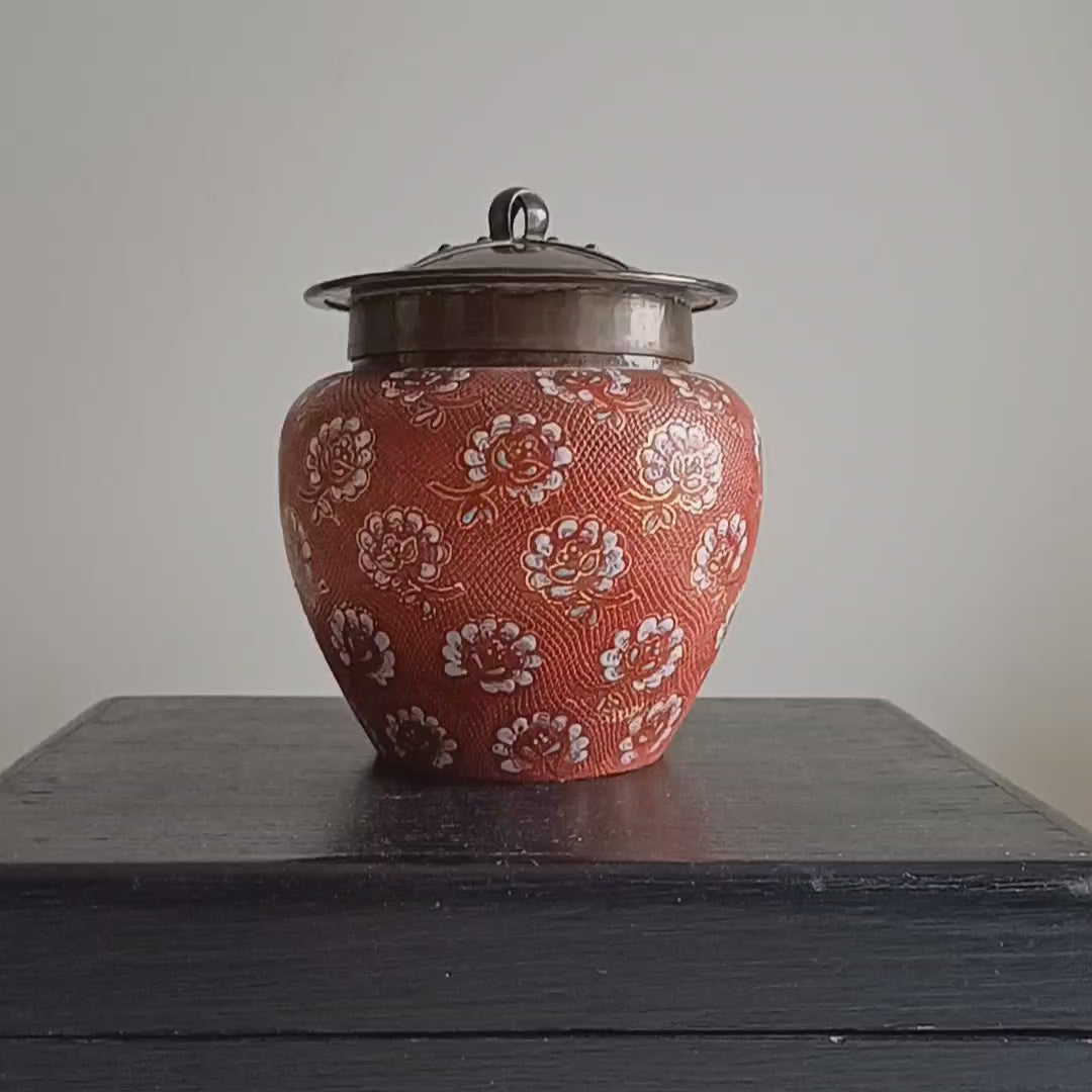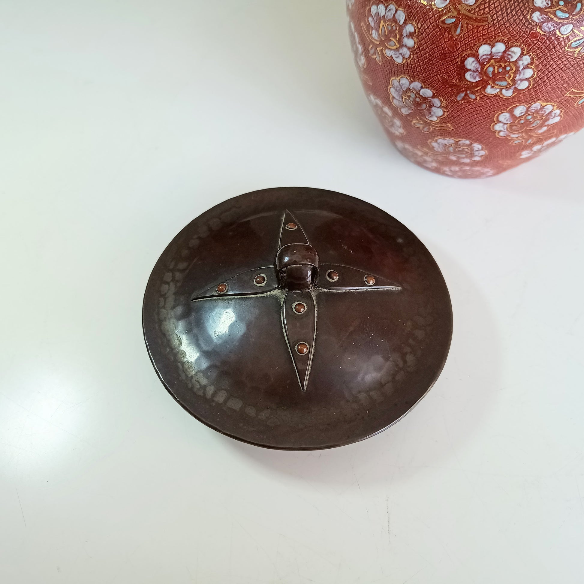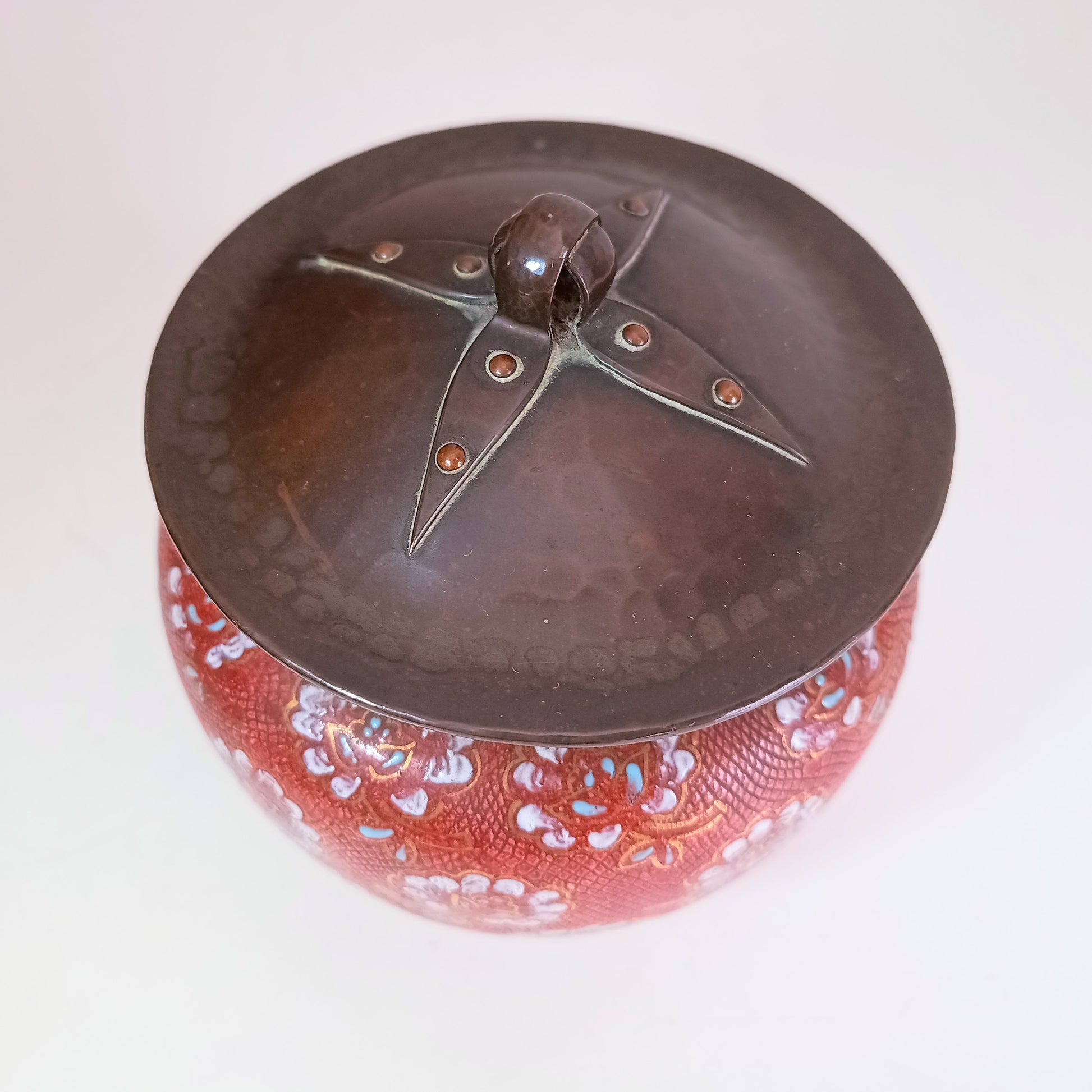 The jar is topped with a distinctive hammered Liberty style bronze lid — with a unique cross-shaped finial made from four metal strips, raised at the center and riveted to the lid in true Arts and Crafts fashion. The lid’s architectural form and craftsmanship reflect the influence of renowned design houses like Liberty & Co. and the ethos of handcrafted utility. The bronze