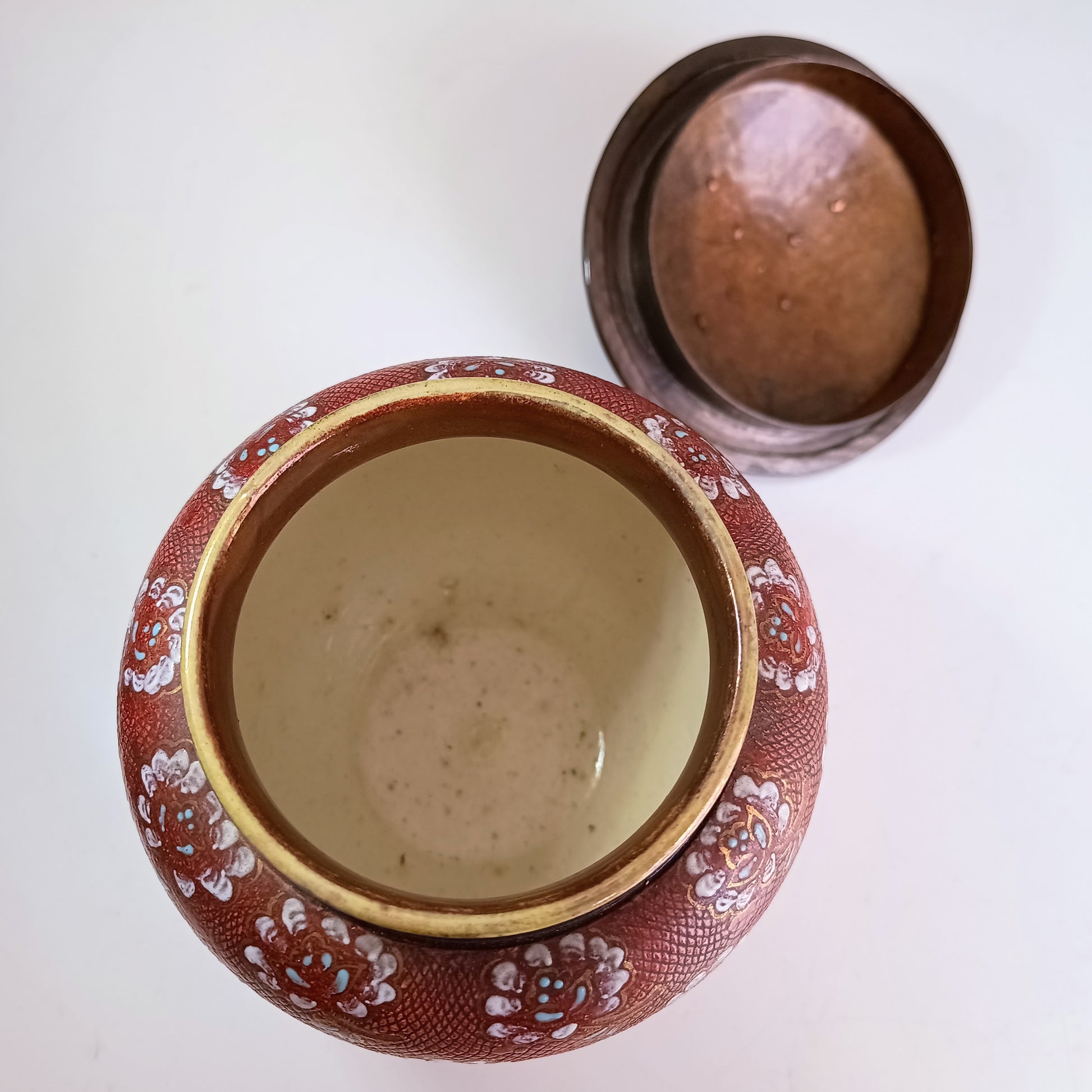 Excellent antique condition. The ceramic surface is clean and well-preserved with no cracks or chips. The metal lid shows a beautiful natural patina, consistent with age. Some minor wear expected for a piece of this age, such as flee bite in the bottom rim. The bronze lid fits beautifully on the neck of the jar.