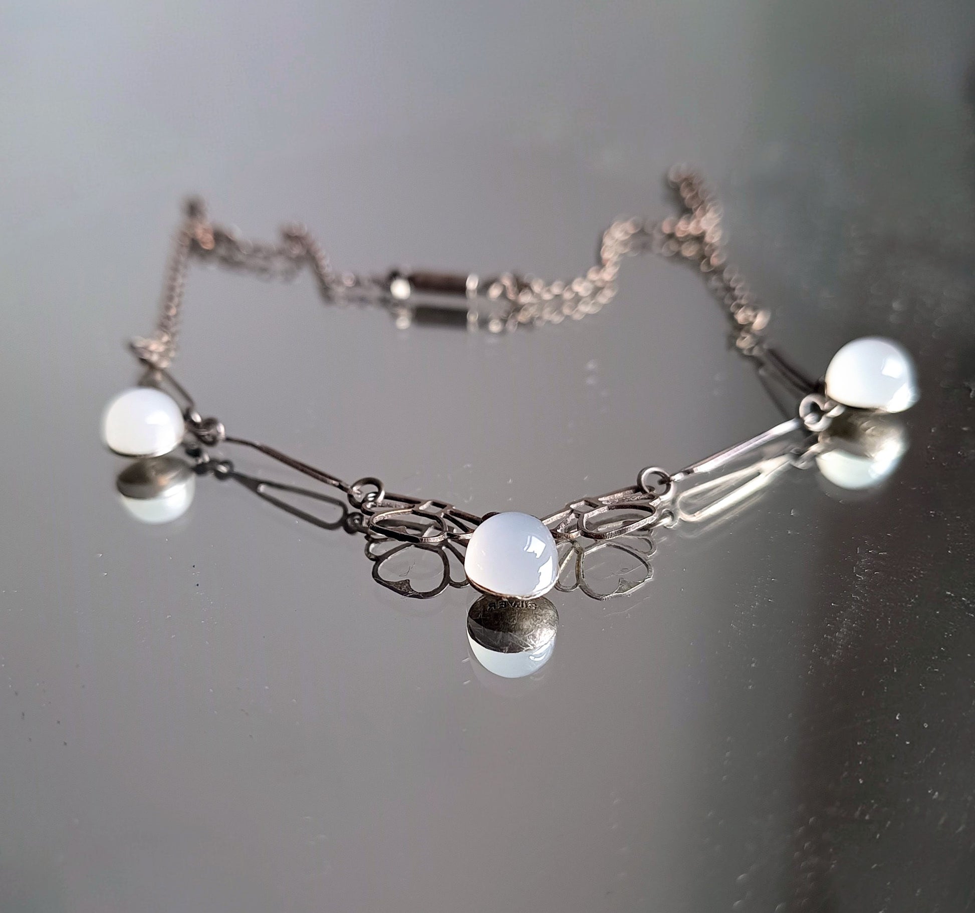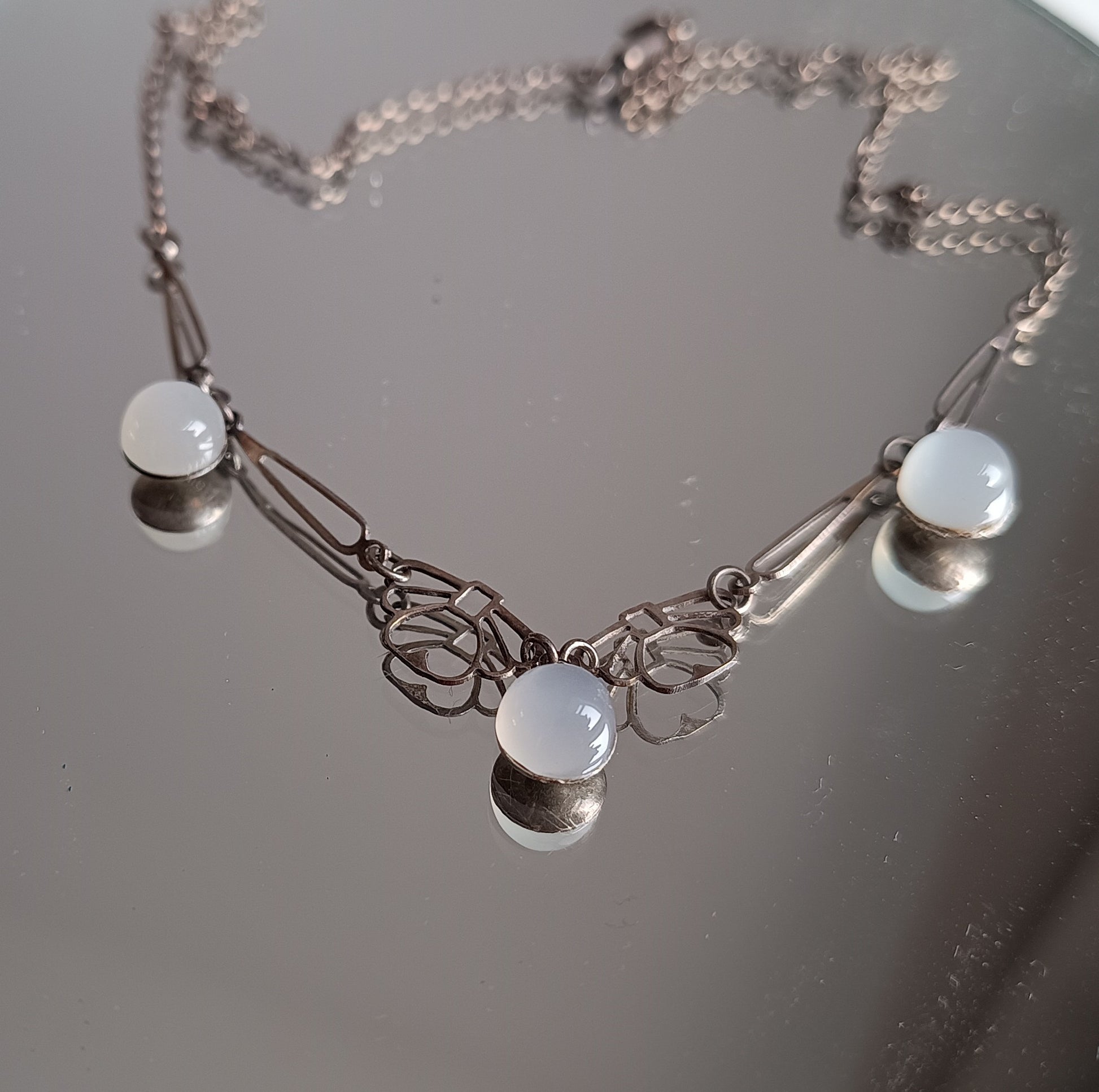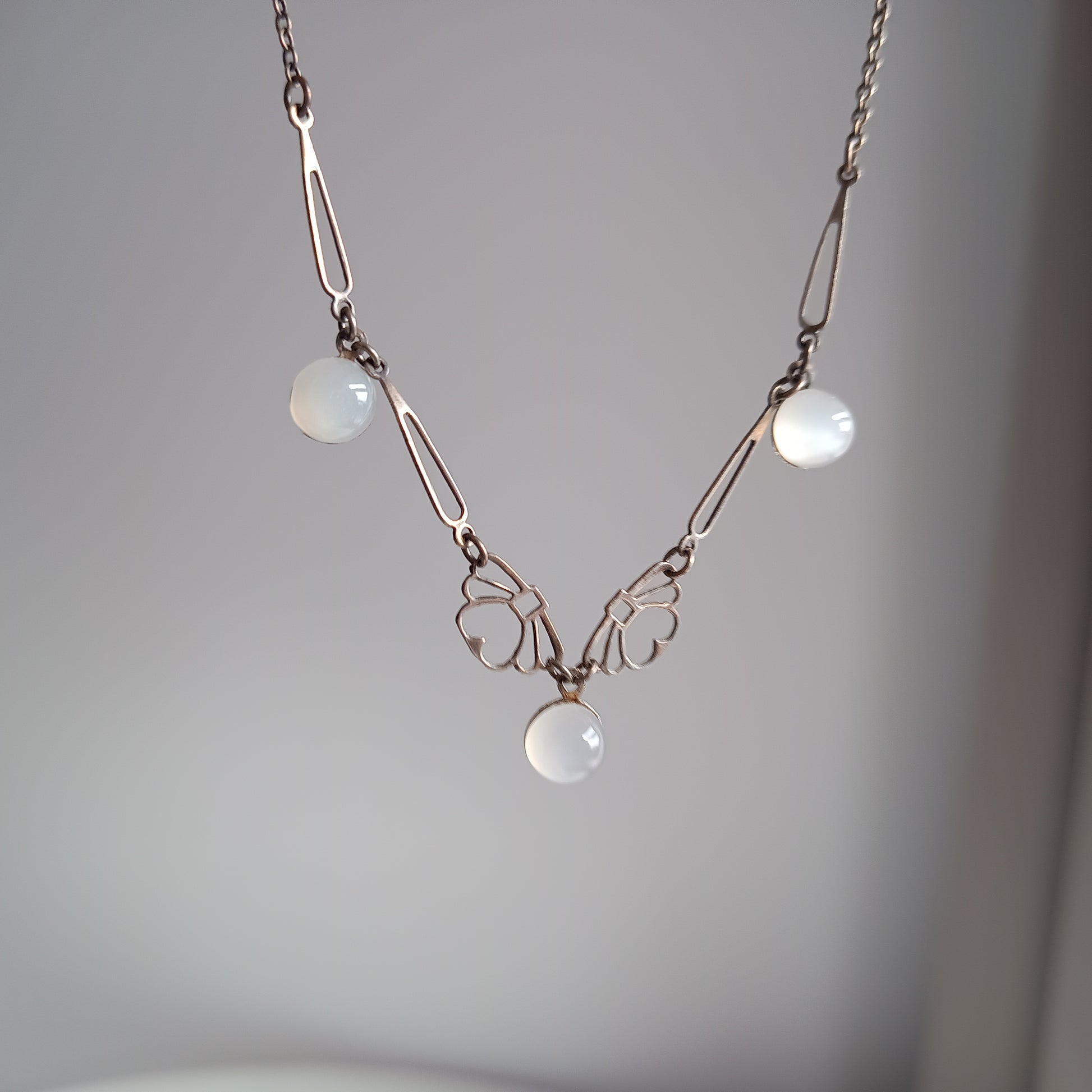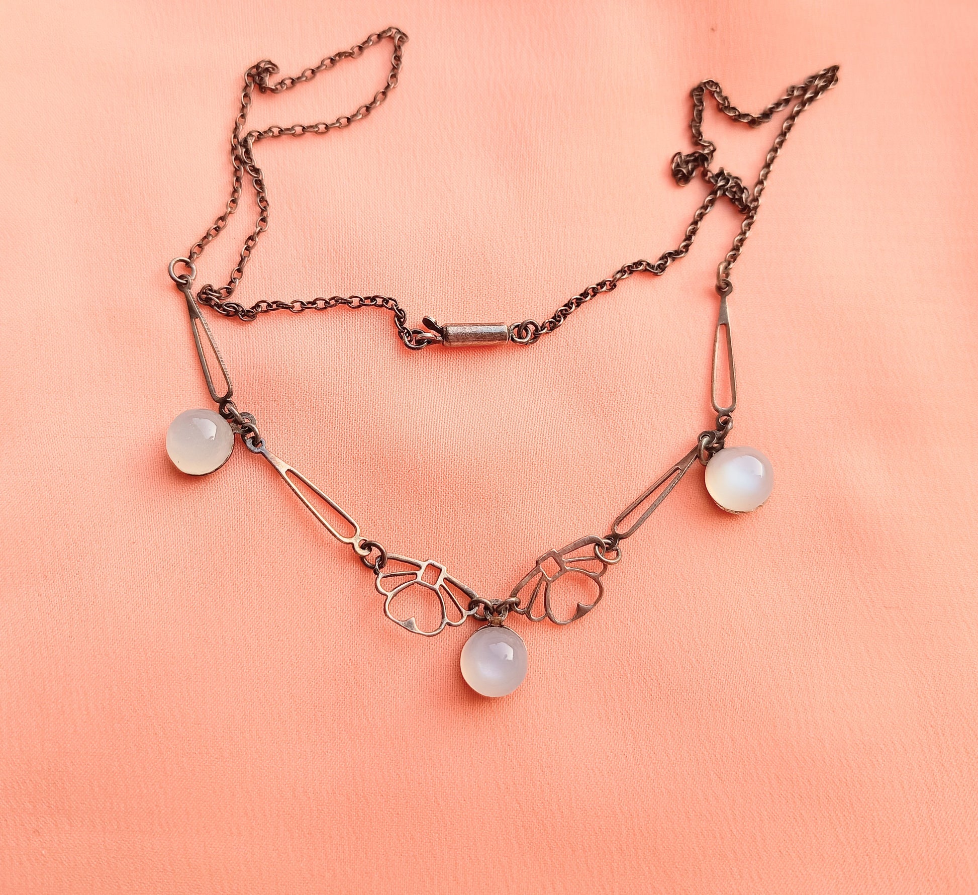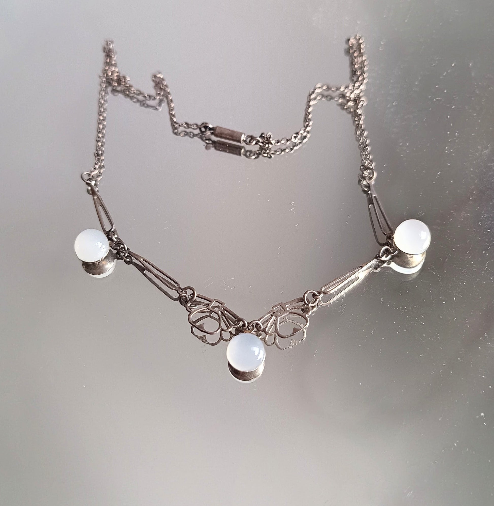 Art Deco silver necklace dating to the beginning of the 20th century, set with three natural moonstone flat-back cabochons in closed silver cup settings. The stones have domed tops and display the subtle adularescent glow typical of moonstone.