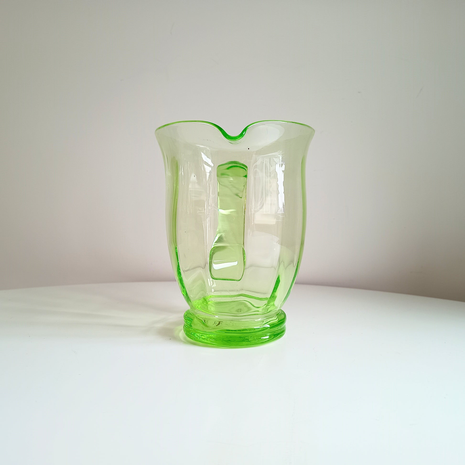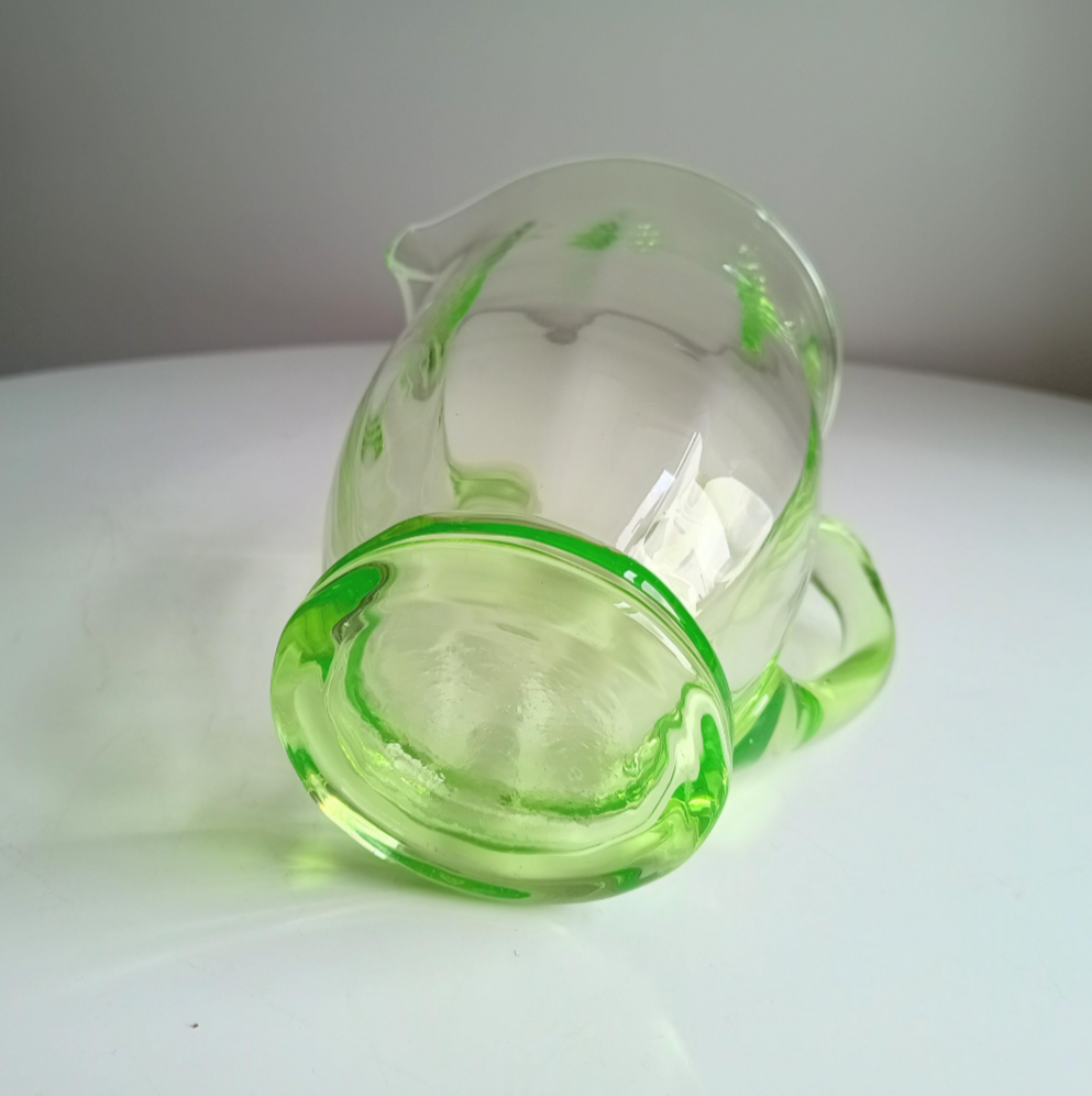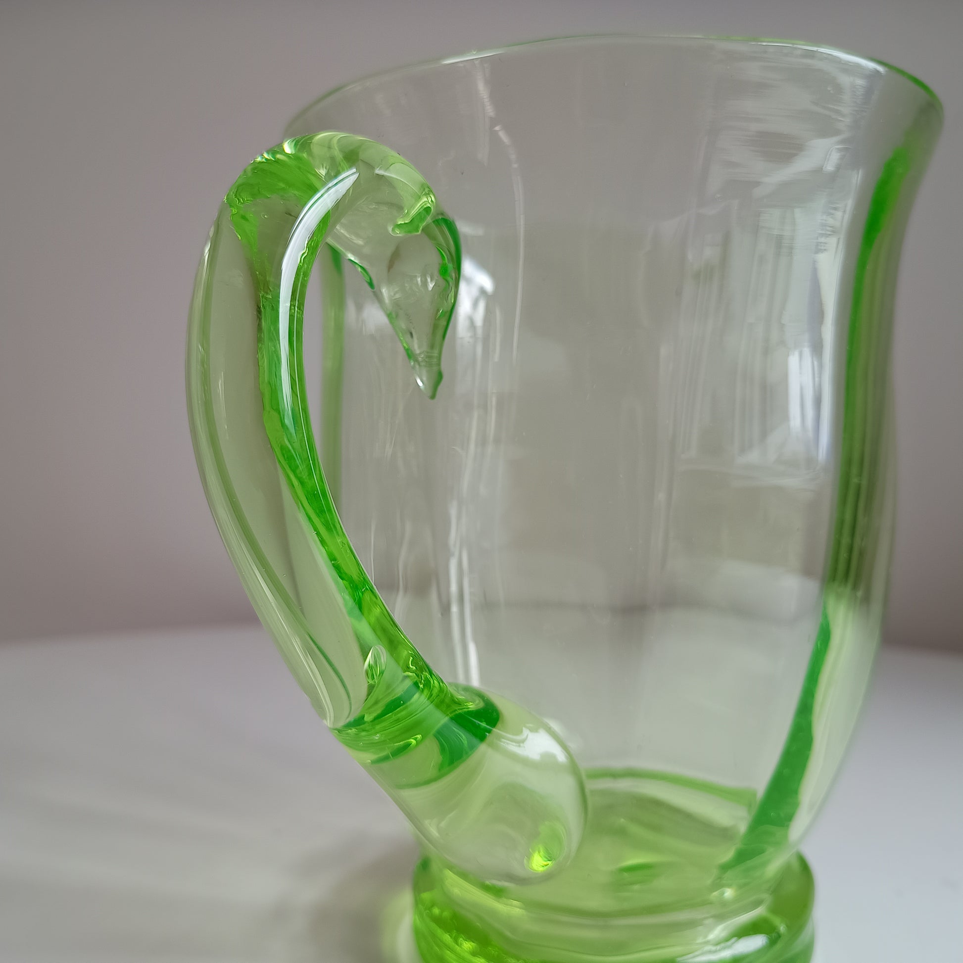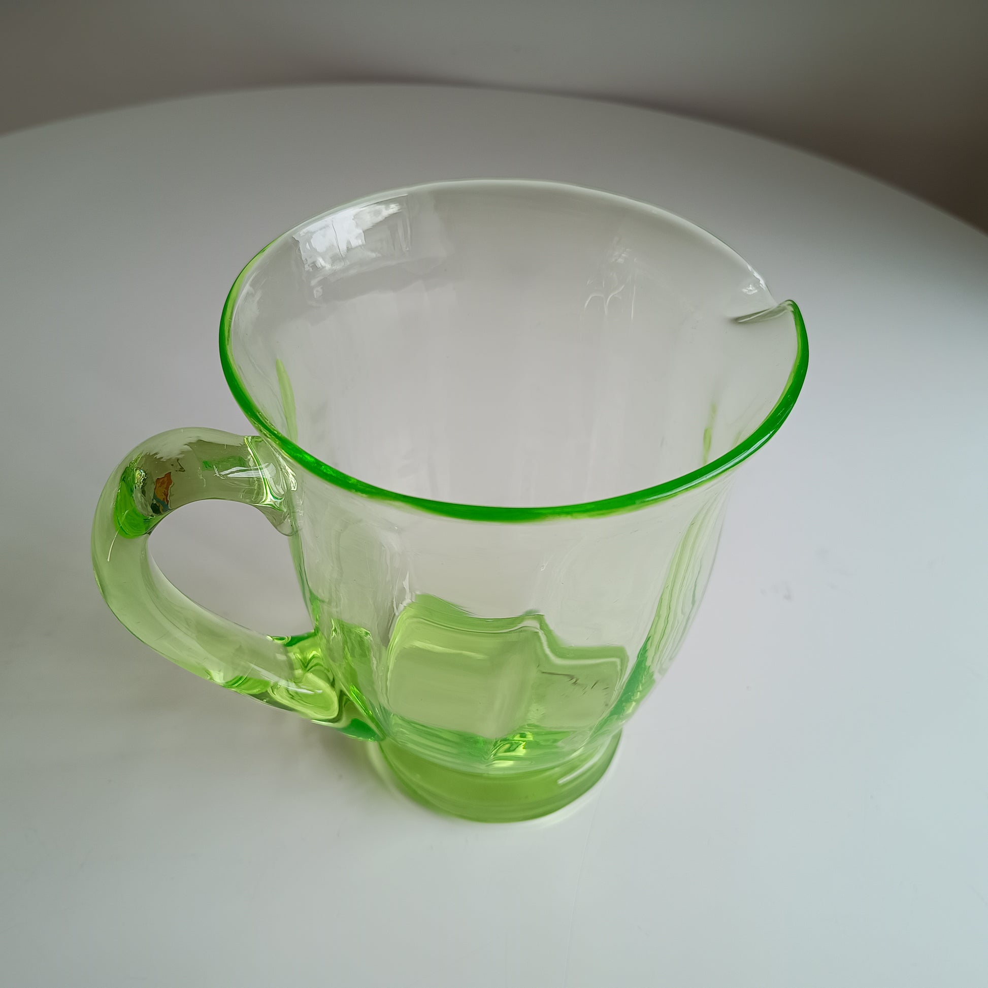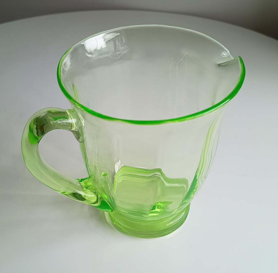Genuine Vintage English Art Deco Blown Uranium Optic Glass Lemonade / Juice Jug / Pitcher With Handle, 1930s