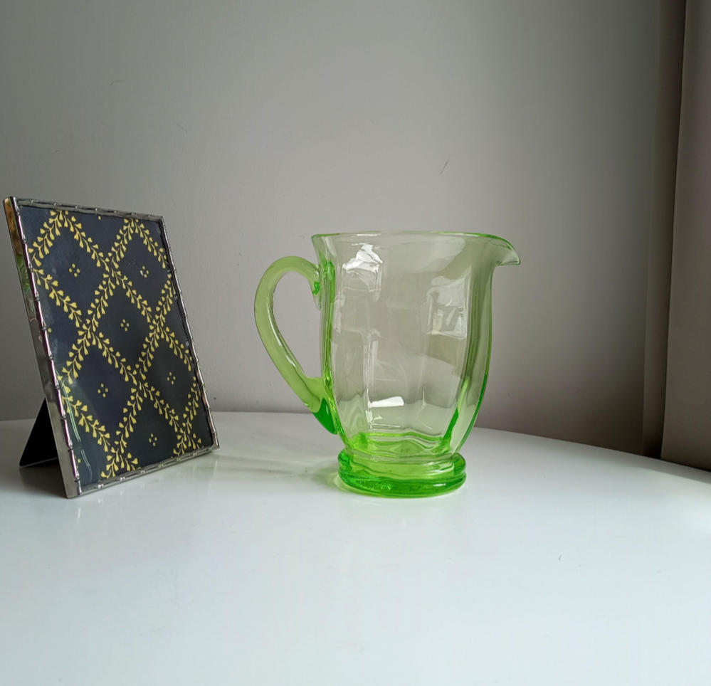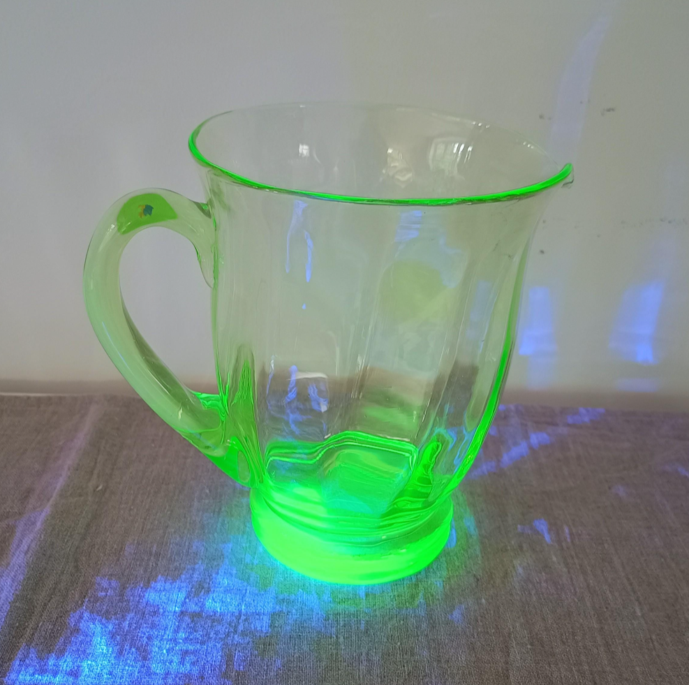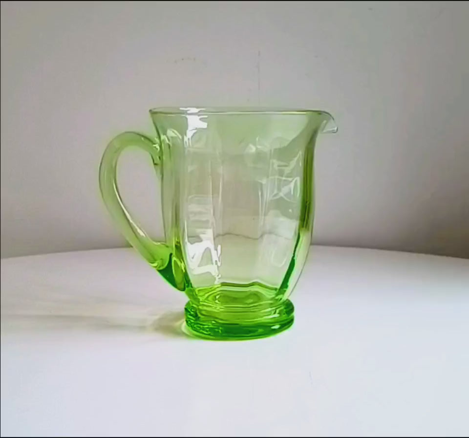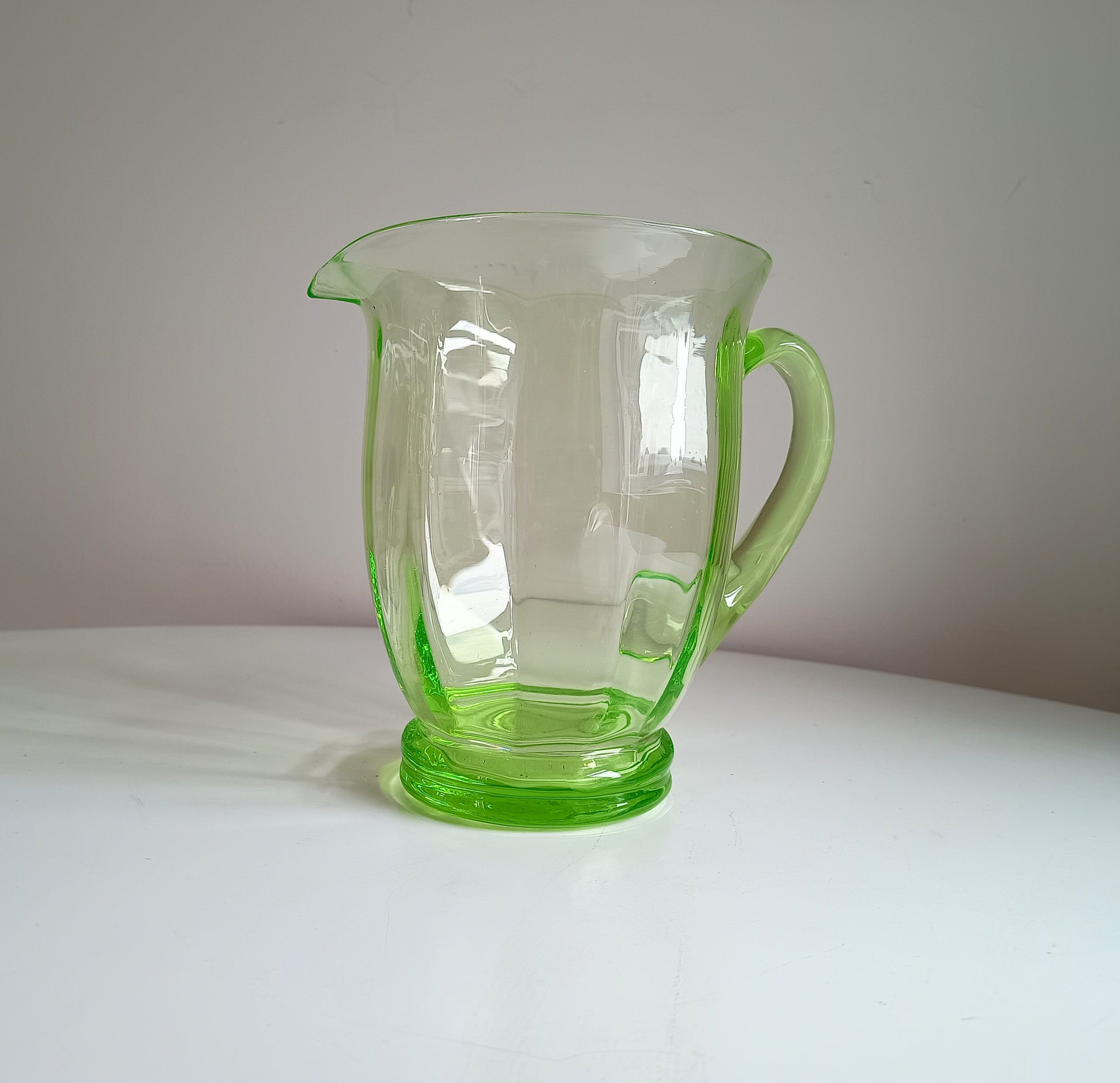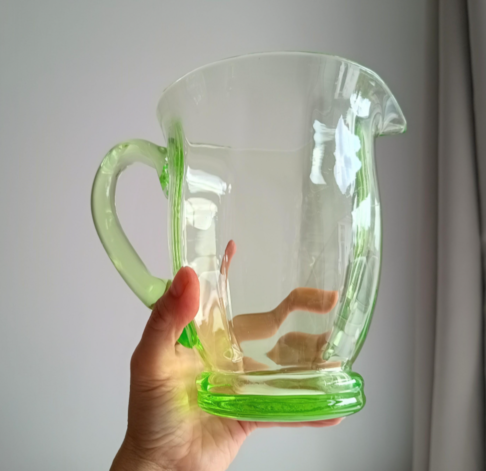 Genuine Vintage English Art Deco Blown Uranium Optic Glass Lemonade / Juice Jug / Pitcher With Handle, 1930s