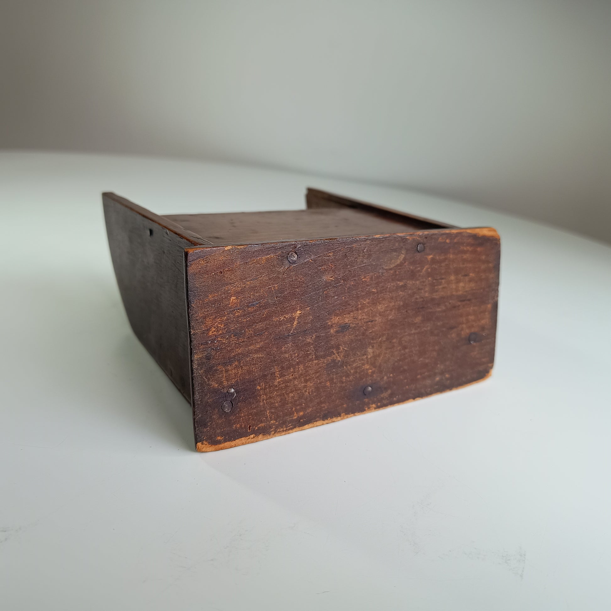 It measures approximately 4 1/2 by 4 by 3 inches, or 12.5x6x13 cm - it is lightweight and easy to reposition. It stands slightly declined backwards and has two divided departments and front brass decor panel. The bottom is probably stained pine or similar, the sides and front are antique oak.