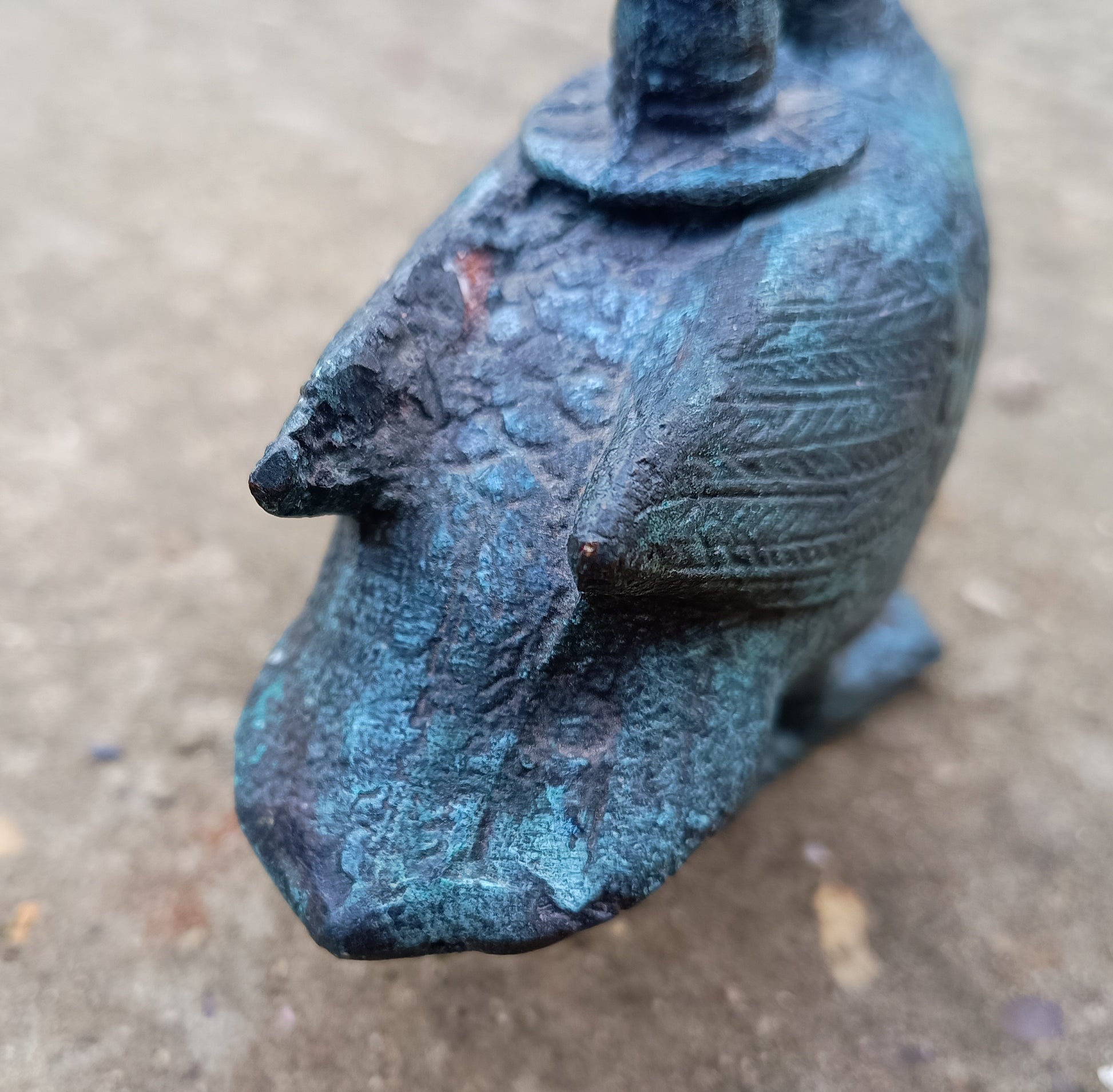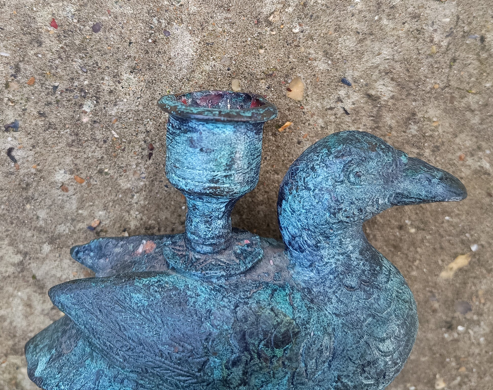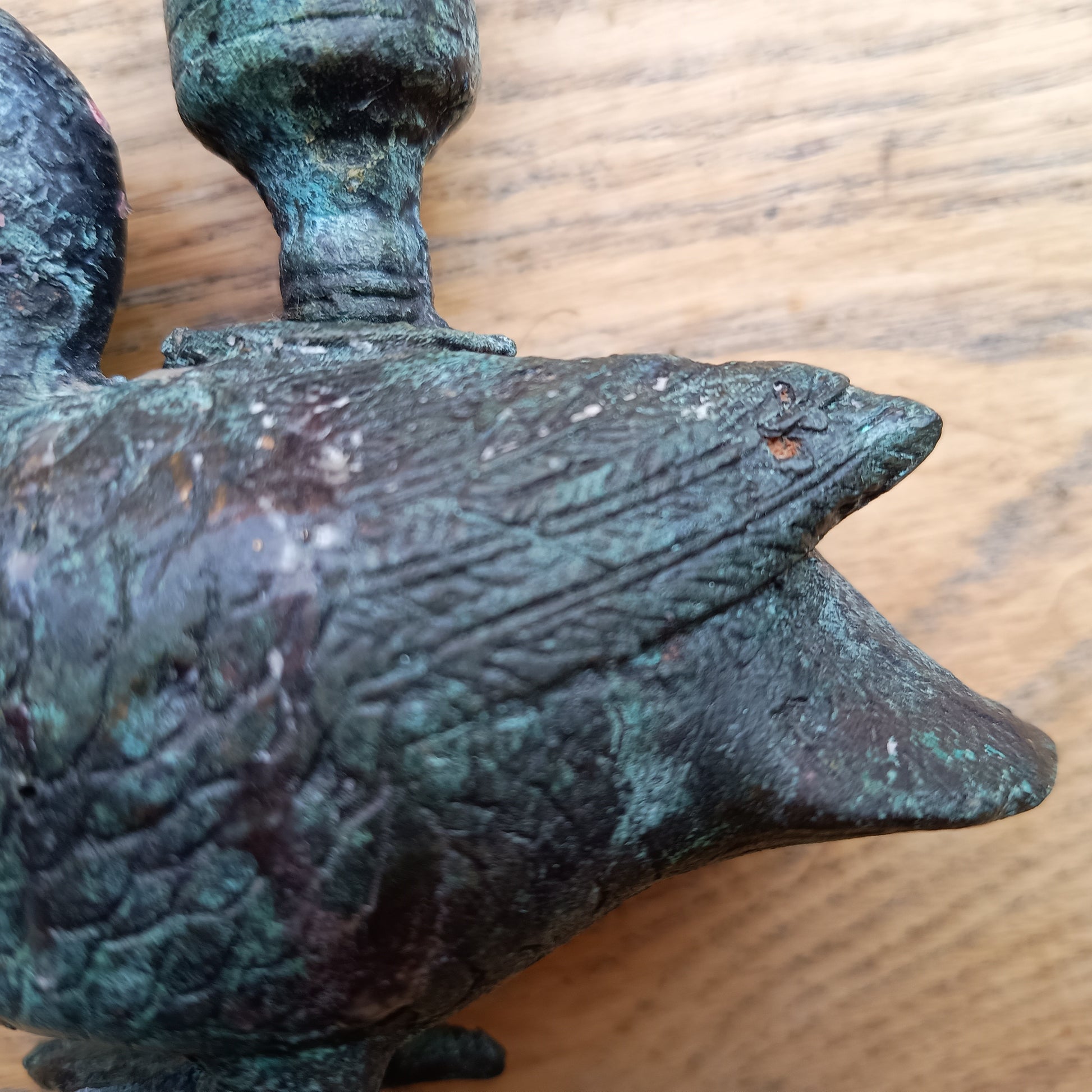 Genuine hand made Zoomorphic candlestick in the form of a duck, with natural verdigris and cuprite oxidation — authentic provincial domestic bronze of pre-industrial manufacture. About 12 cm by 10 cm by 5 cm. Weight is about 460 g.