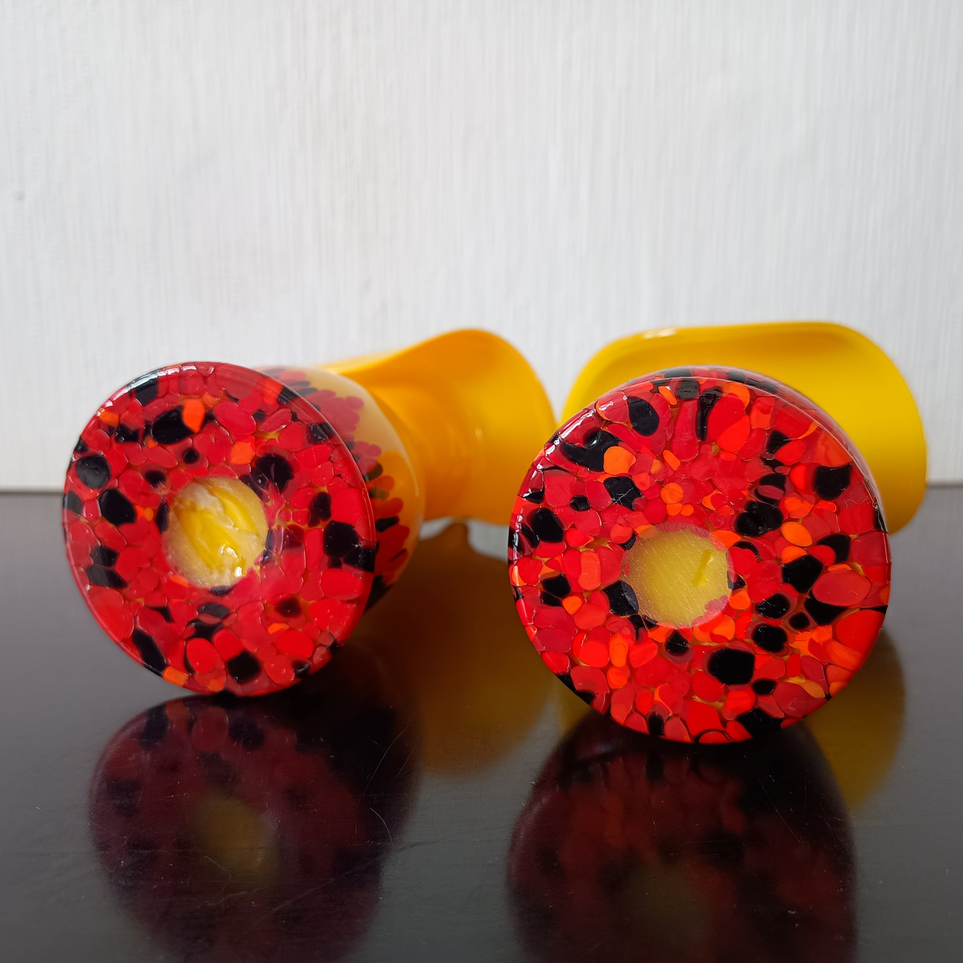 These Tango Glass pieces feature a vibrant cased-yellow body with a dramatic red, orange, and black "confetti" spatter base.