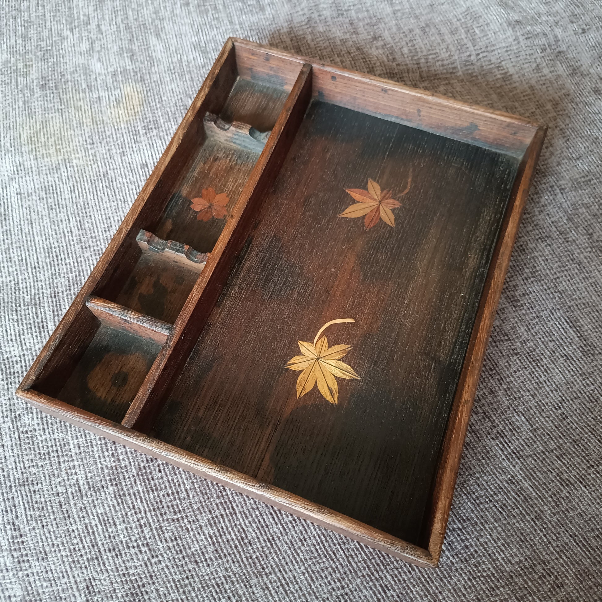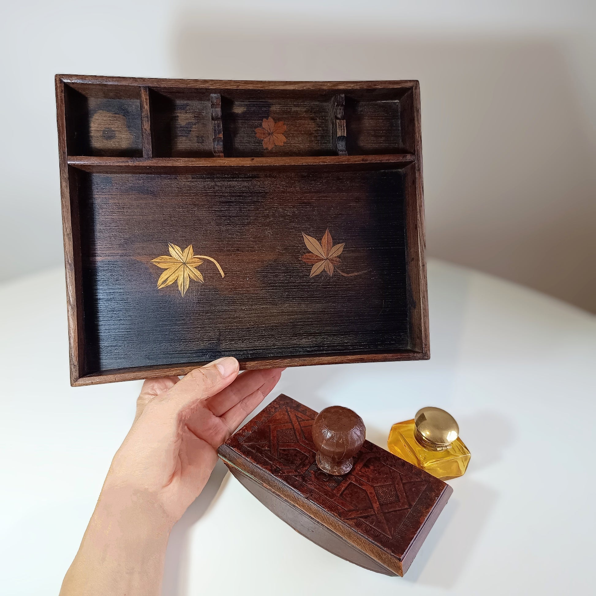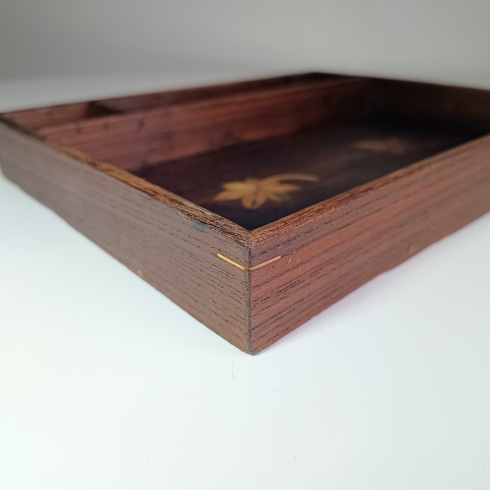 Late Victorian Belle Epoque Aesthetic Movement Hardwood Inlay Pen Tray, or Stationary Box, constructed with only wooden joinery. The fine mitred corners are made with keyed spline reinforcement in contrasting wood (visible on the photos) which is a hallmark of skilled cabinetmaking found in Continental European work, likely France or Austria. The parts are held together by visible round wooden dowel pins, no nails used. The tray has a vertical-grain softwood bottom panel.