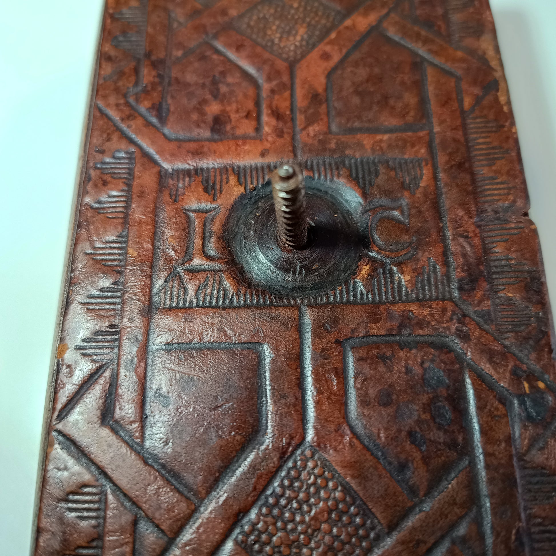 The blotter is Arts and Crafts Edwardian Celtic Style. It is wrapped in embossed leather and monogrammed LC. It is in good vintage condition with small loss of leather on the side corner. It has embossed initials on top - LC. It is 6 inches long x 3 inches wide x 3 1/2 high.