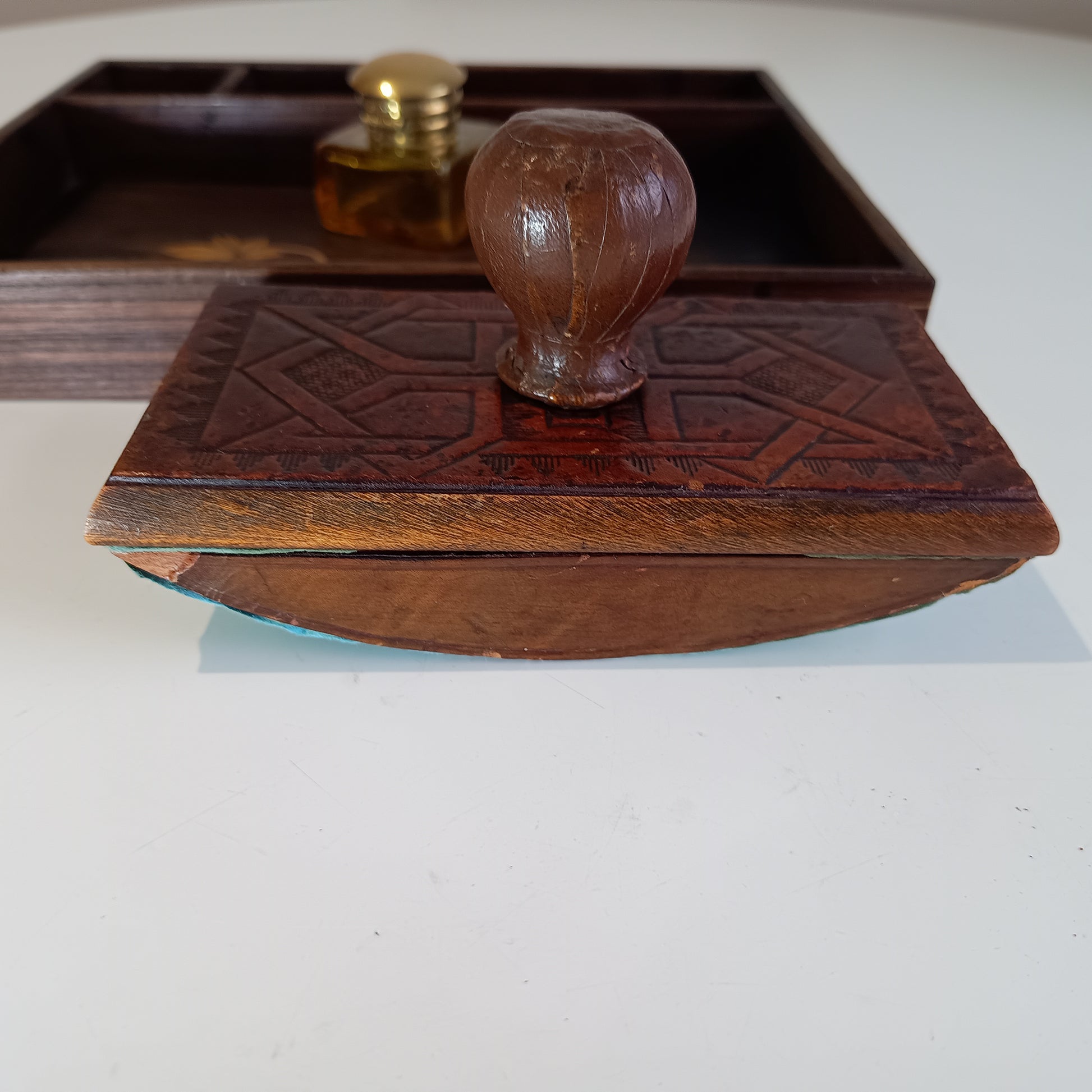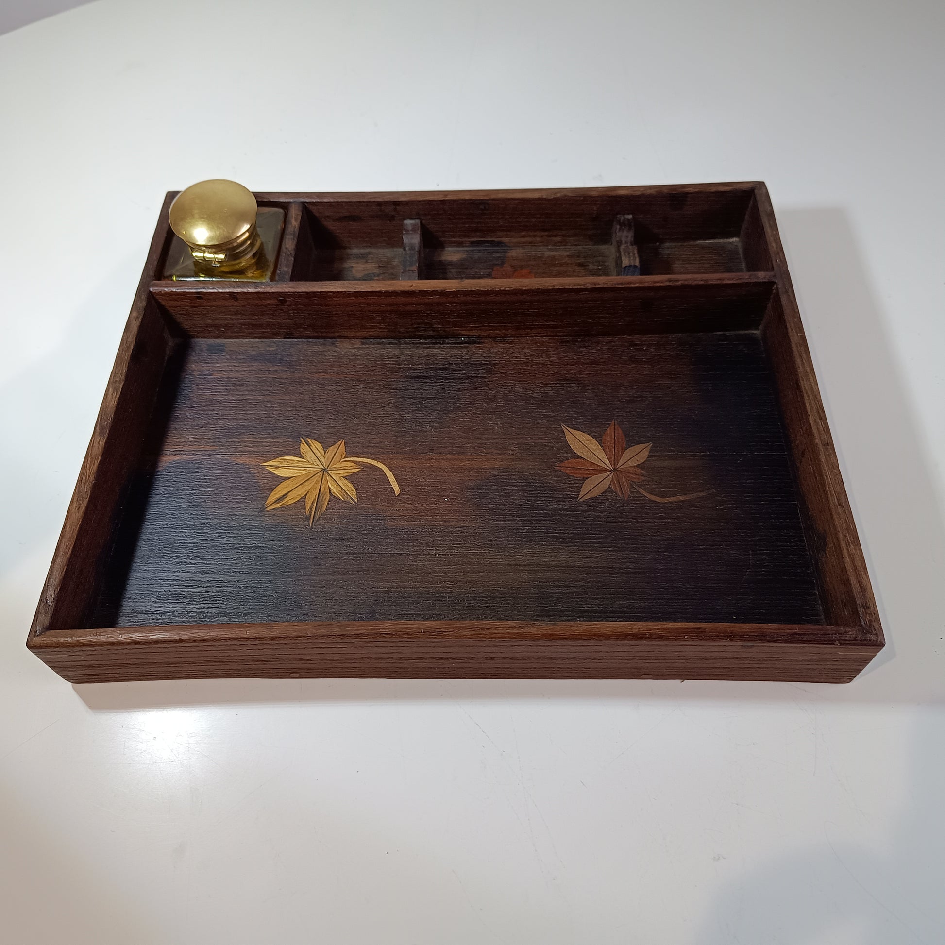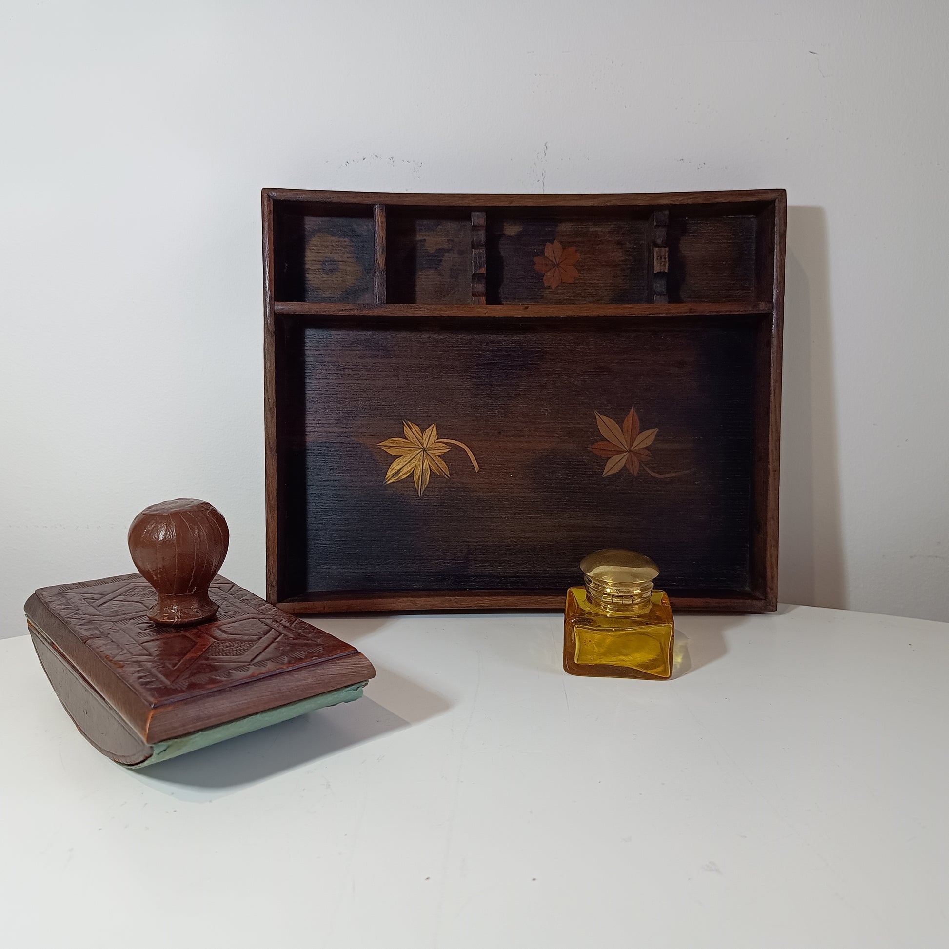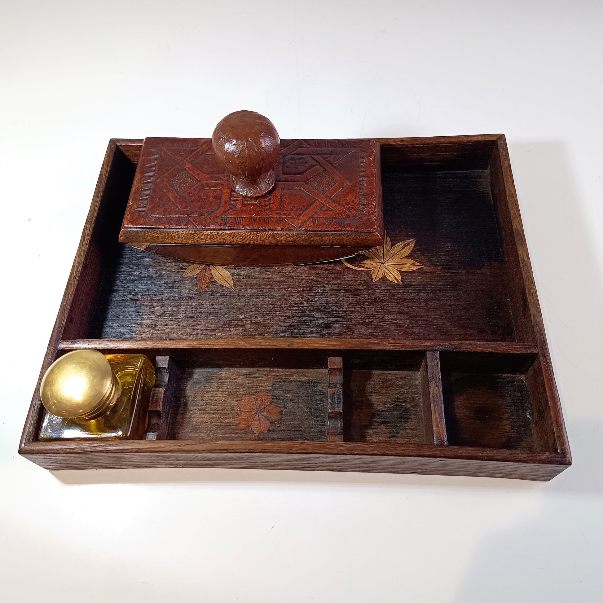 Quality French Belle Epoque Japonisme Desk Tidy Wooden Inlay Pen Stand with Yellow Glass Ink Bottle and Embossed Leather Blotter 1890s