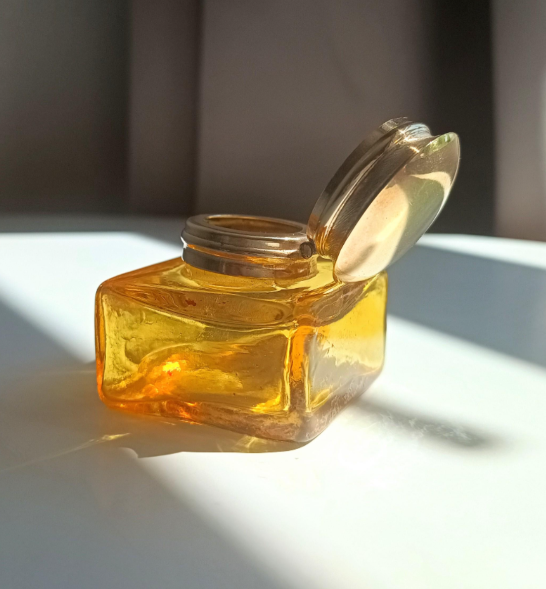 The inkwell is hand moulded French intensely coloured yellow glass with hinged polished brass. It is in good condition with miniature speckles/dust, no cracks, no dents. It displays light fluorescence in UV light so circa 1890-1900. Possibly by Pantin Crystal Works, France. It is about 6 cm or 2.3 inches tall.