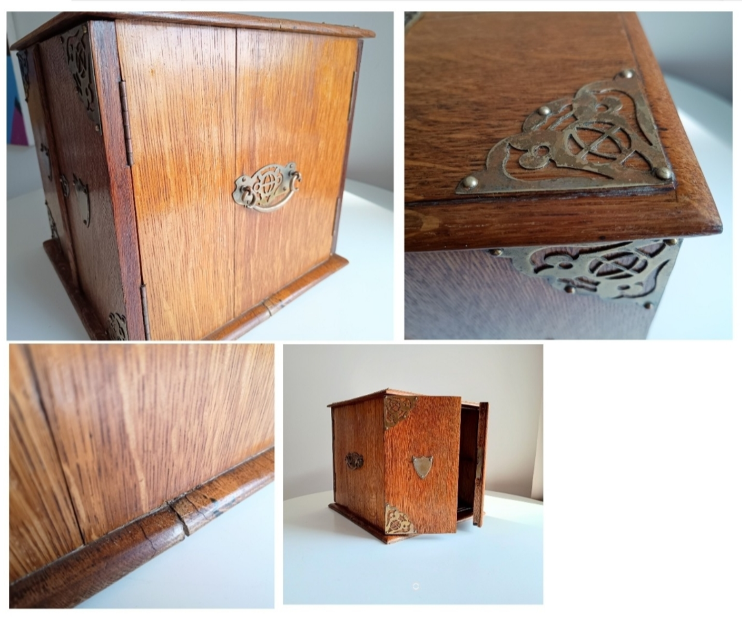 Constructed with solid quarter-sawn golden oak and finished with finely detailed metal mounts, this cabinet features double doors front and back, opening to reveal a deceptively simple front interior with a couple of thin dividers — until closer inspection reveals a false back velvet clad panel concealing a hidden compartment perfectly sized for two square-bottom whisky decanters, each would be sized about 3 1/2 to 4 inches wide 10 inches tall.