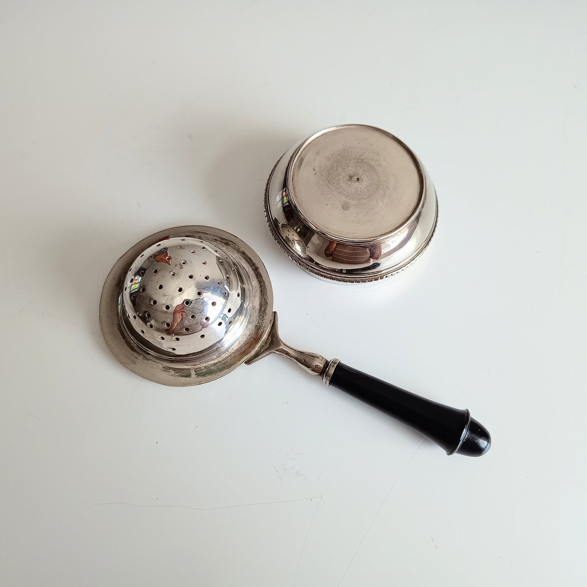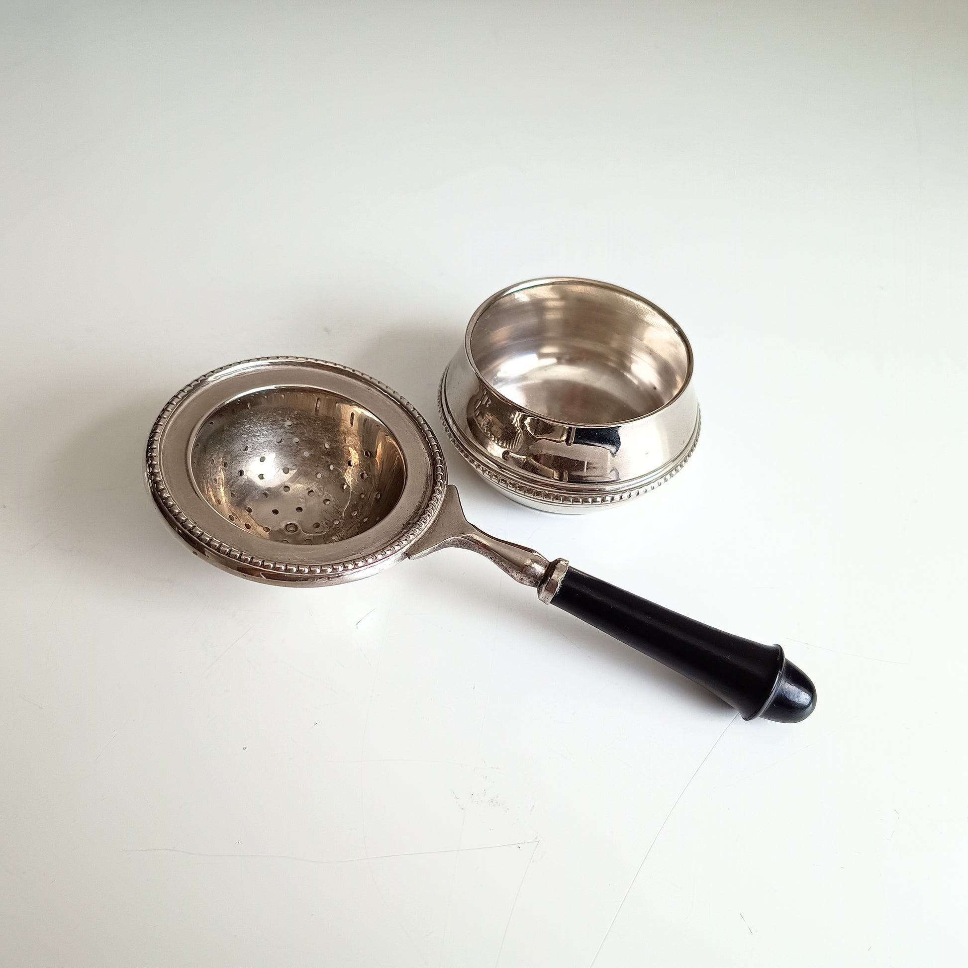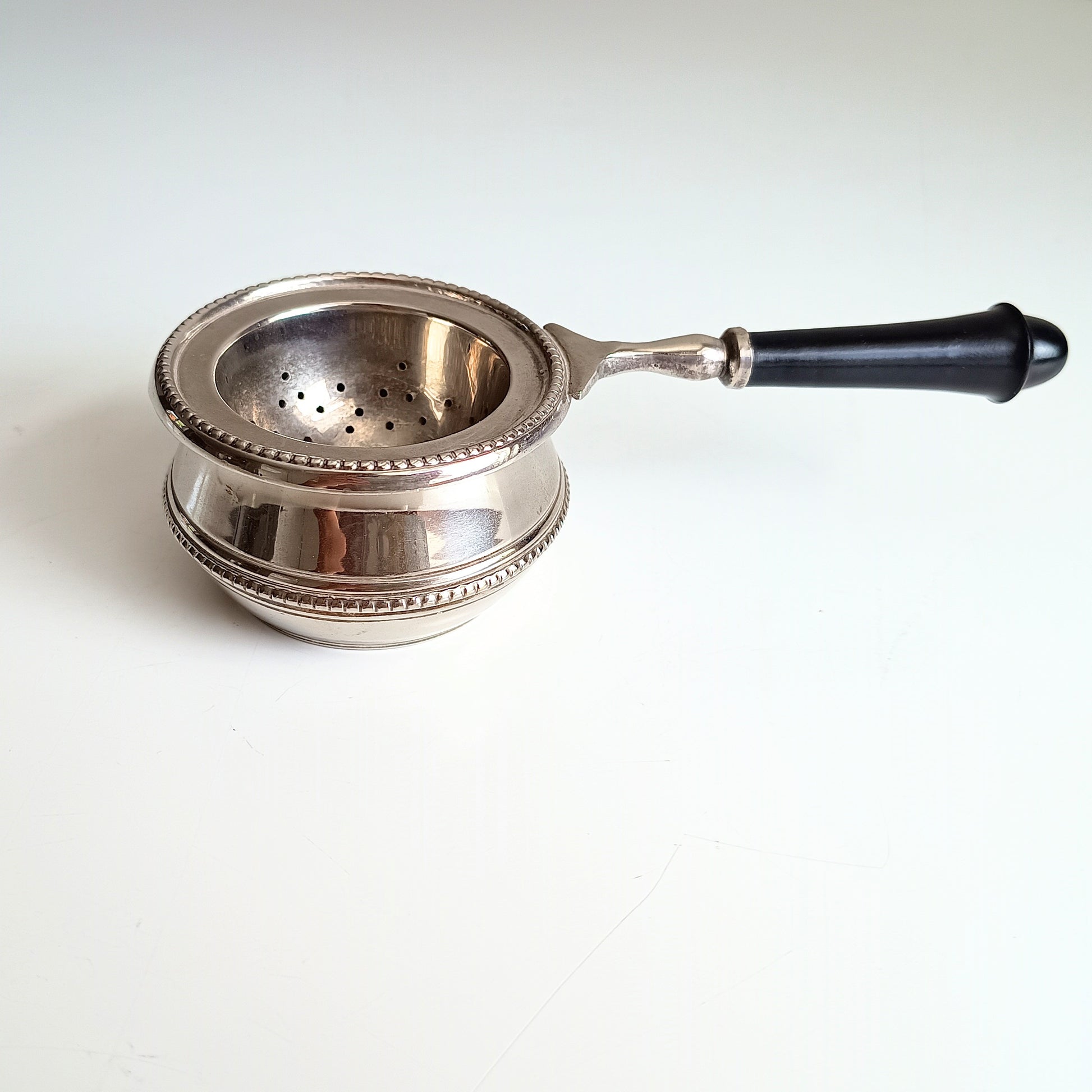 Good quality silver plated two part tea strainer made in, probably, 1980s, in art deco style. Lovely smooth black handle made of what looks blackened hardwood.