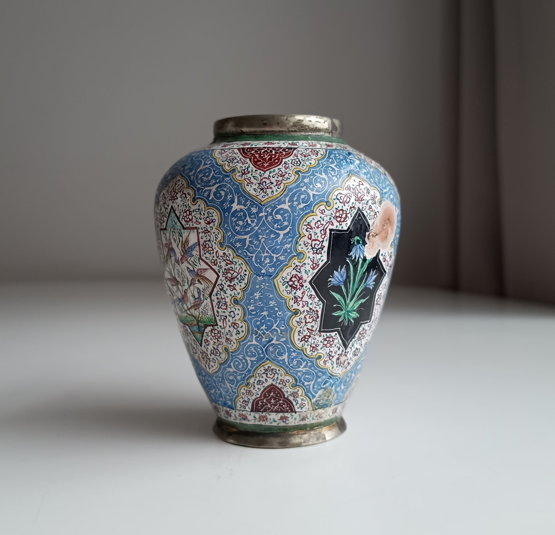 Antique Persian Enamel on Copper Vase: Birds Ornament, Isfahan Qajar Period c 1900s
