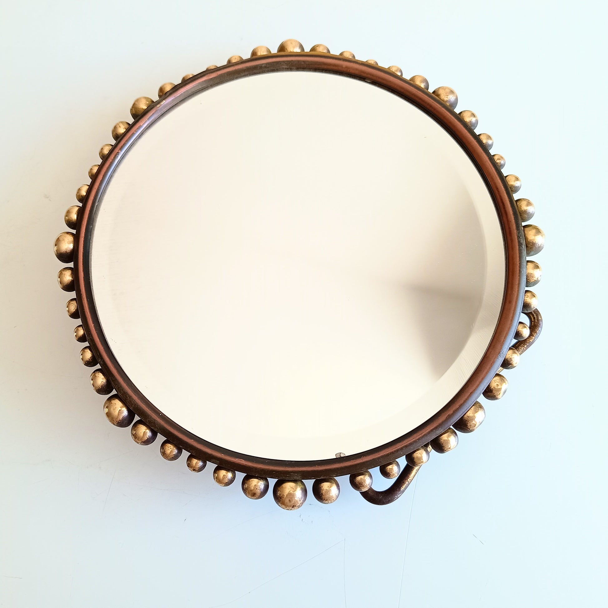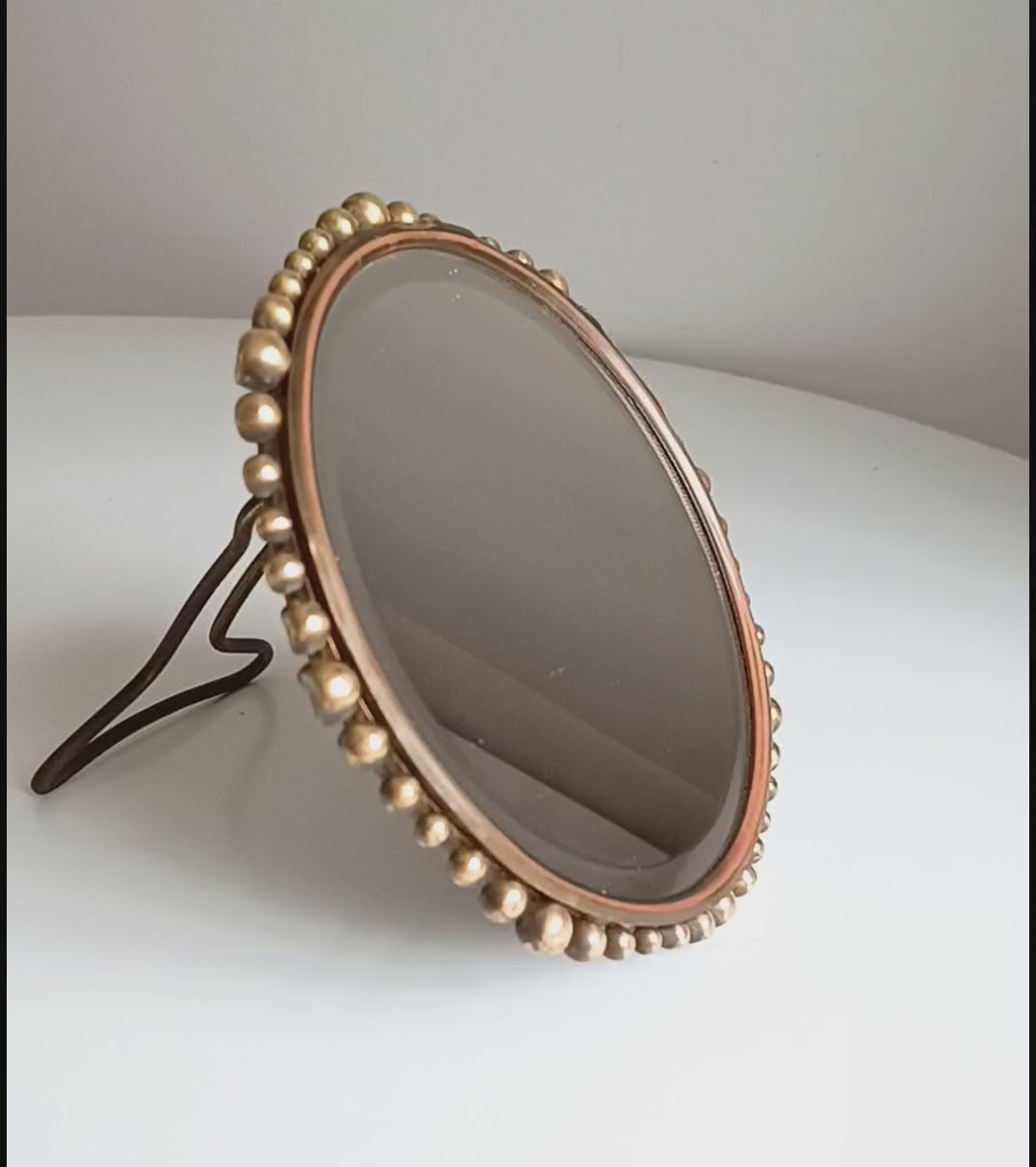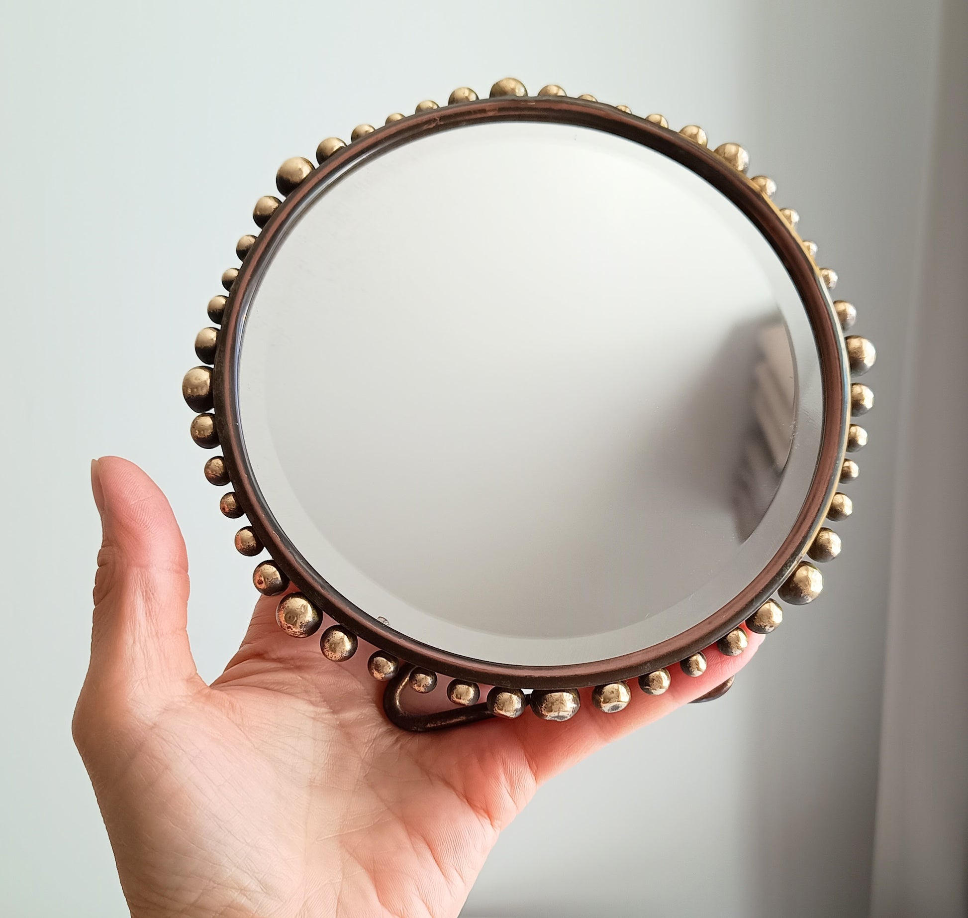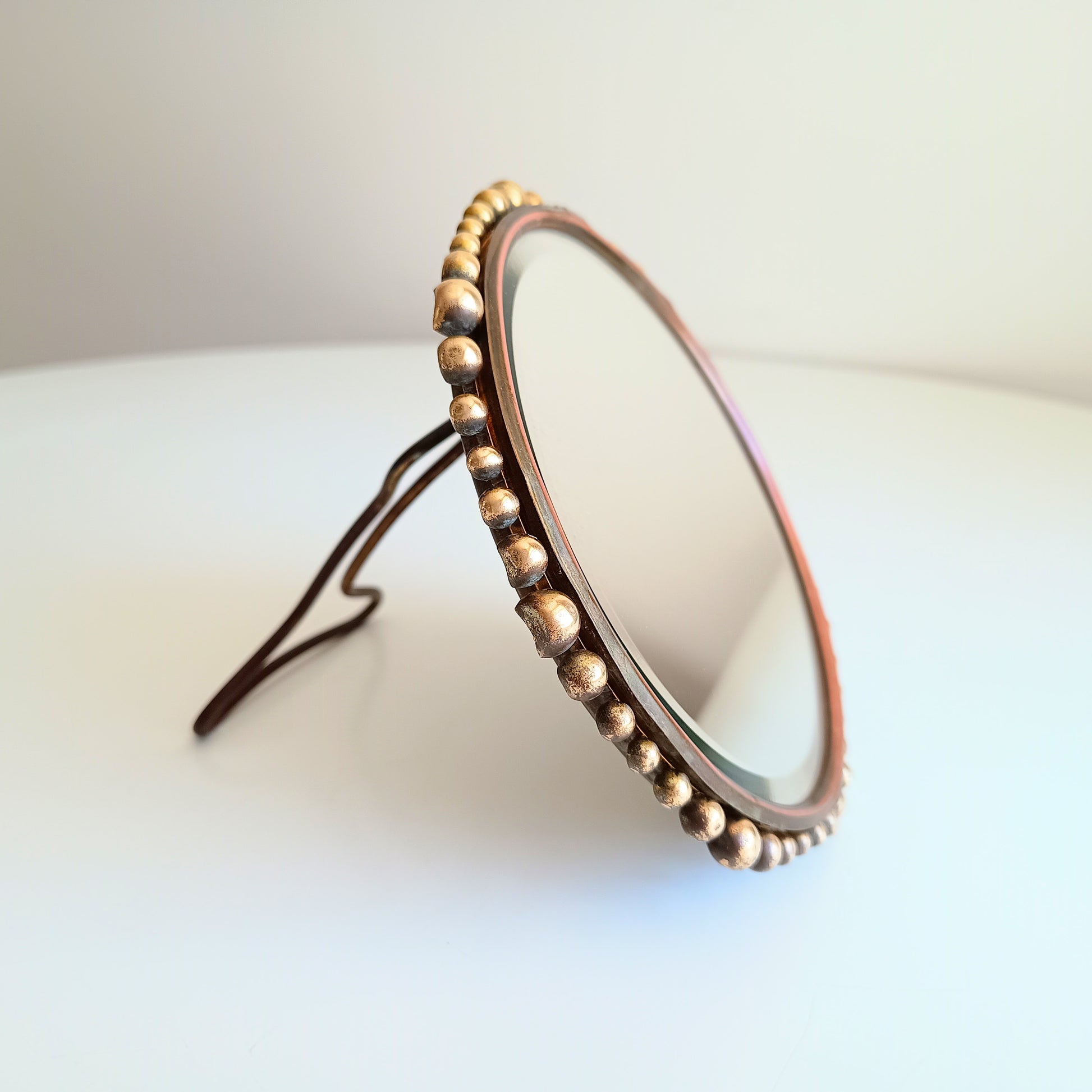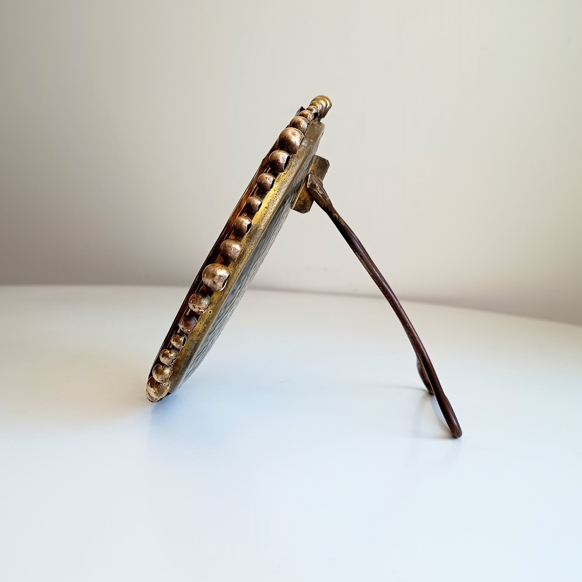 Small vintage brass table mirror or boudoir vanity mirror with a hand-hammered backplate and applied brass ball beading around the edge.