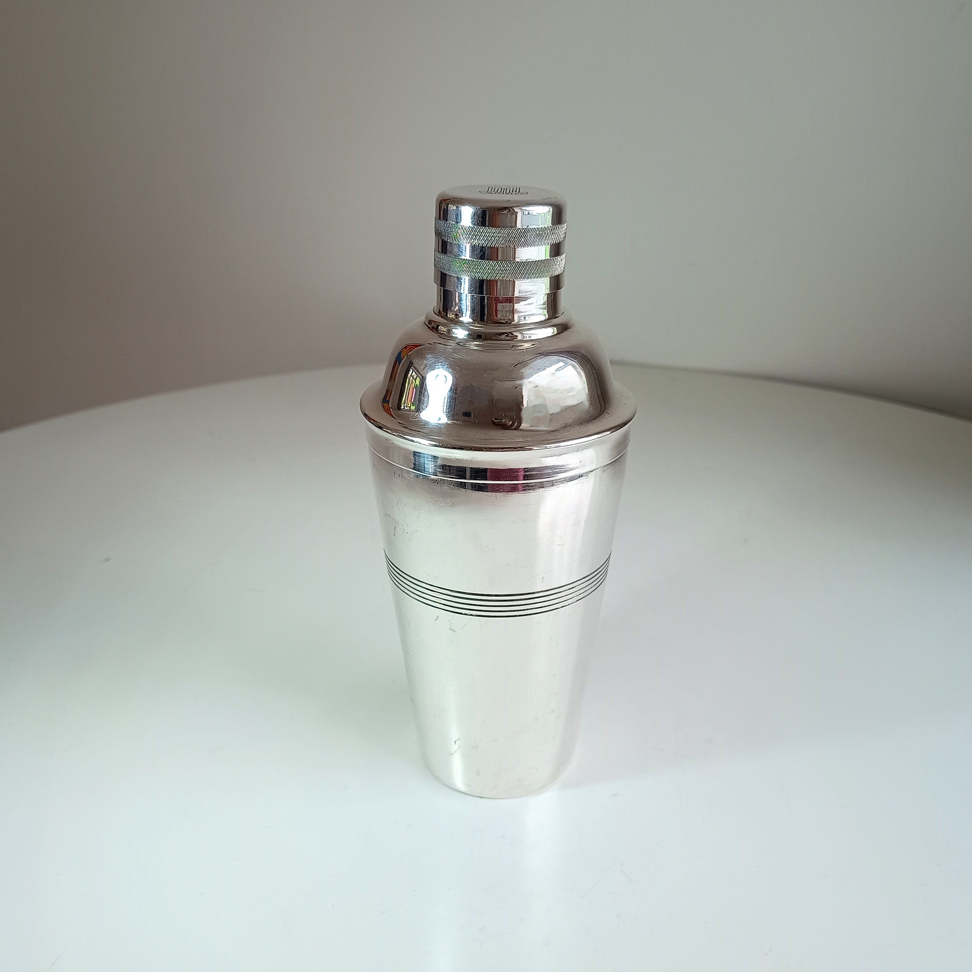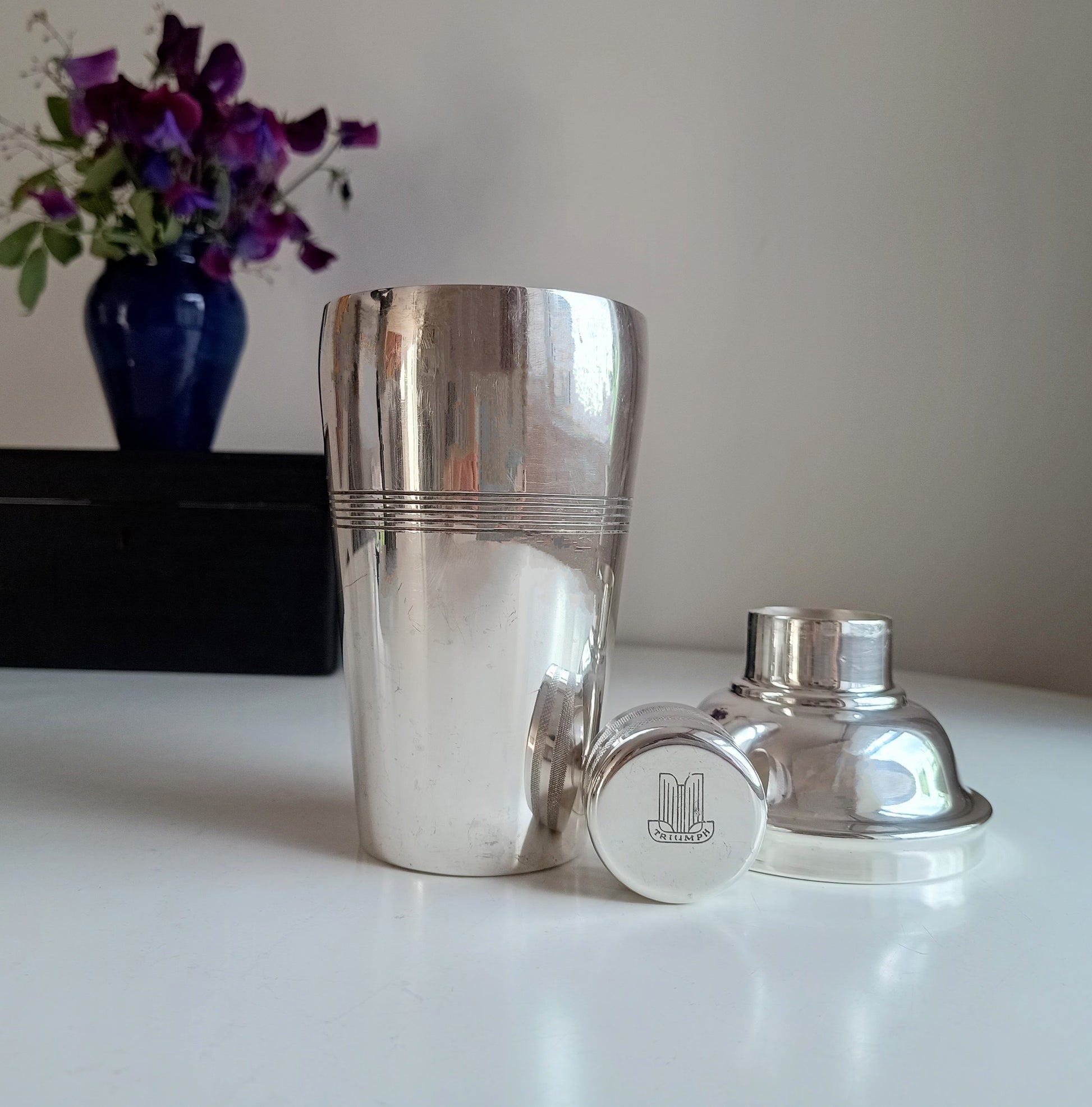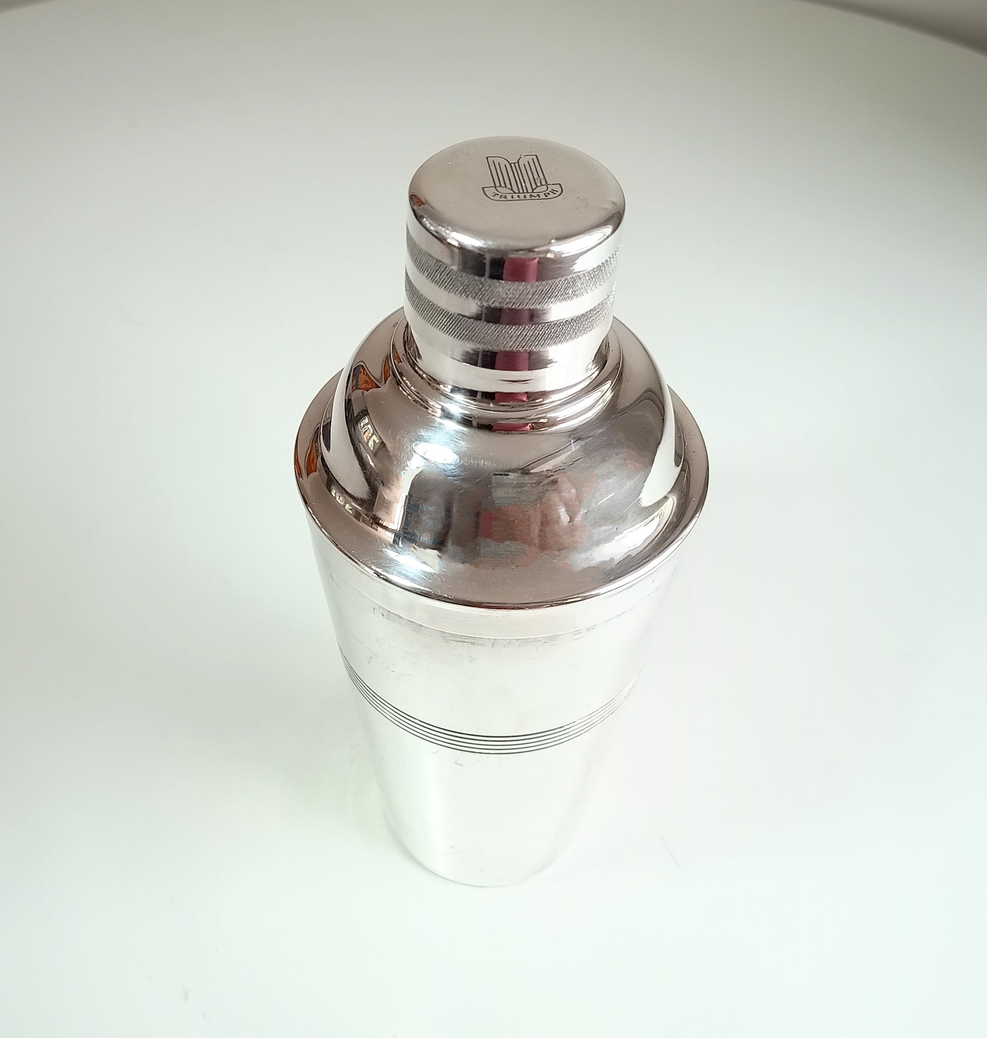 Vintage Art Deco Style Engine Turned English Silver Plate Cocktail Shaker By J Sanderson & Son for Triumph TR Sports Car With Iconic Logo