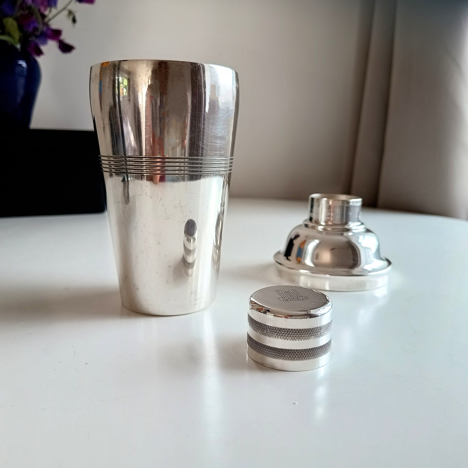 Fabulous High Quality Art Deco Style Silver Plated Three Part Cocktail Shaker manufactured by J Sanderson for the first Triumph TR Sports Car as shown room merchandise.