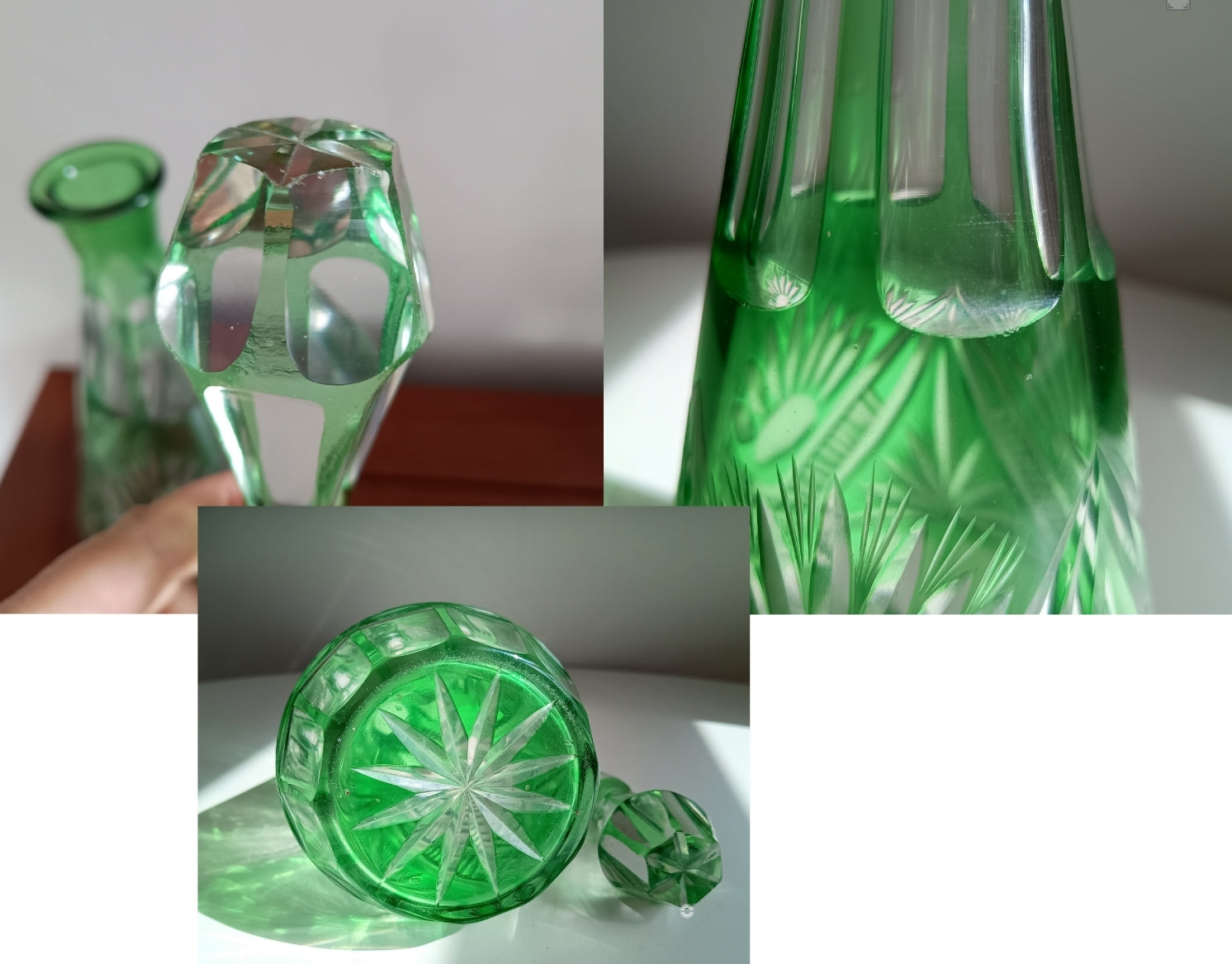 Vintage tall, intricately cut, class Liqueur bottle or carafe with heavy tall stopper in Emerald Green cut-to-clear colour.